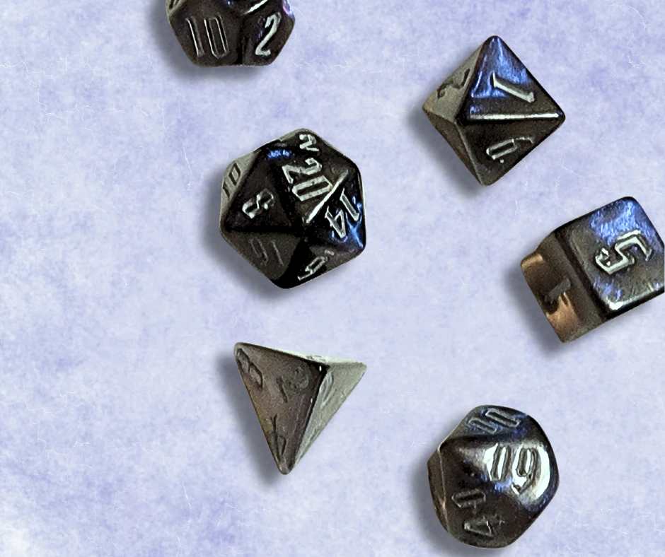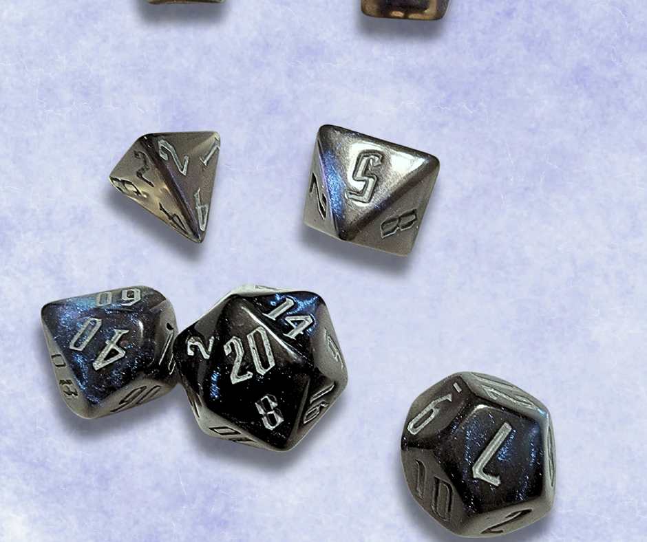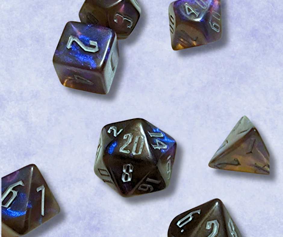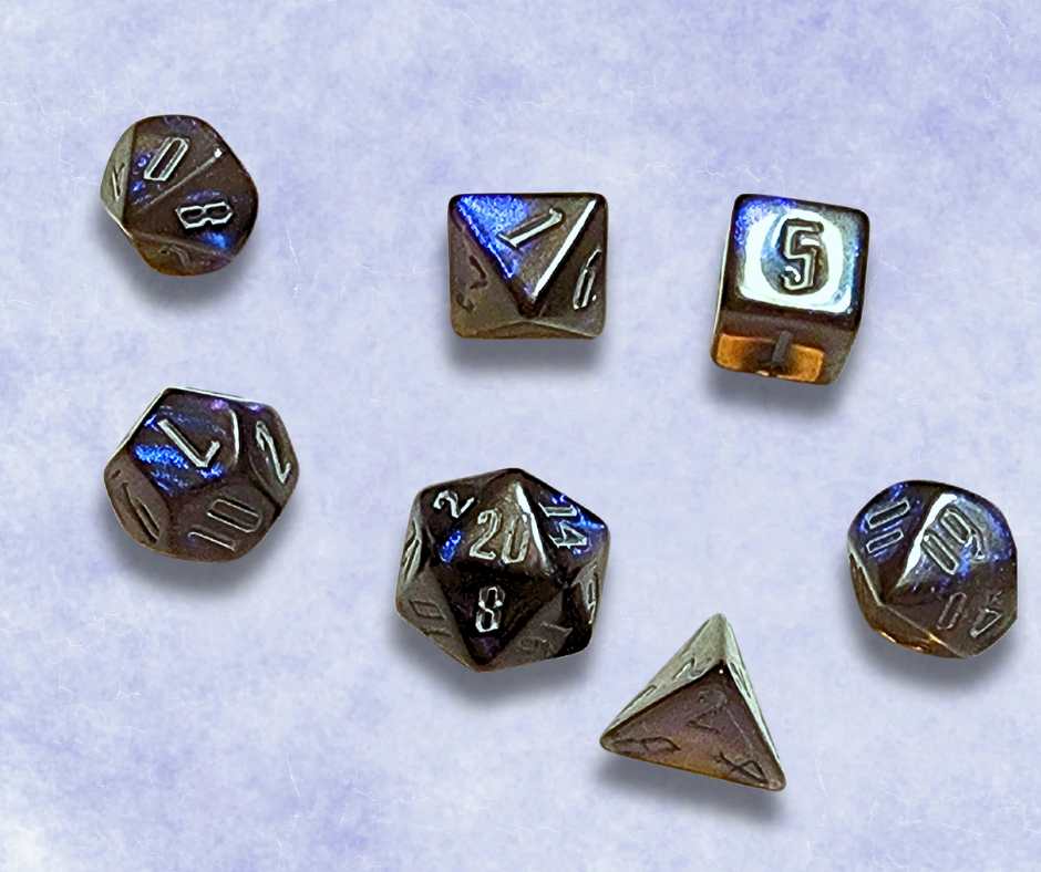 A 7 piece set of transparent grey with blueish purple glitter polyhederal dice that will help keep the dream alive.