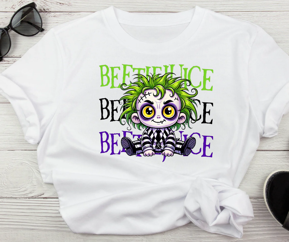 Get in the Halloween spirit with our Baby Beetlejuice Tshirt! This fun and adorable tshirt will have you looking spooky and cute all at the same time. Perfect for the upcoming spooky season, this tshirt is a must-have for any Beetlejuice fan.