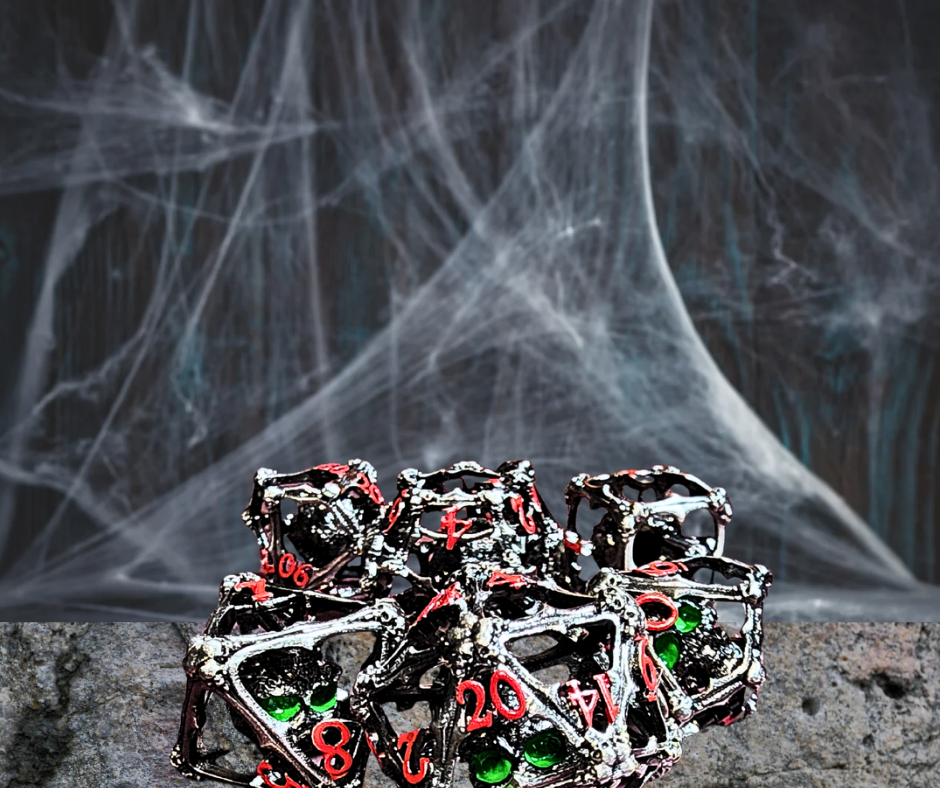 Experience the thrill of taking risks with our Death's Doom Hollow Metal Polyhederal Dice Set. Made of durable metal, each die is intricately designed with a hollow skull and mesmerizing green eyes. Roll with confidence as the bold red numbers enhance your gameplay. Take on any challenge with these daring dice!