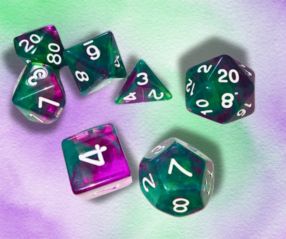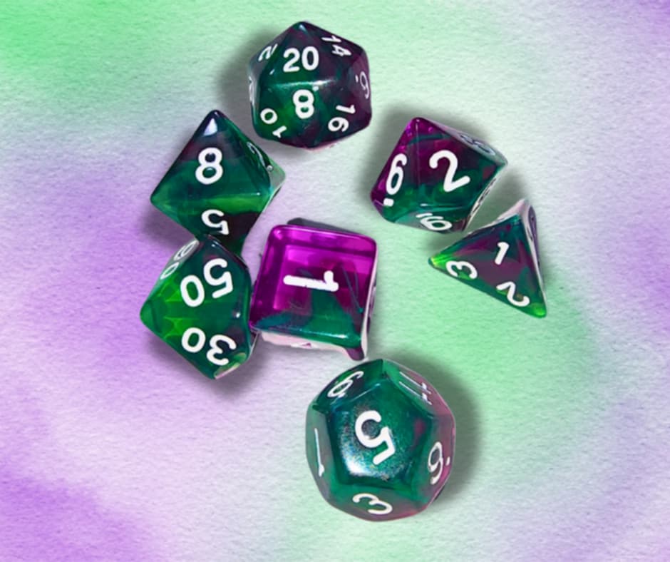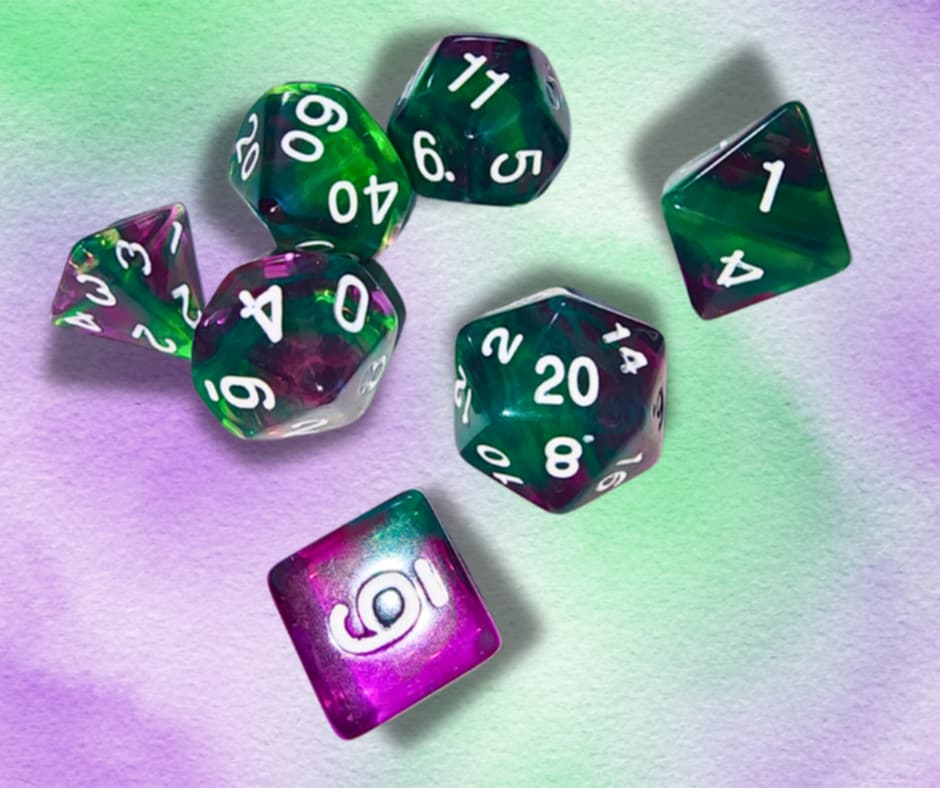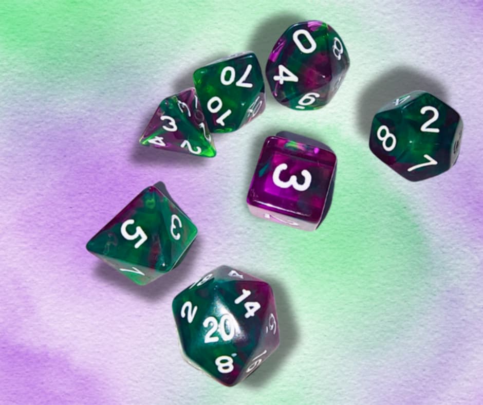 A 7 piece set of green and purple polyhederal dice with white numbering that will give you something to smile about.