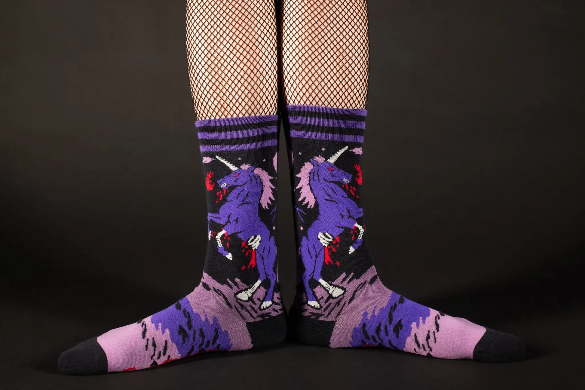 Based off of our very own Blucifer here in Denver - the giant statue of a death horse at the airport that killed it's creator. Except we made him even more evil by giving him a serrated horn and a not-give-a-fuck attitude. Seriously, he's pissed. Better buy these socks before you get attacked.