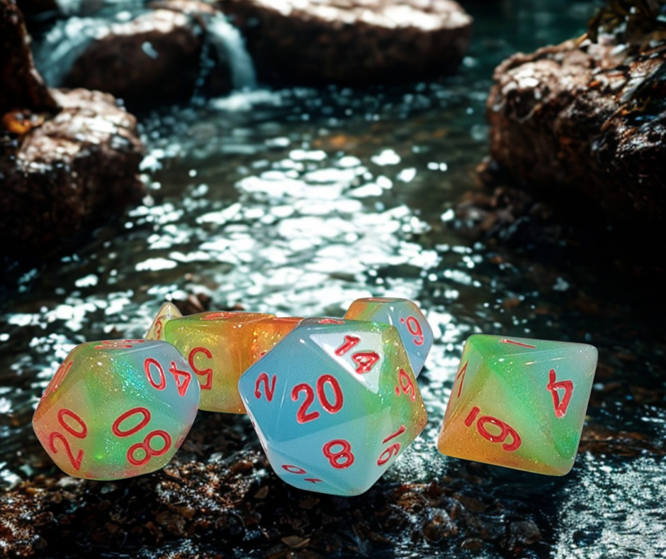 A 7 piece set of opaque blue, glitter green and glitter orange polyhederal dice that will run over you.