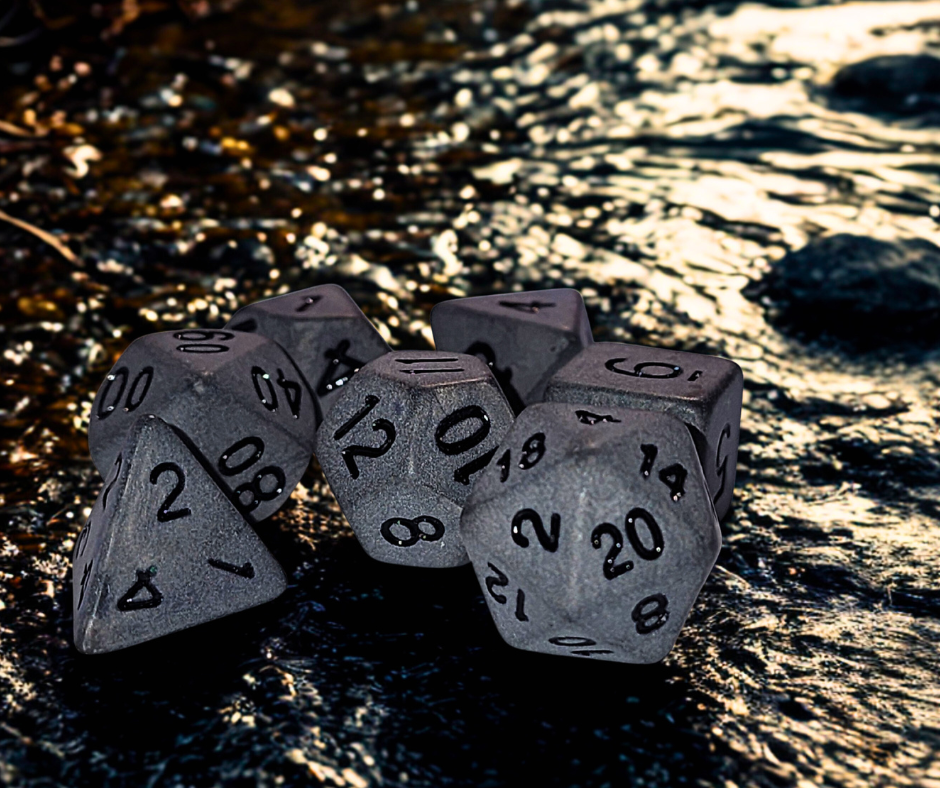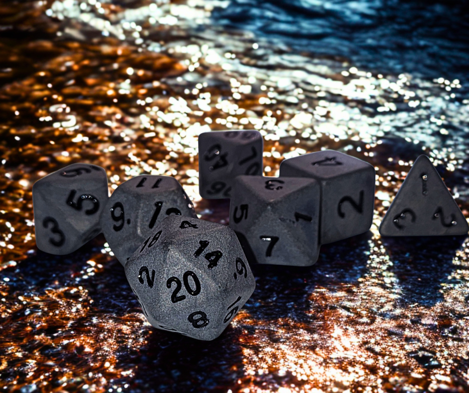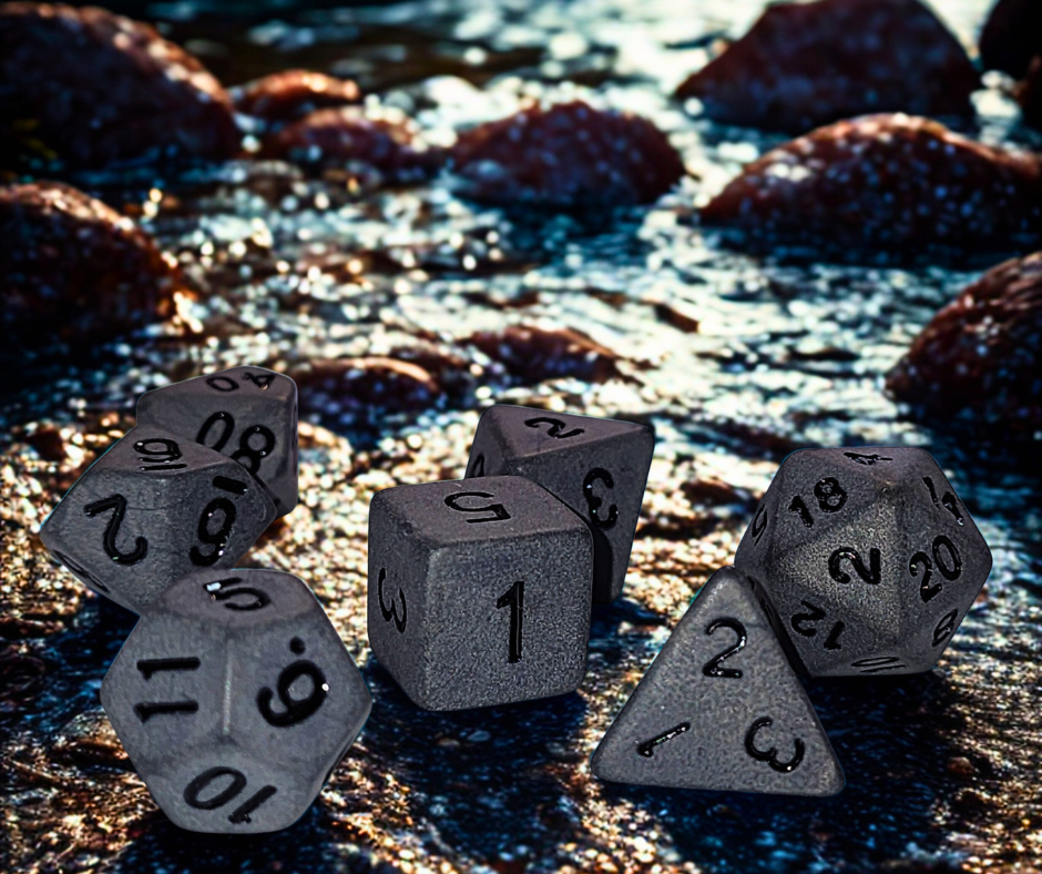 A 7 piece set of flat gray polyhederal dice with black numbers that
