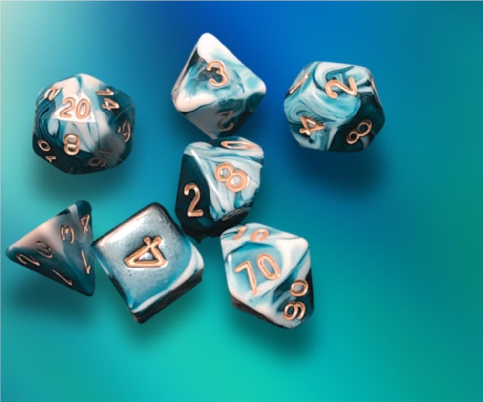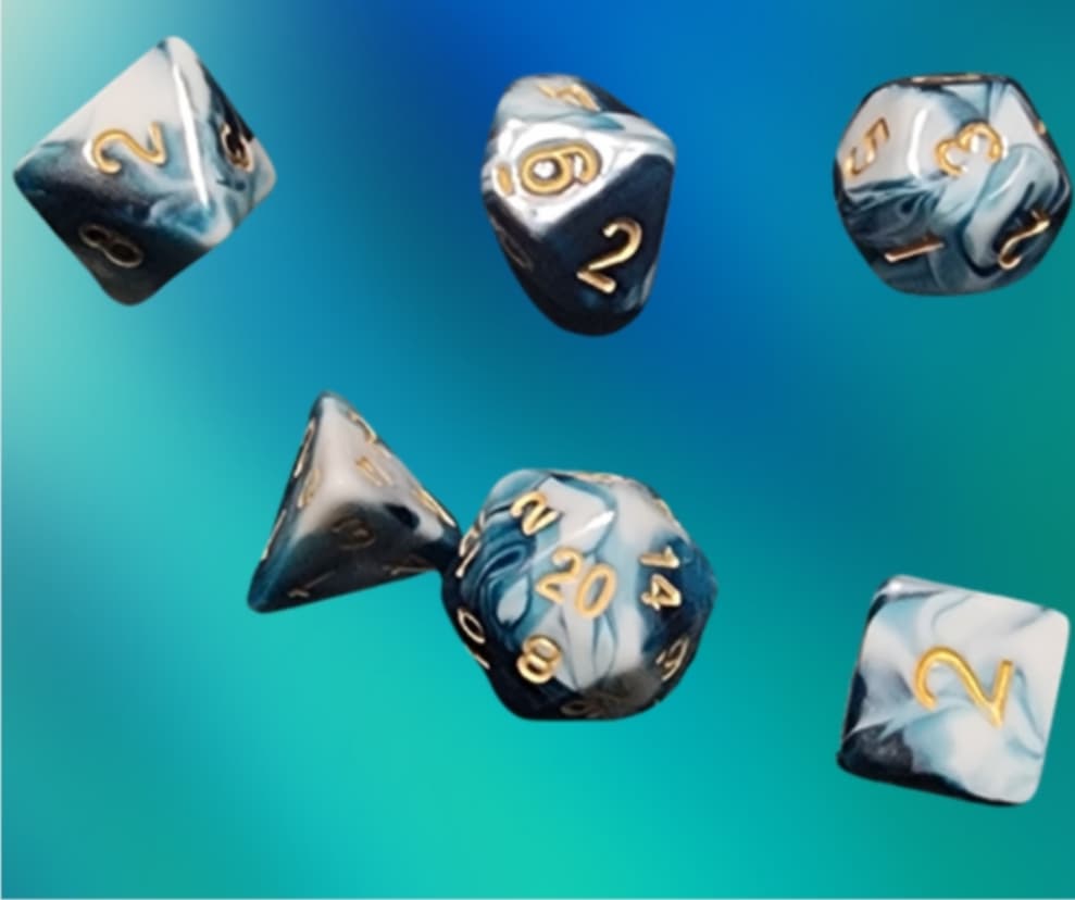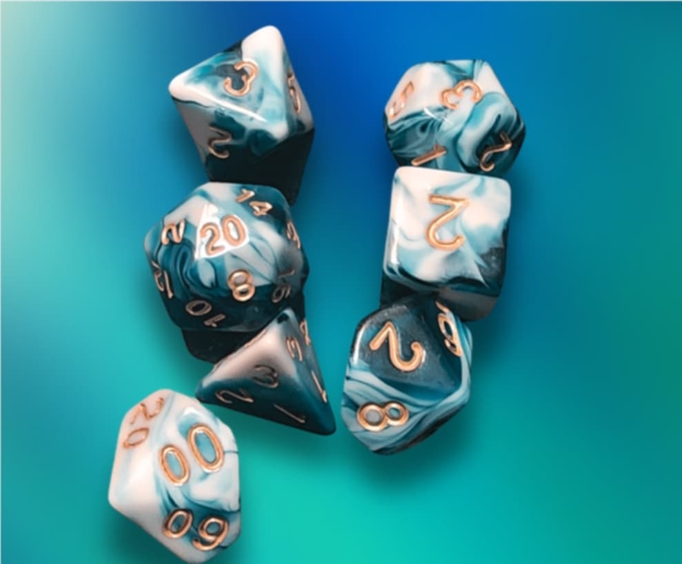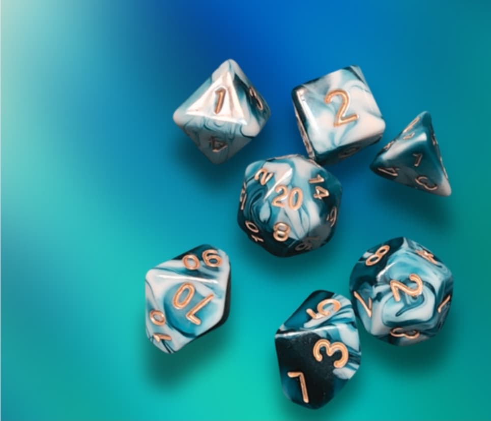 A 7 piece set of white and bluegreen polyhederal dice where the sky is the limit.