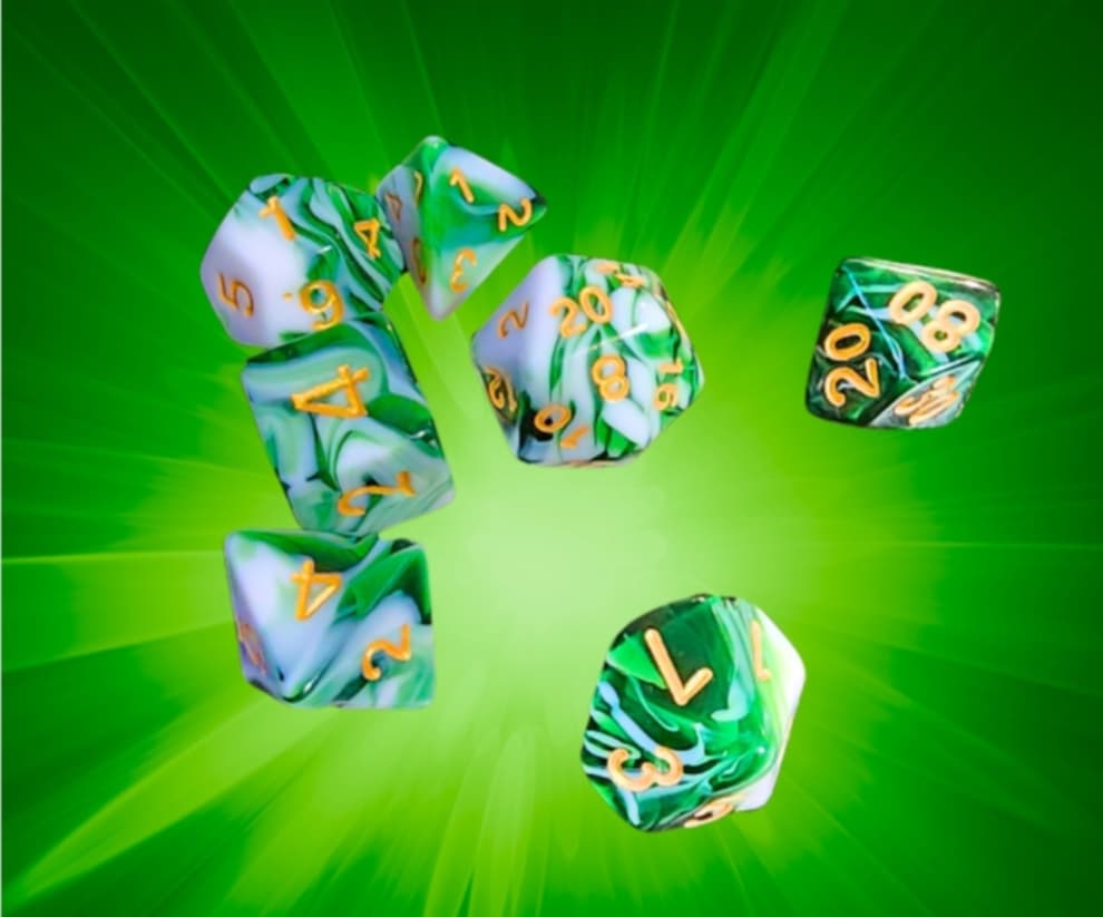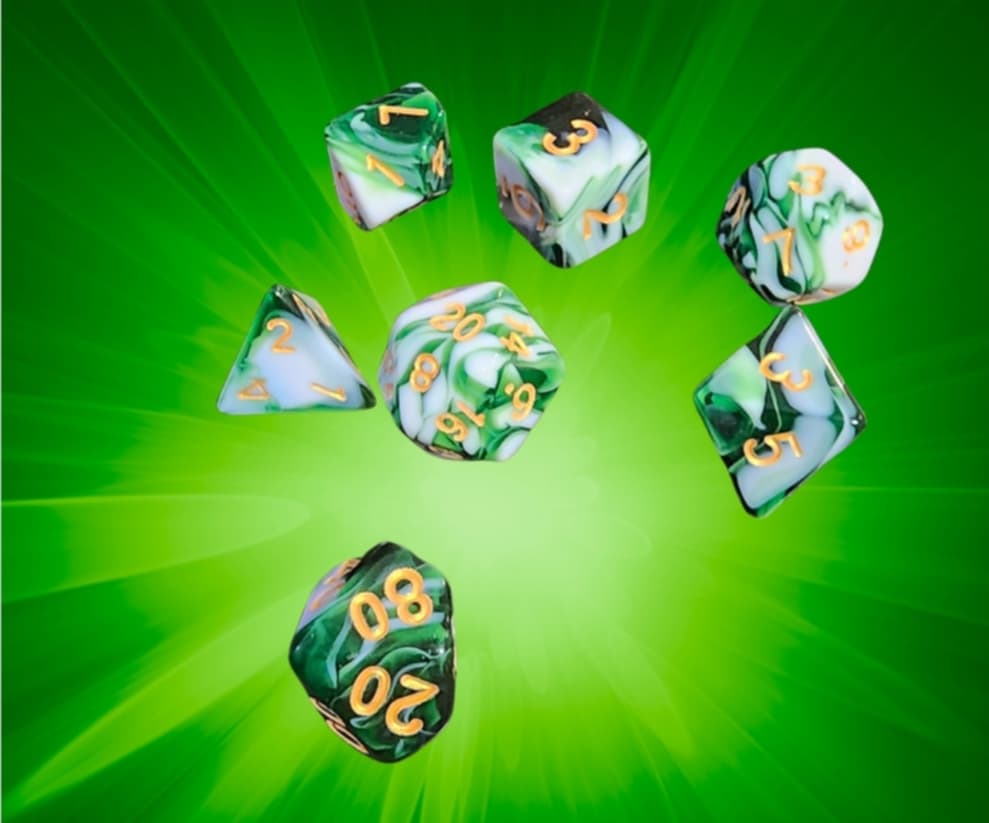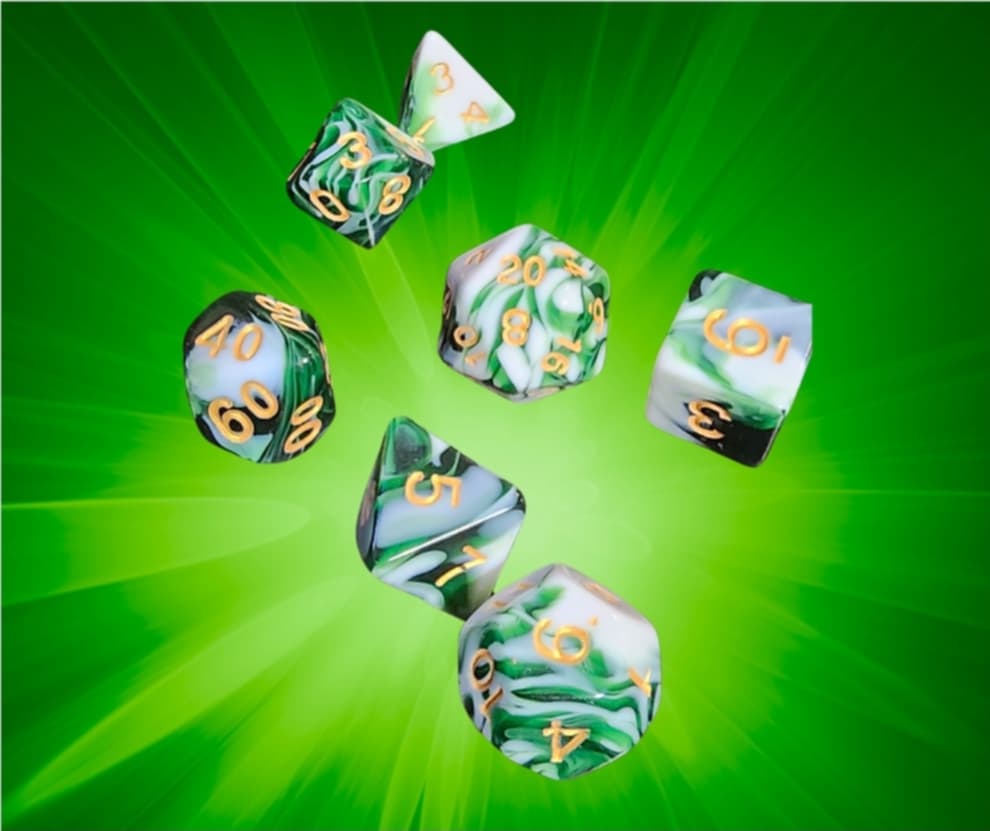 A 7 piece set of transparent green and opaque white polyhederal dice that may be what you have been wishing for.