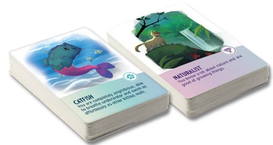 A deck of 108 Talent, Flaw, and Magical Power cards, designed to speed up character creation and serve as a quick reference during play for your kitty's powers!