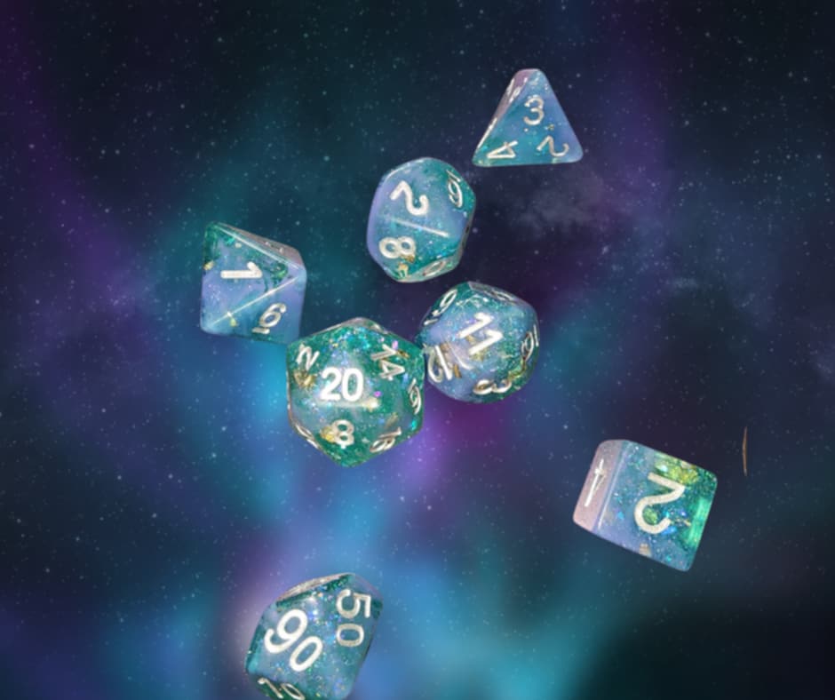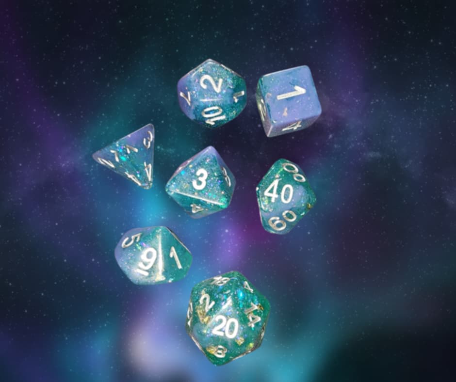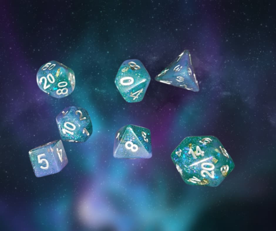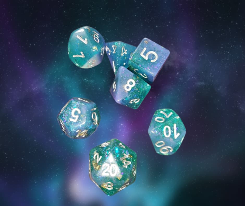 A 7 piece set of opaque baby blue and translucent teal with chunky prismatic glitter polyhedral dice with white numbers that will definitely be a bright spot in your dice collection.