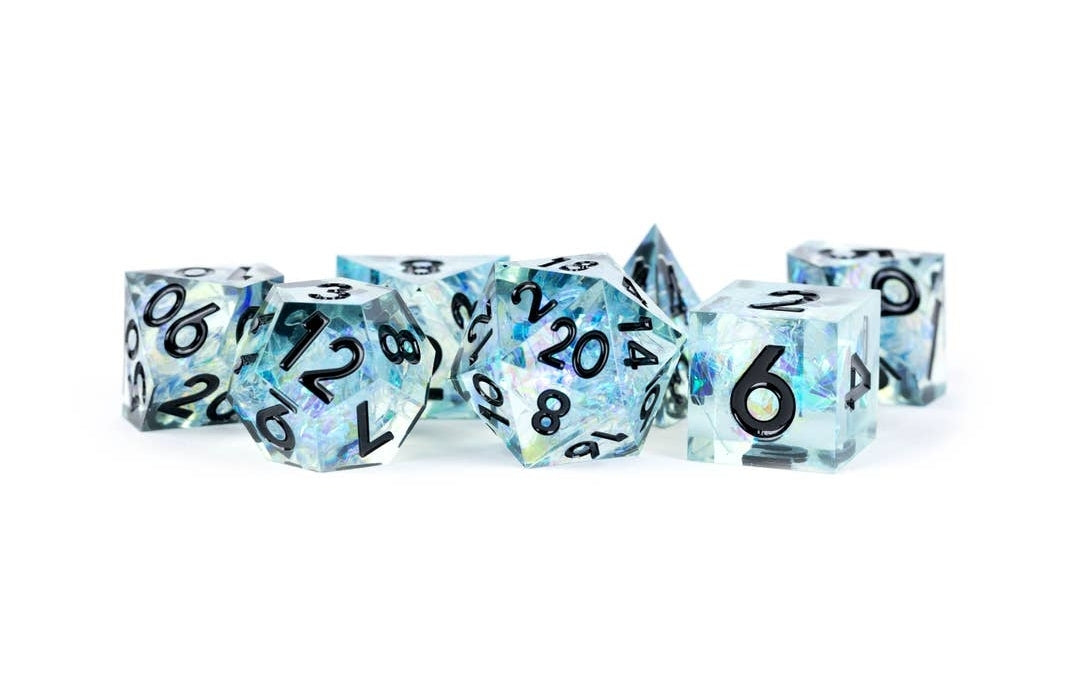 Our handcrafted, sharp edge resin dice are hand polished to keep their beautiful sharp edges. These dice are infused with beautiful glitter flakes. Because these dice are not tumbled, they are more precise than mass produced plastic dice. It’s hard to beat the value in our resin dice sets. Each 16mm polyhedral set comes with 7 dice (d4, d6, d8, d10, d10 (00-90), d12, and d20).
