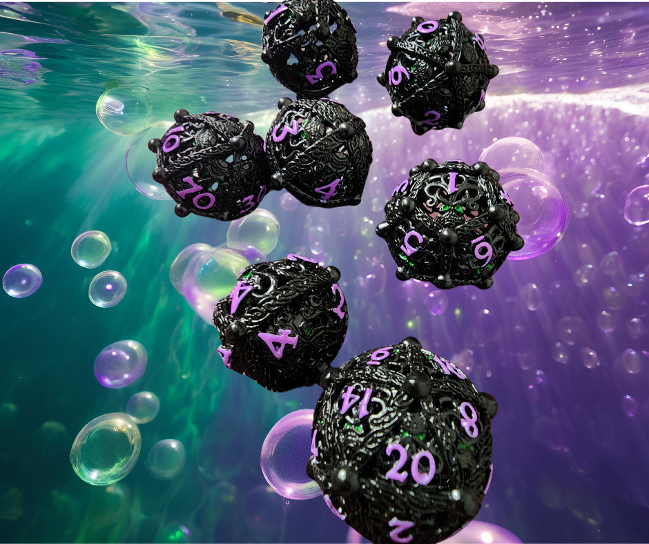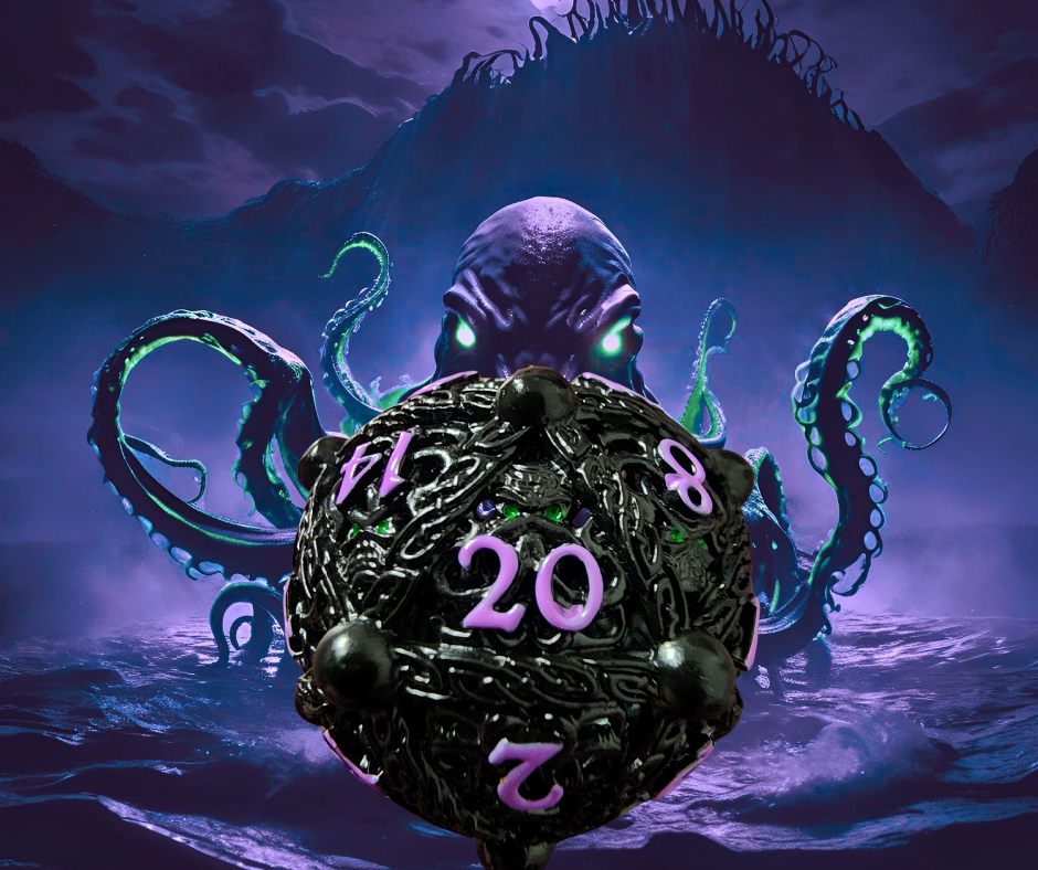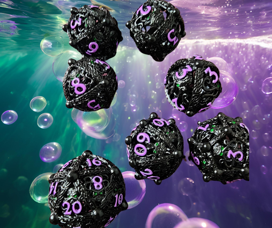 Unleash your inner gamer with Meteoric Malevolence! Our hollow metal dice feature a sinister Cthulhu design in black, complete with green eyes and a tinkling sound when rolled. The purple numbers stand out from the black back ground and are easy to read. Class up your gaming table and intimidate your opponents in style!