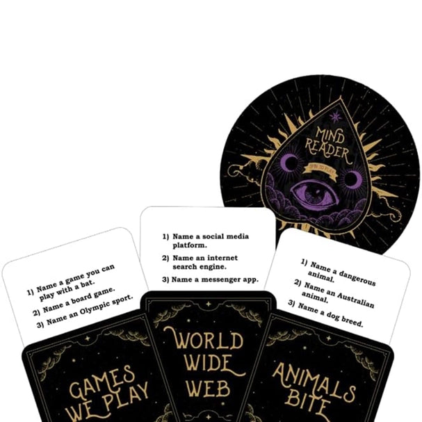 MIND READER is a fun-filled game that’s all about reading minds and predicting answers. Inspired by fortune telling, tarot cards, and Ouija boards, Mind Reader is the Psychic Party Game full of fun for the whole family!
