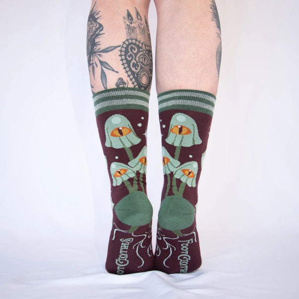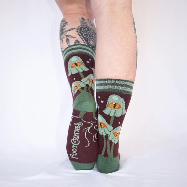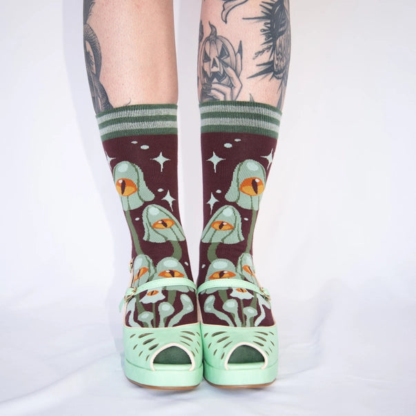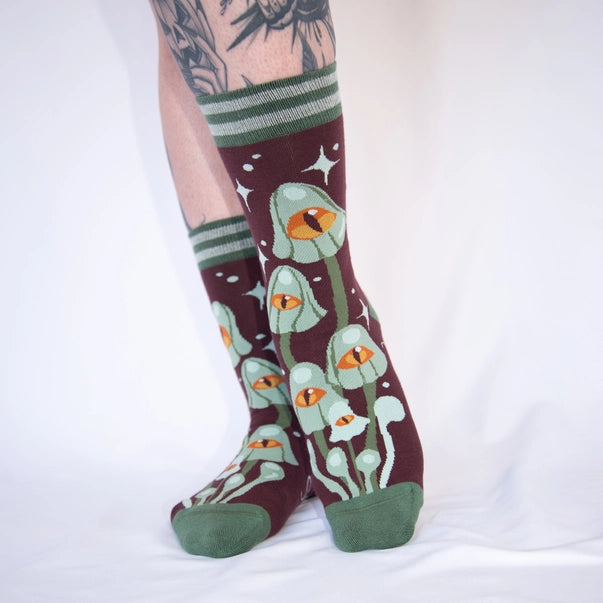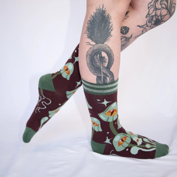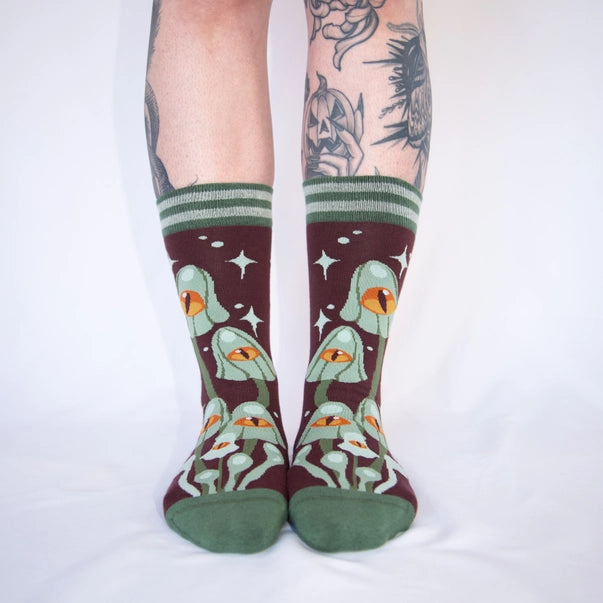 Discard the ordinary and embrace the extraordinary magic of these mushrooms. They'll keep an eye (or several) on you at all times to ensure your day is as mystical as possible. - Combed Cotton/Nylon/Spandex - Our socks do not contain polyester - DOUBLE TERRY in the heel and toe area - High Thread Count - Like fancy sheets for your feets - Greater levels of details, design is flipped on opposite foot - 40 Gram Socks with Smoooooth Seams - Sewn to be better than your average sock - not paper thin - Provides breathe-ability for year round wear - No uncomfortable bumps in the toe area - One Size Fits Most Humans Adult Sizes 5-13