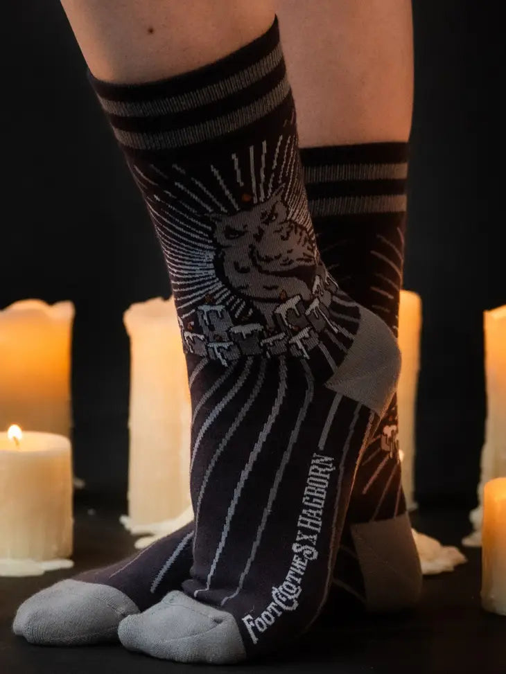 Our first collaboration - Hagborn design trade is woman/minority owned company specializing in occult, witchy, and anachronistic designs. Naturally, we became friends and decided to make an owl sock because that's what friends do. They make owl socks.