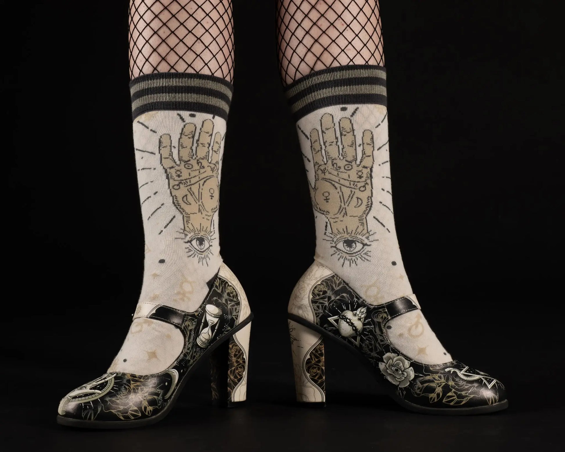 Palmistry, also referred to as chiromancy, is a longstanding staple of occult practices. Is it weird to wear pictures of your hands on your feet? I don't know. Maybe. But this change in your fate line says the add to cart button is in your future.