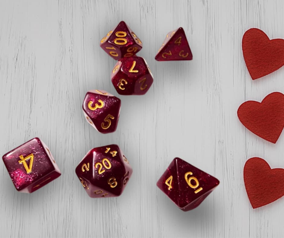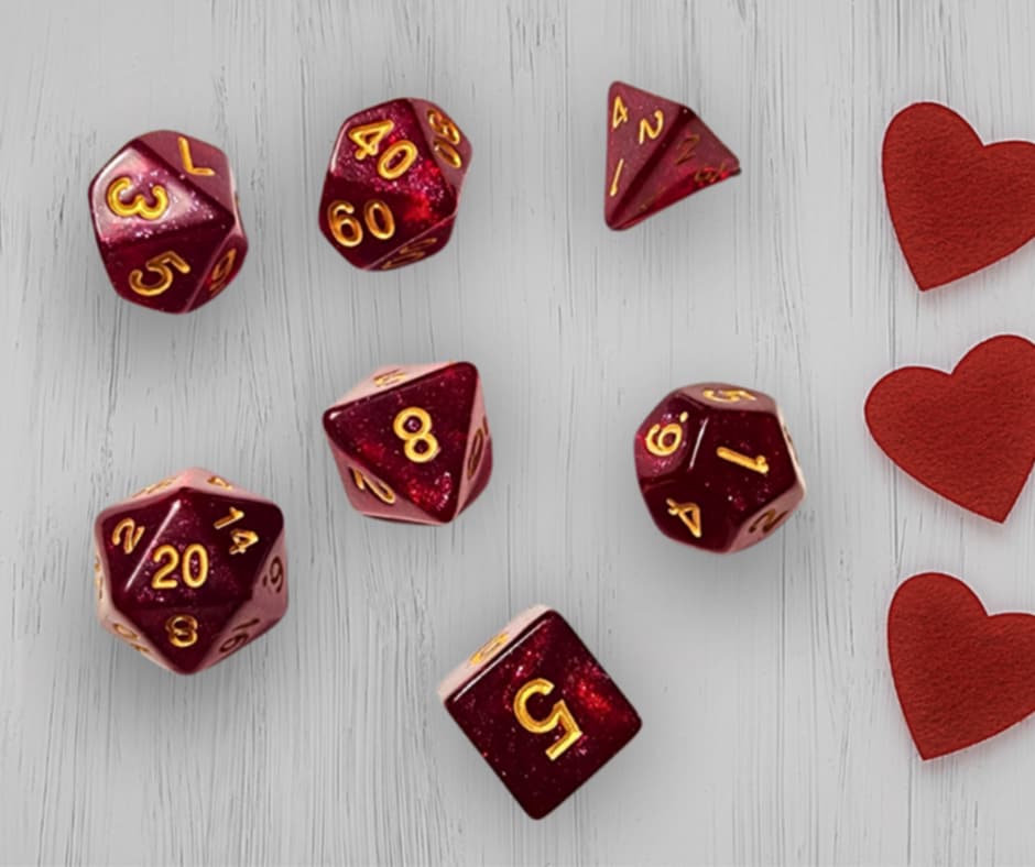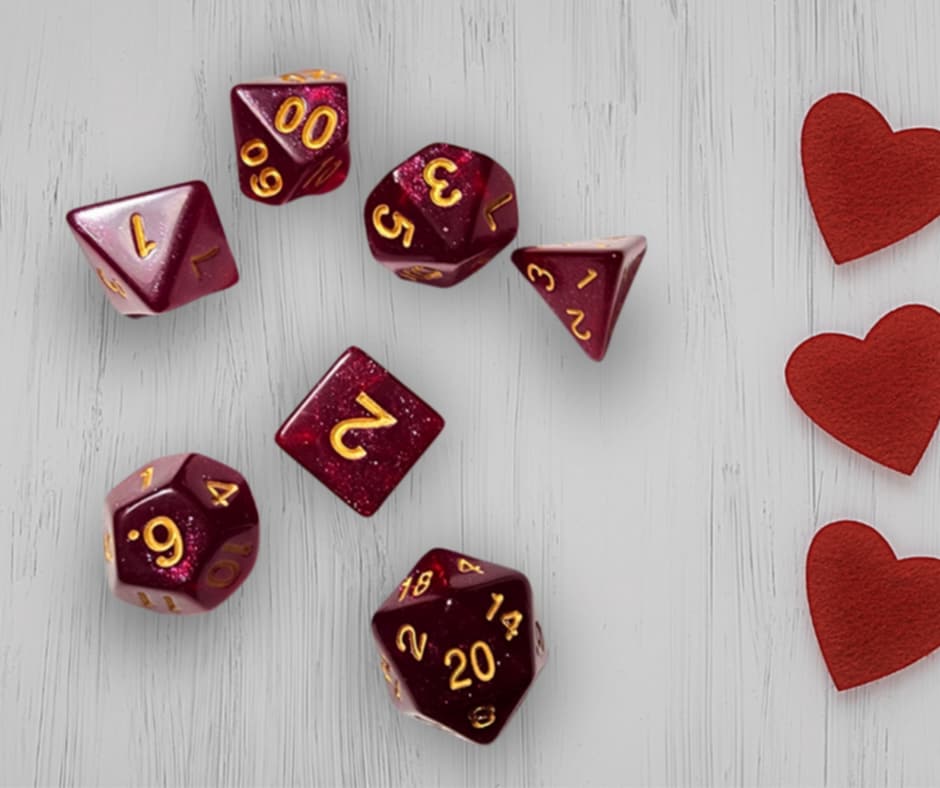 A 7 piece set of red glitter polyhederal dice with that will not break your heart.