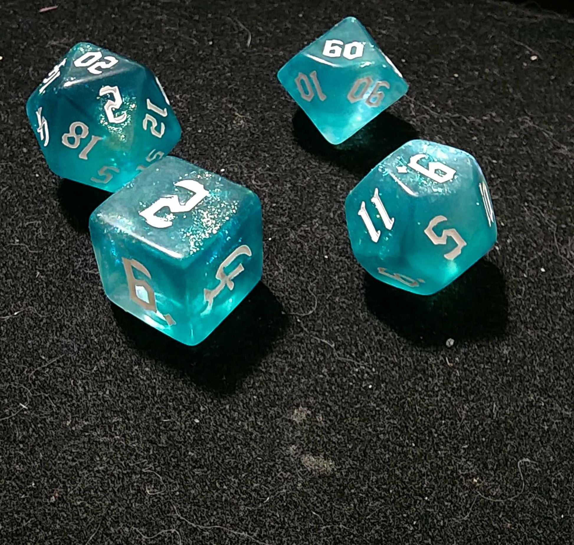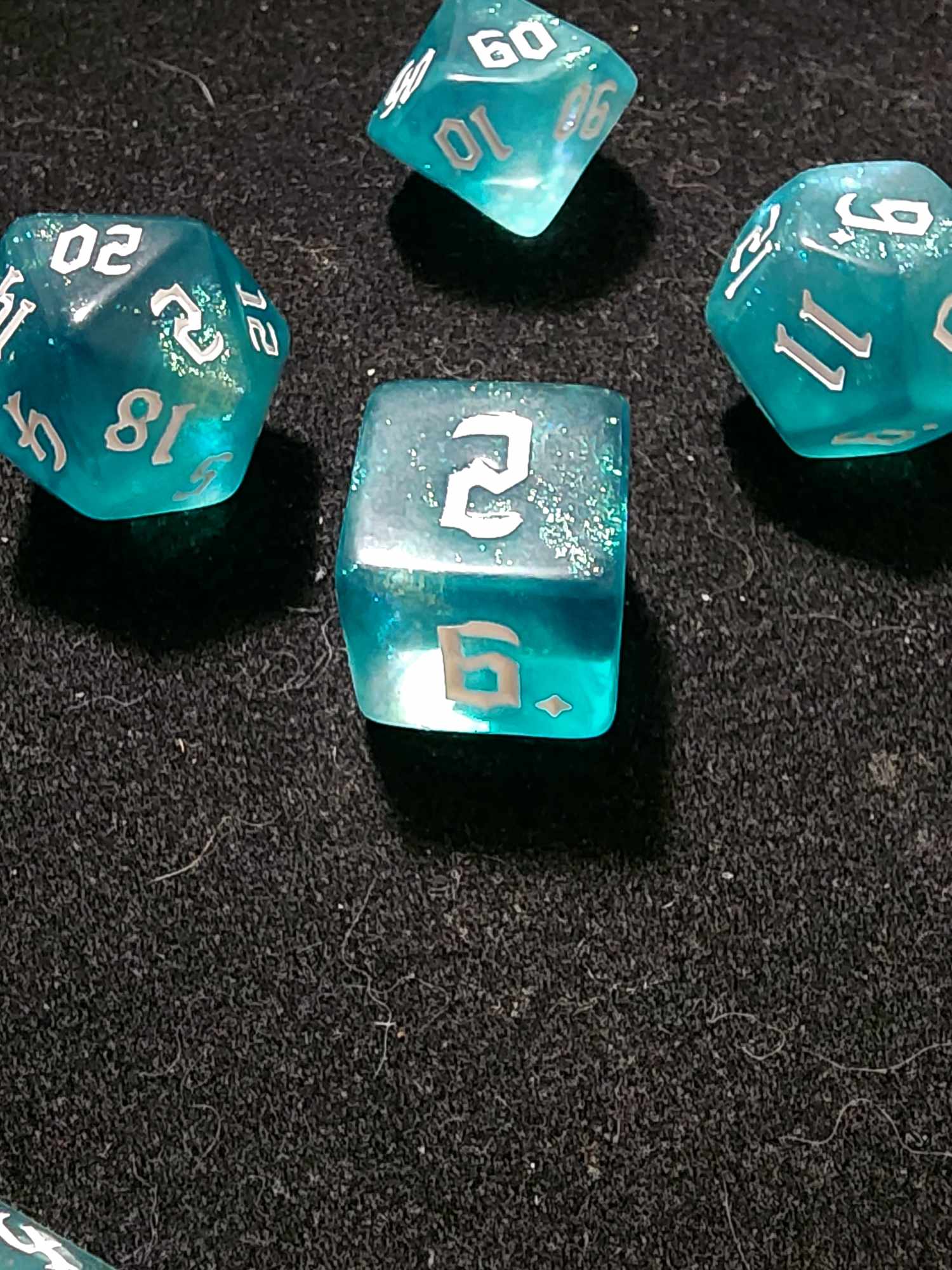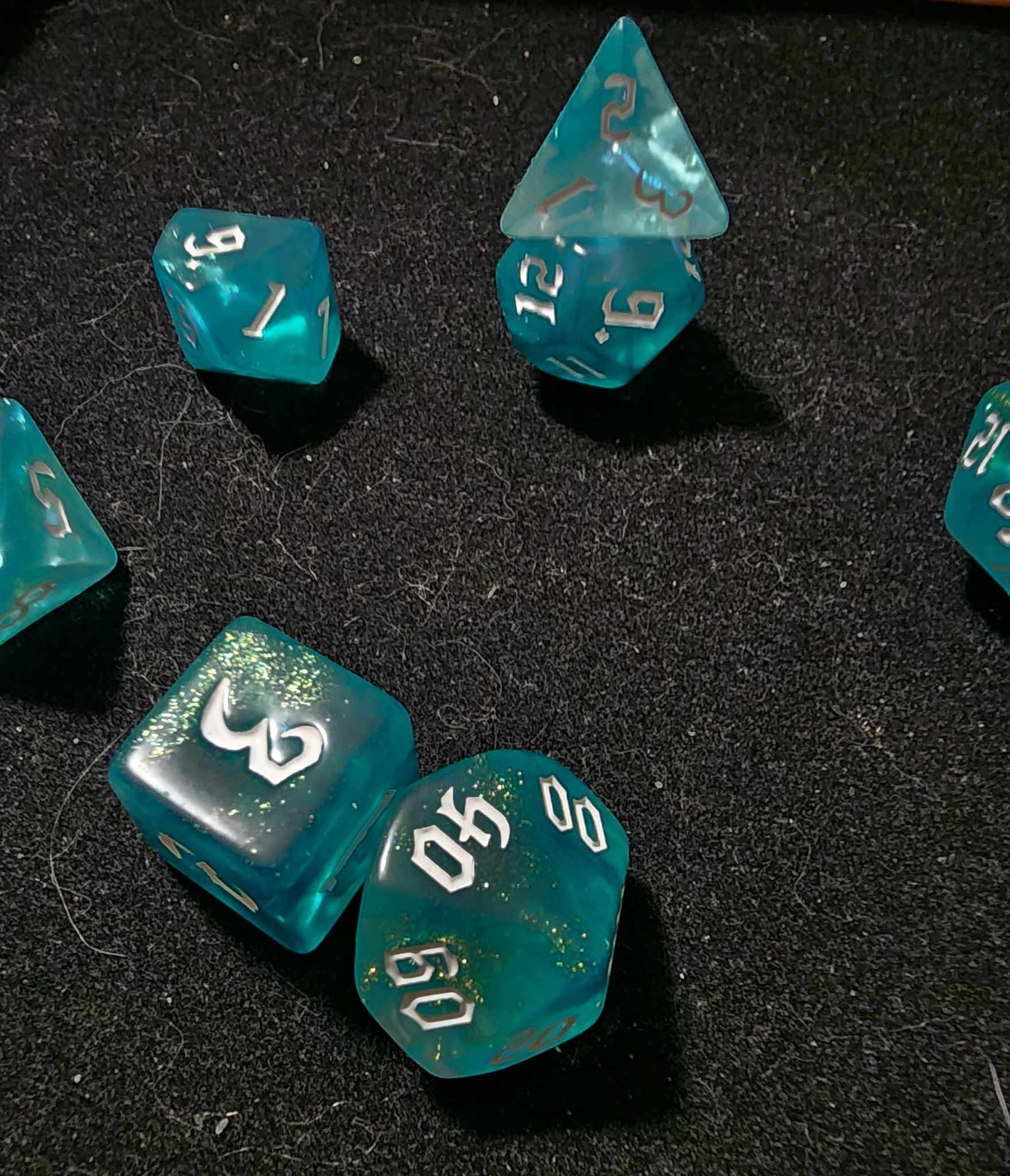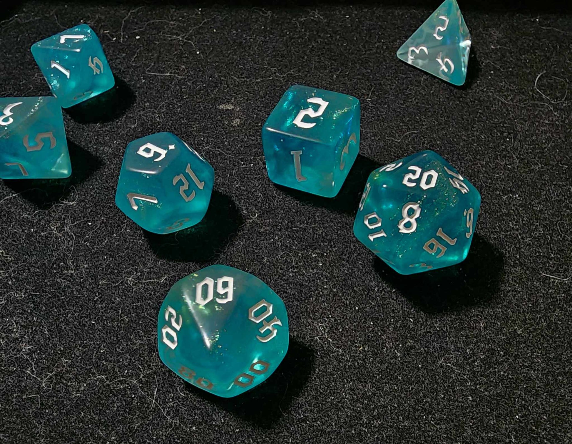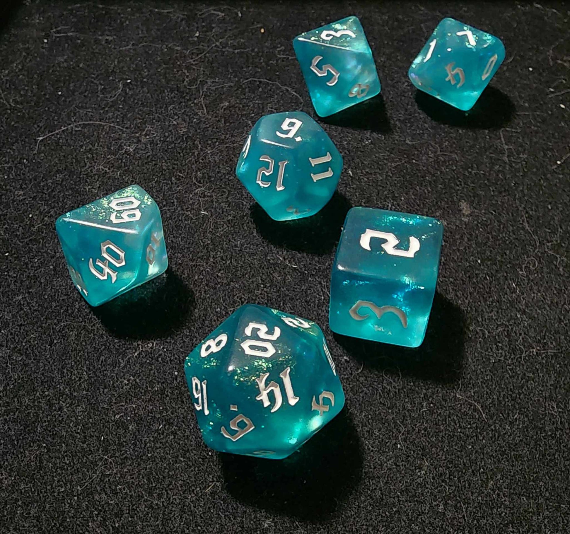 A 7 piece set of blue and turquoise polyhederal dice that will you won't be able to resist.