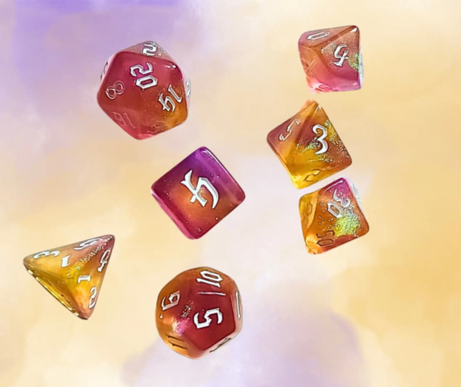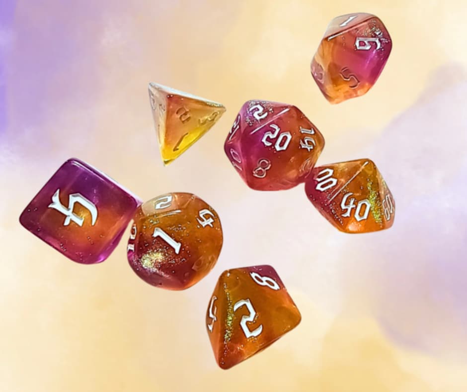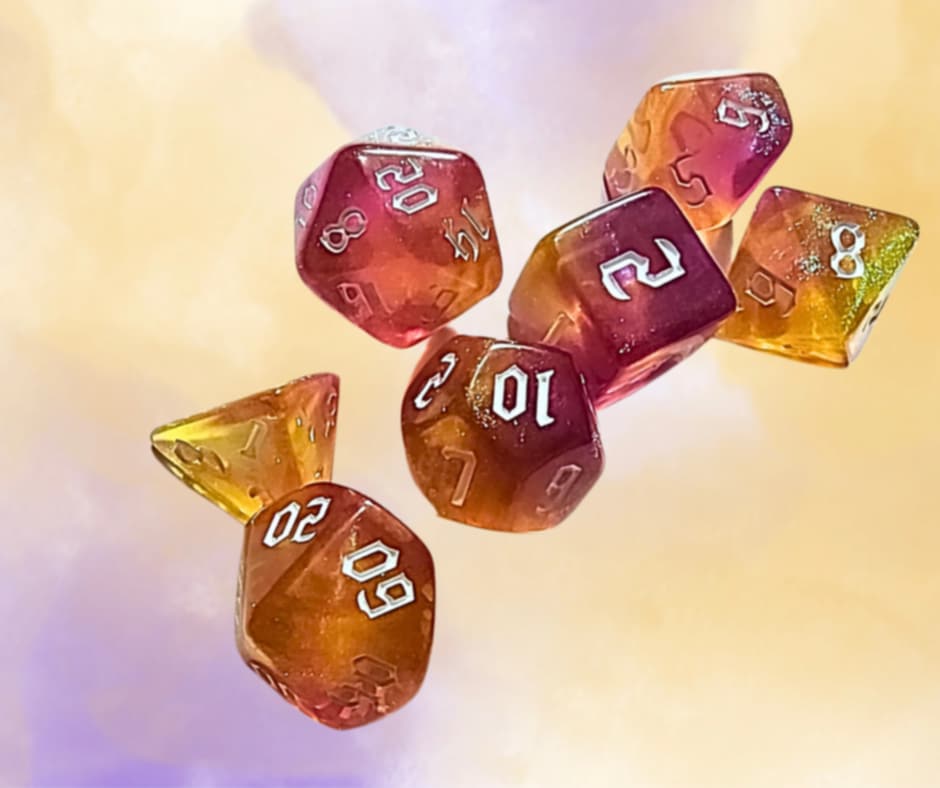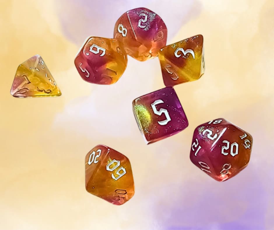 A 7 piece set of yellow and purple polyhederal dice that will warm your spirit.