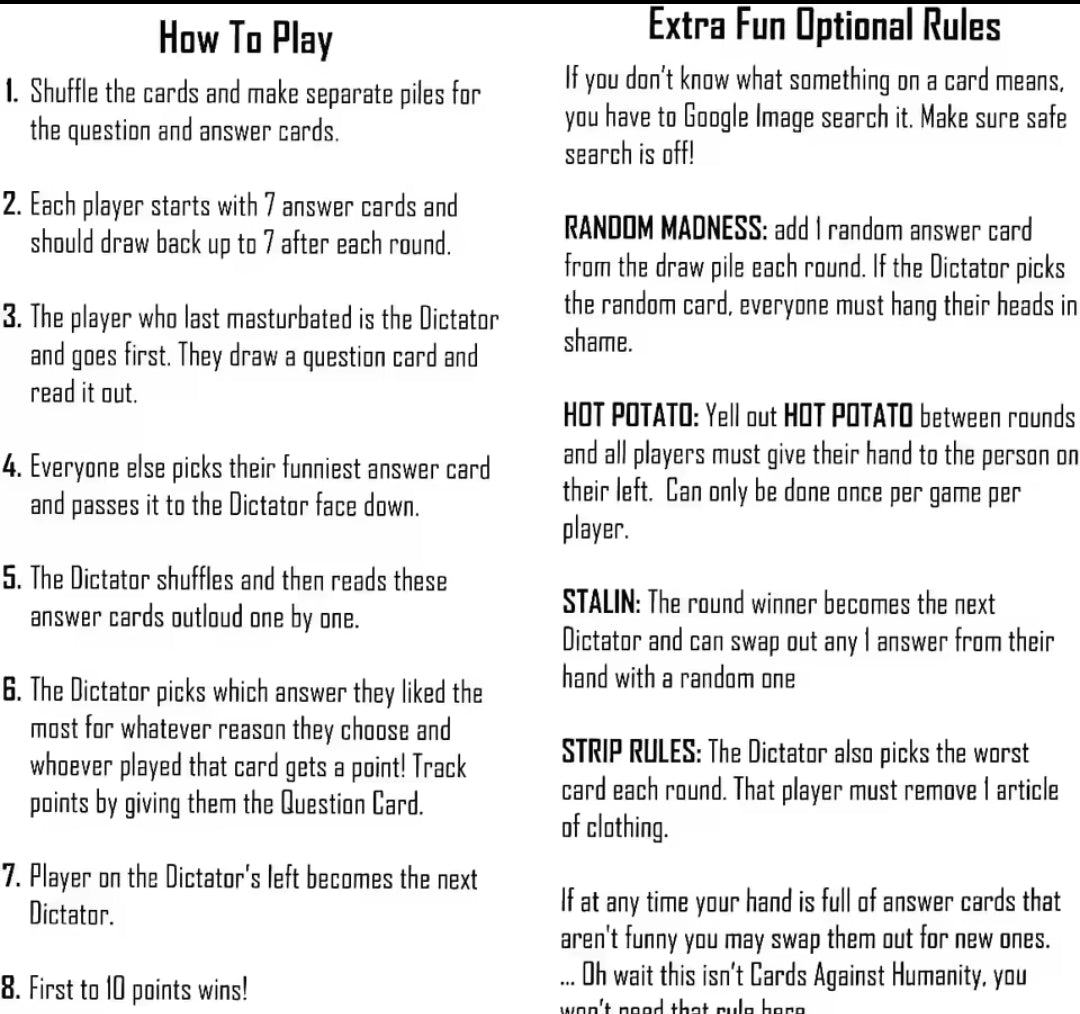 - The age of the players should be at least 17 years of age (i.e 17+).Due to its wildness and the awkward or‘inappropriate'questions the game has, it must be played by adult players only.