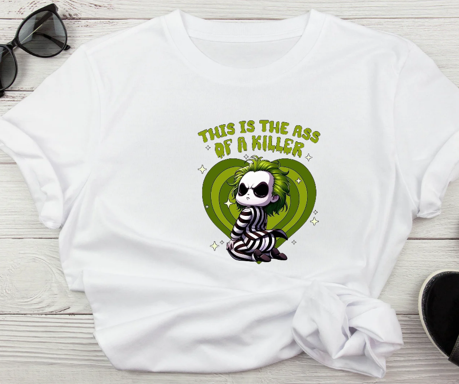 Get ready to turn heads with the This is the Ass of a Killer Tshirt! This sassy and playful tee will have everyone saying your name like Beetlejuice. It's the perfect way to show off your playful and sexy side. Don't miss out on the chance to rock this tshirt. Do you have what it takes?