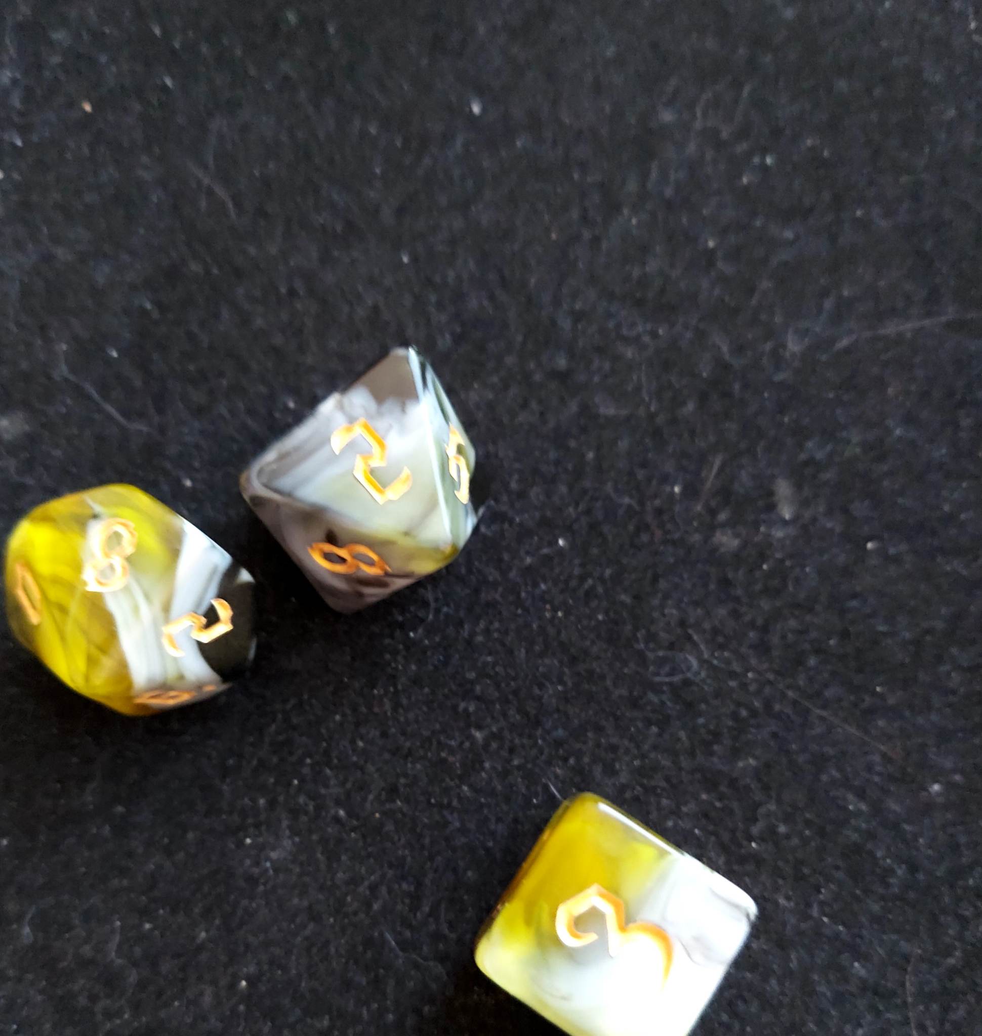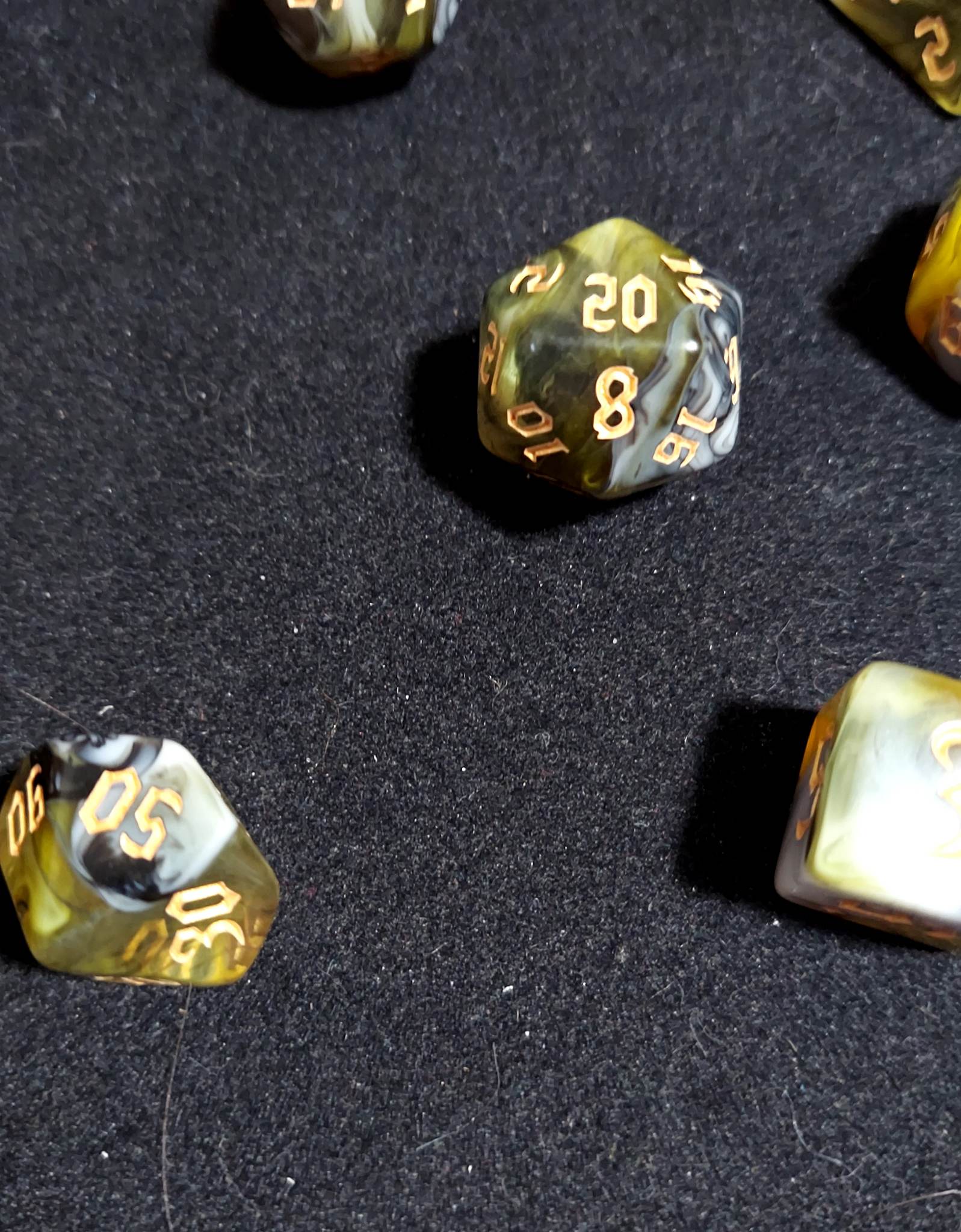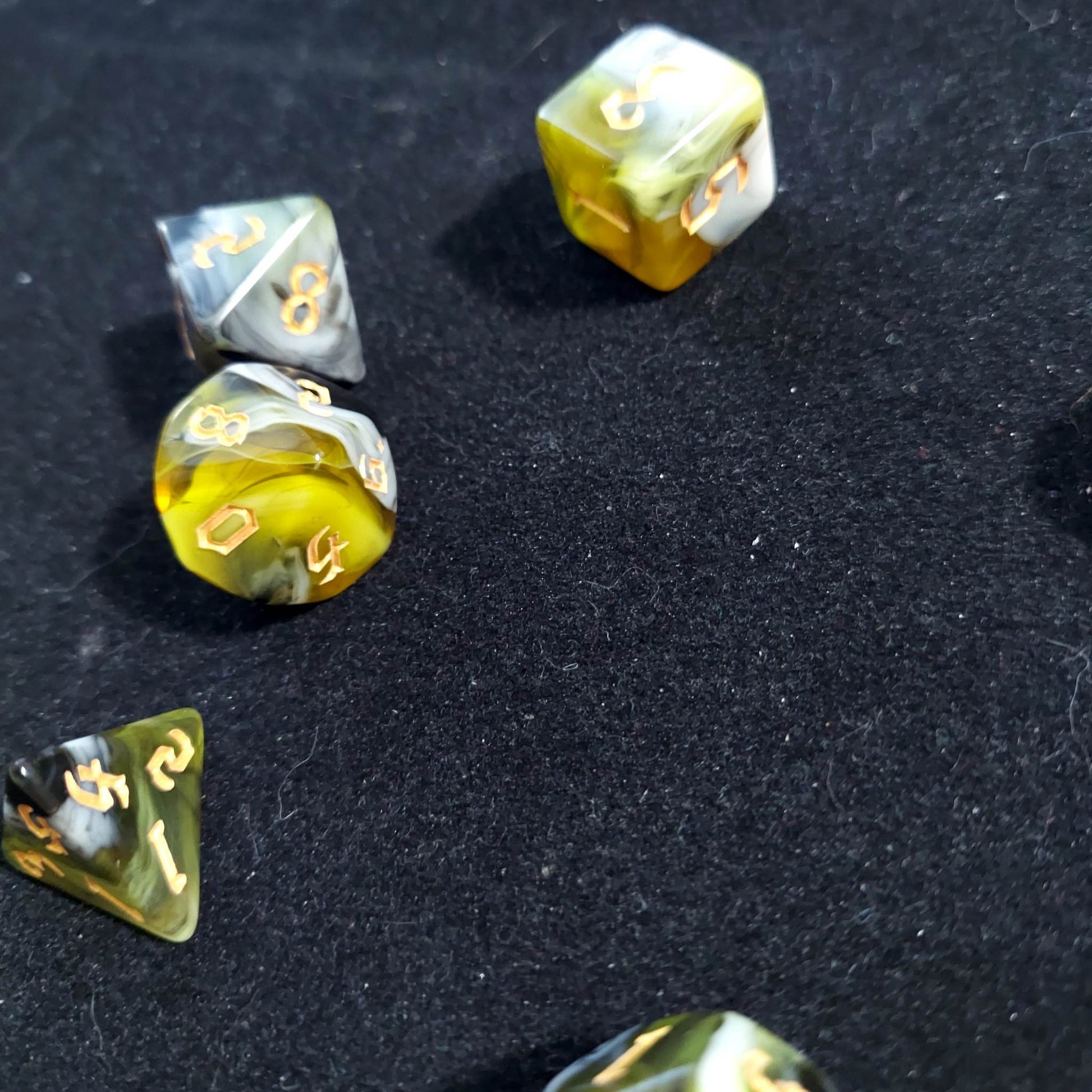 A 7 piece set of yellow, gray and black polyhederal dice that will make you won't be able to hide from your friends.