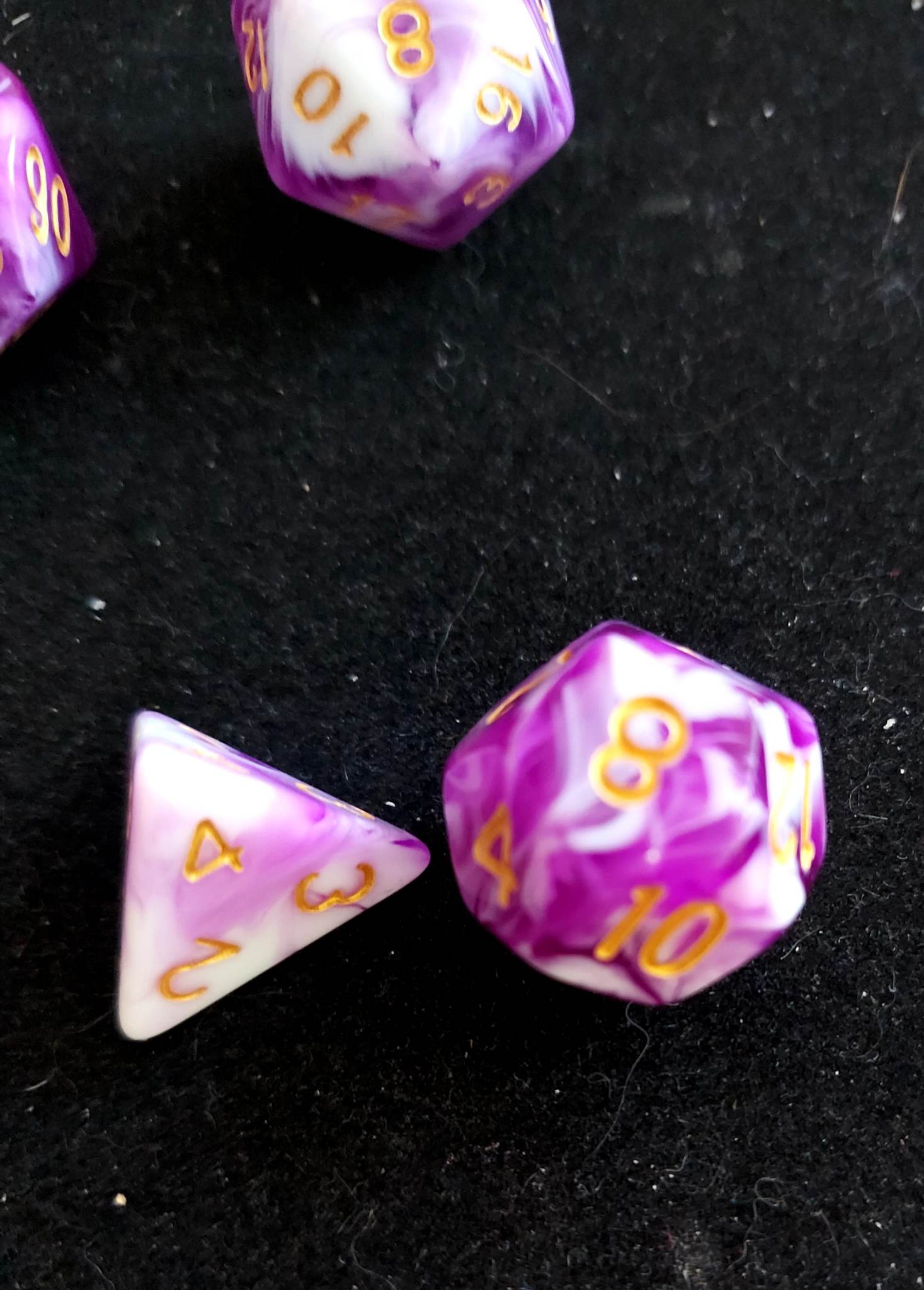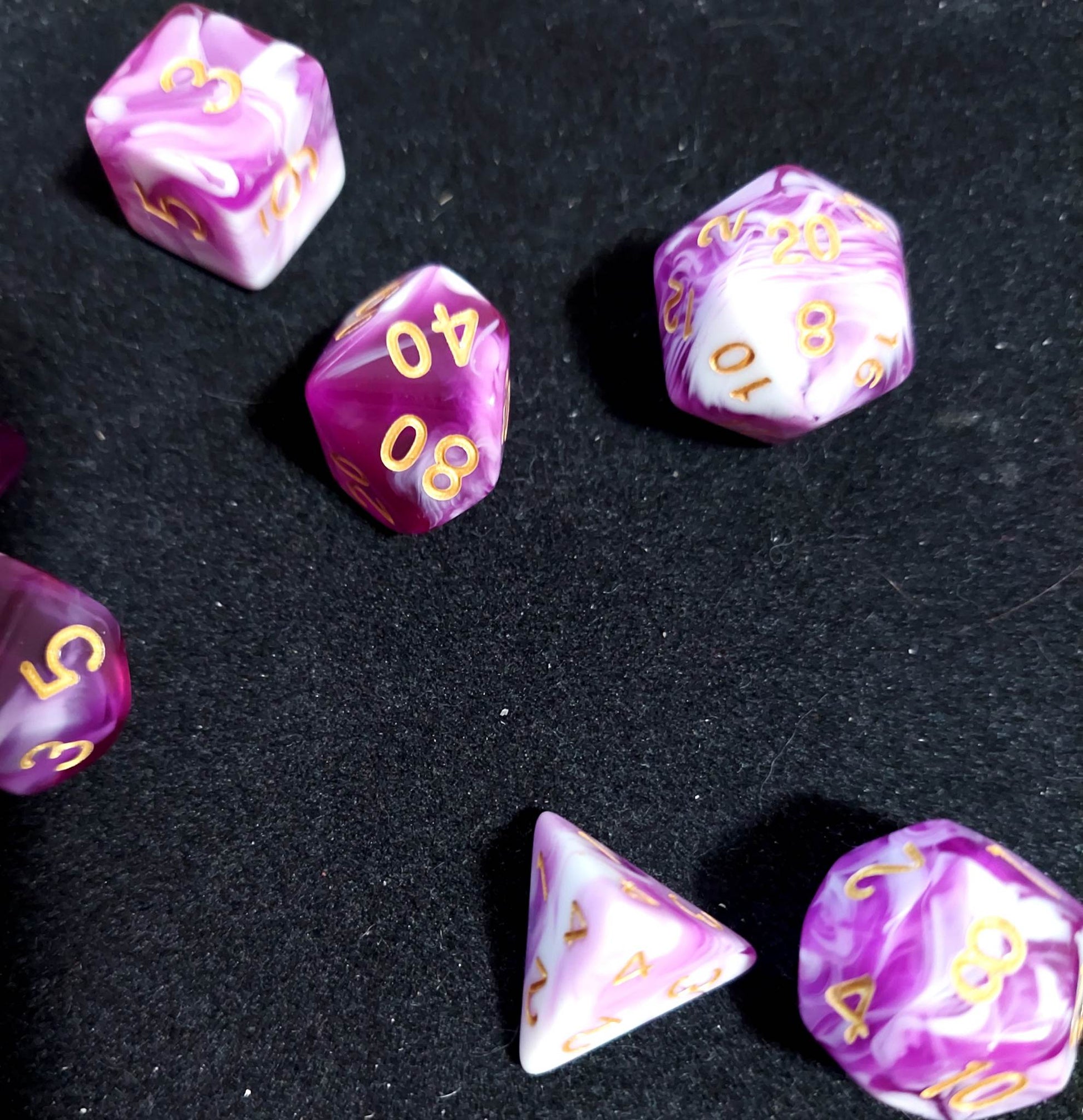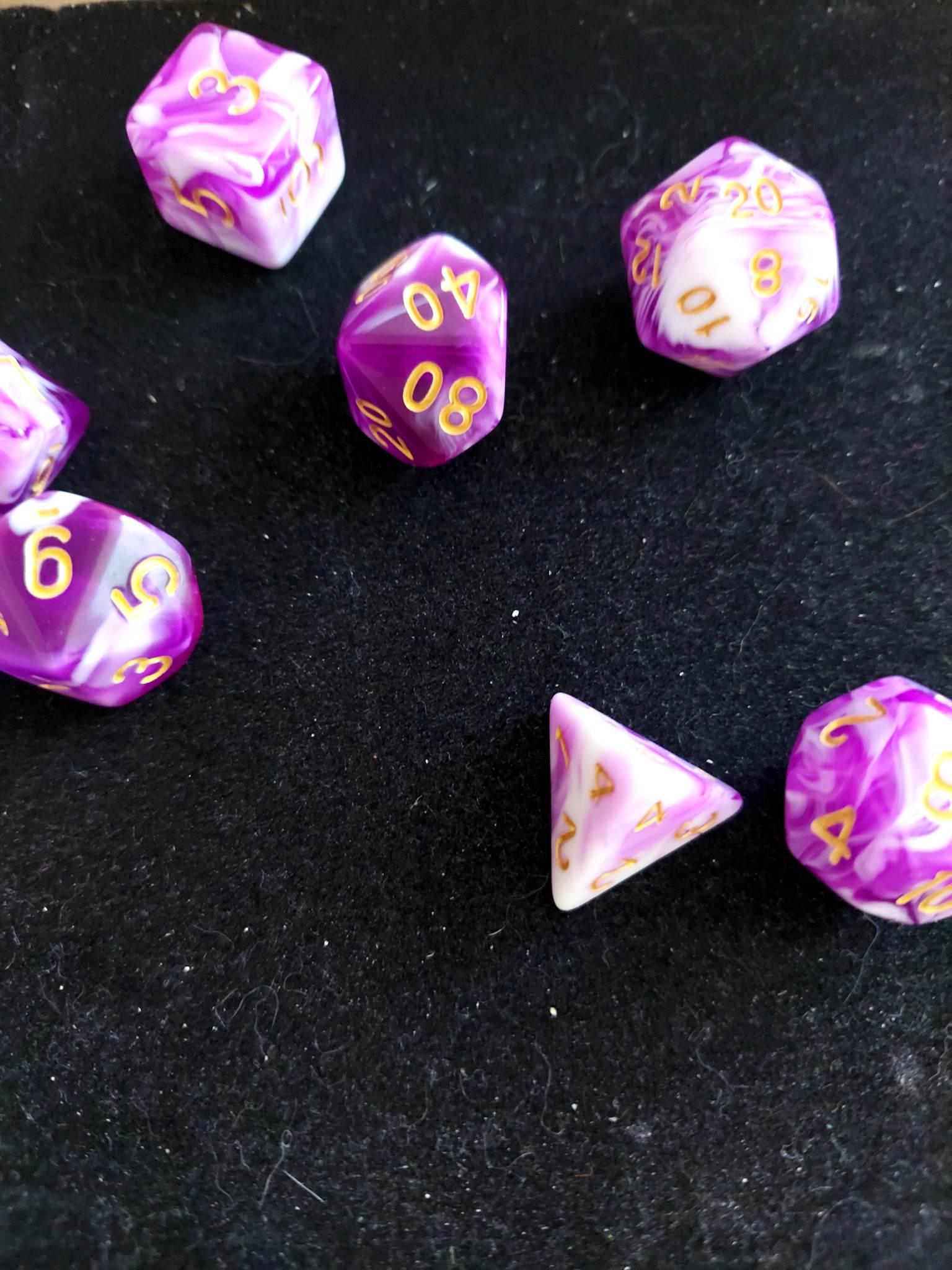 A 7 piece set of purple and white polyhederal dice that will make you dance a jig for no reason.