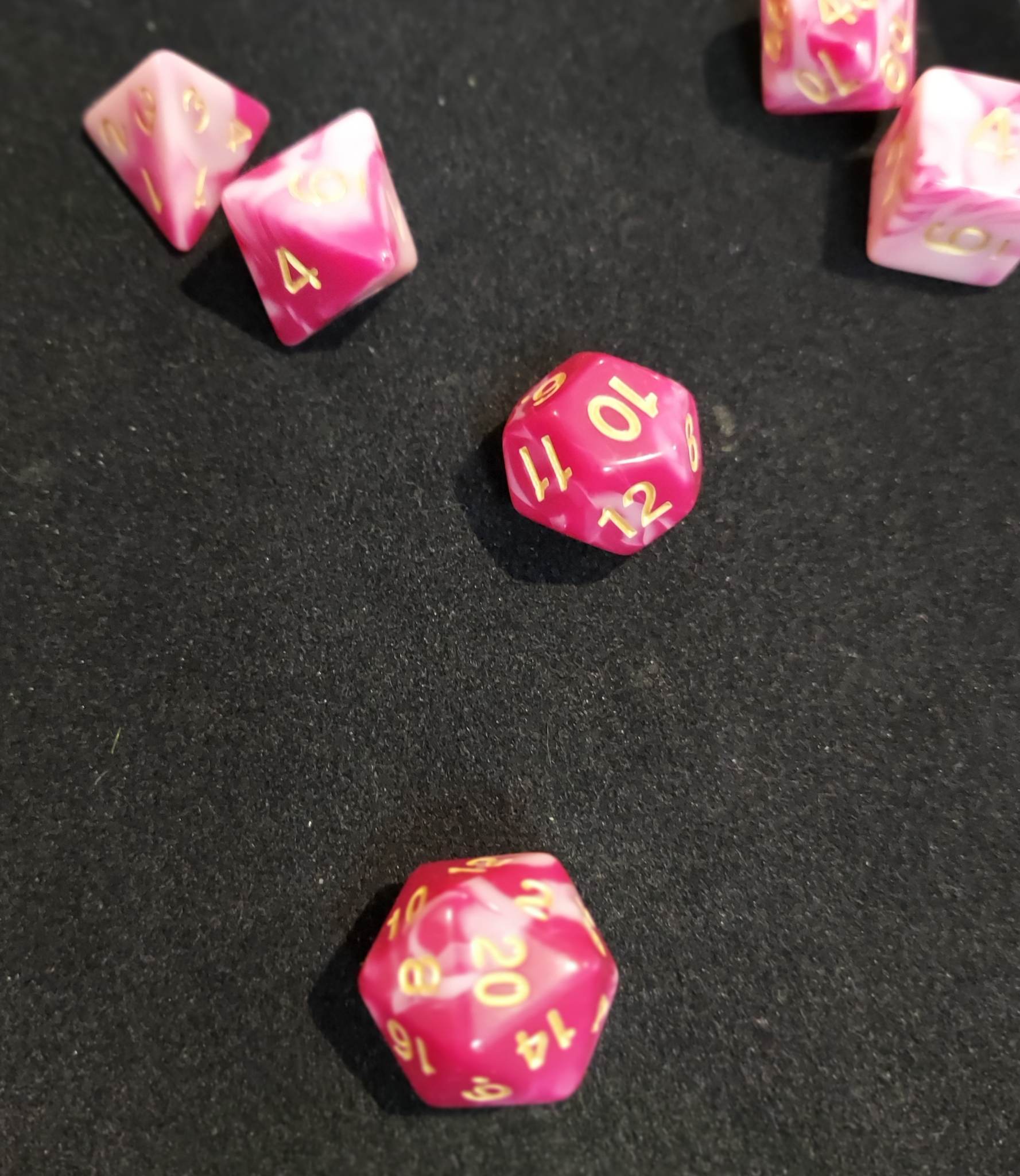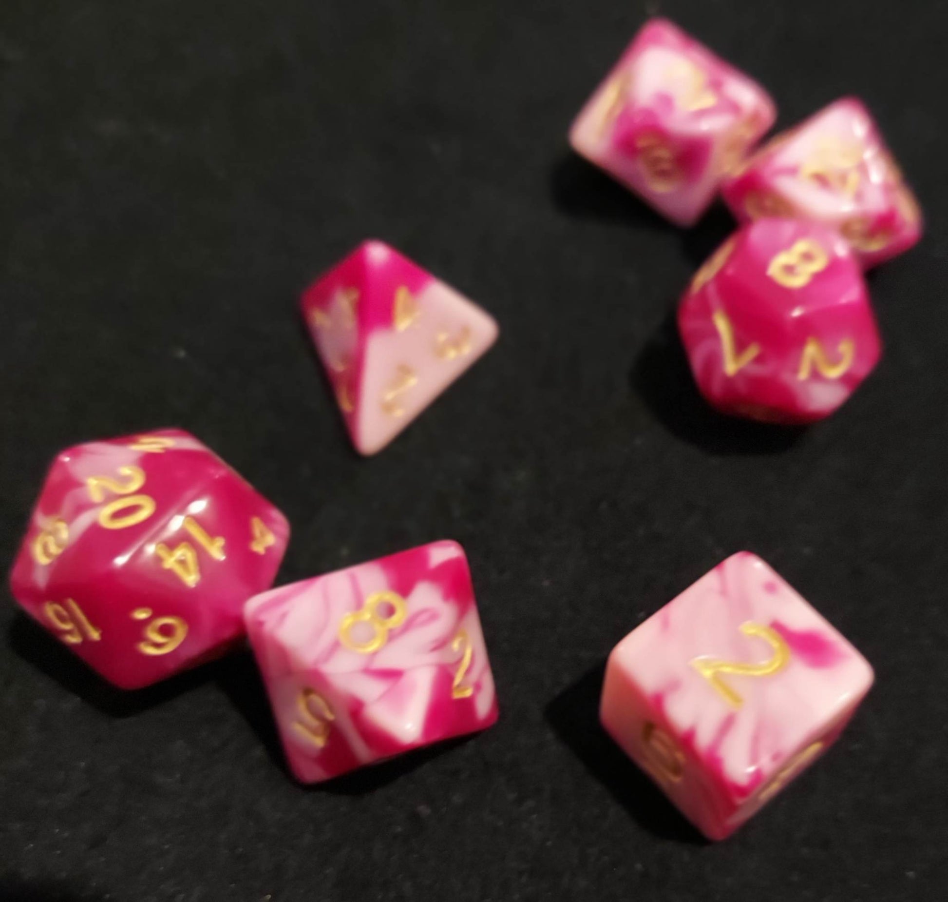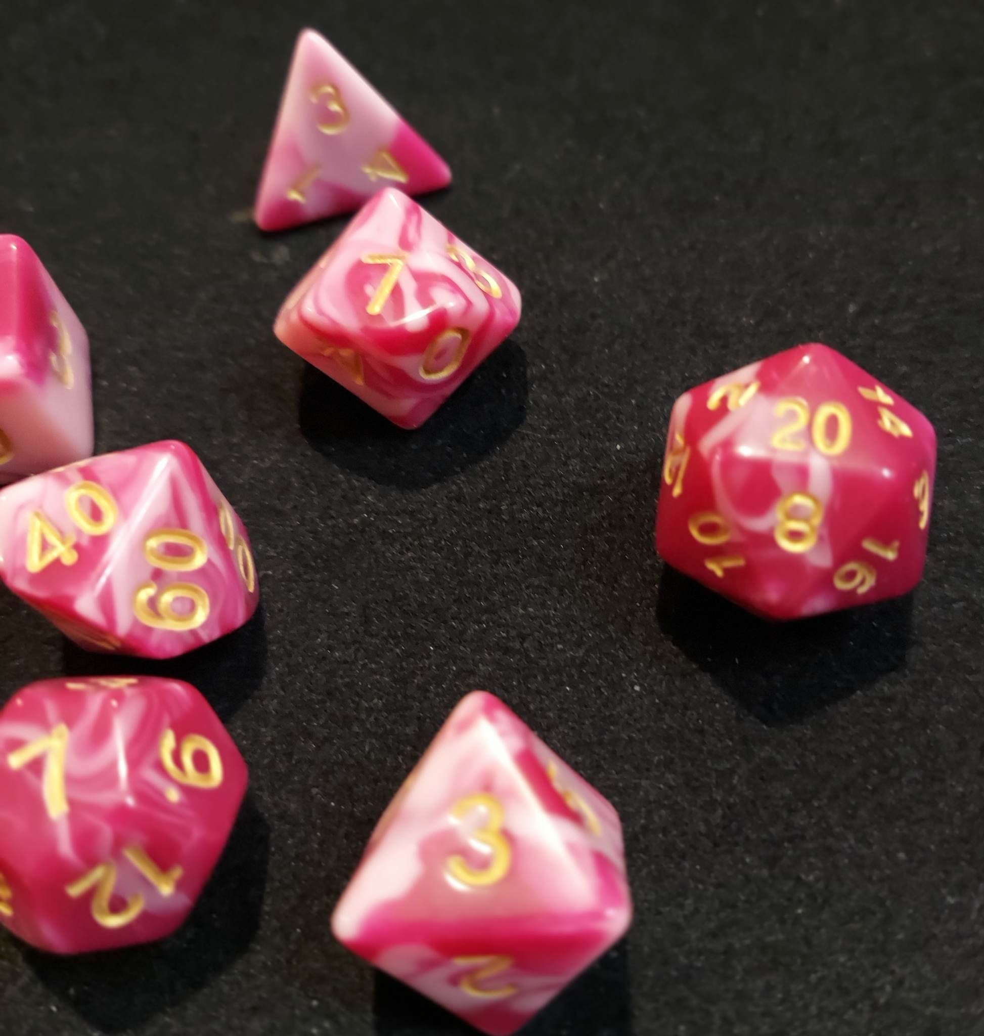 A 7 piece set of cotton candy pink and hot pink polyhederal dice that will make your heart sing.