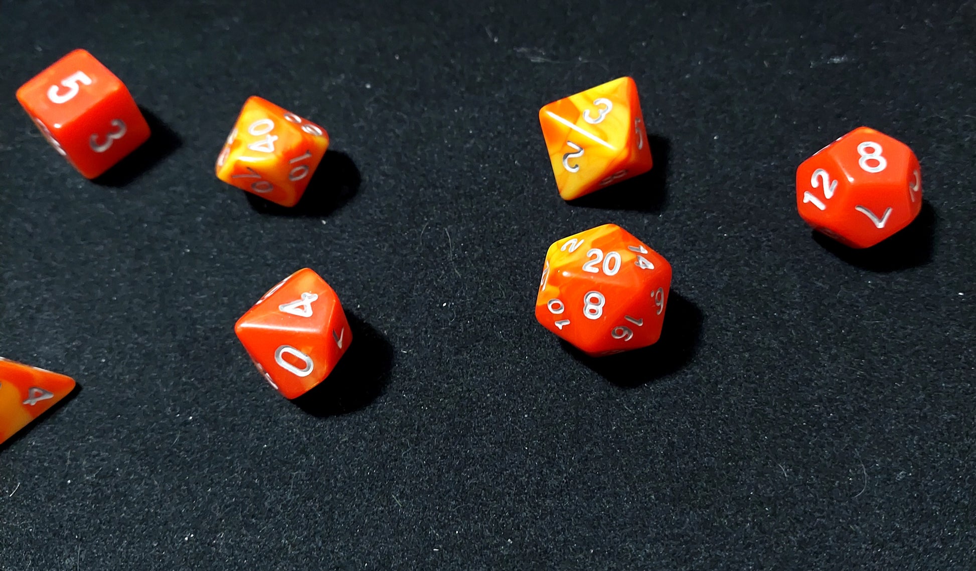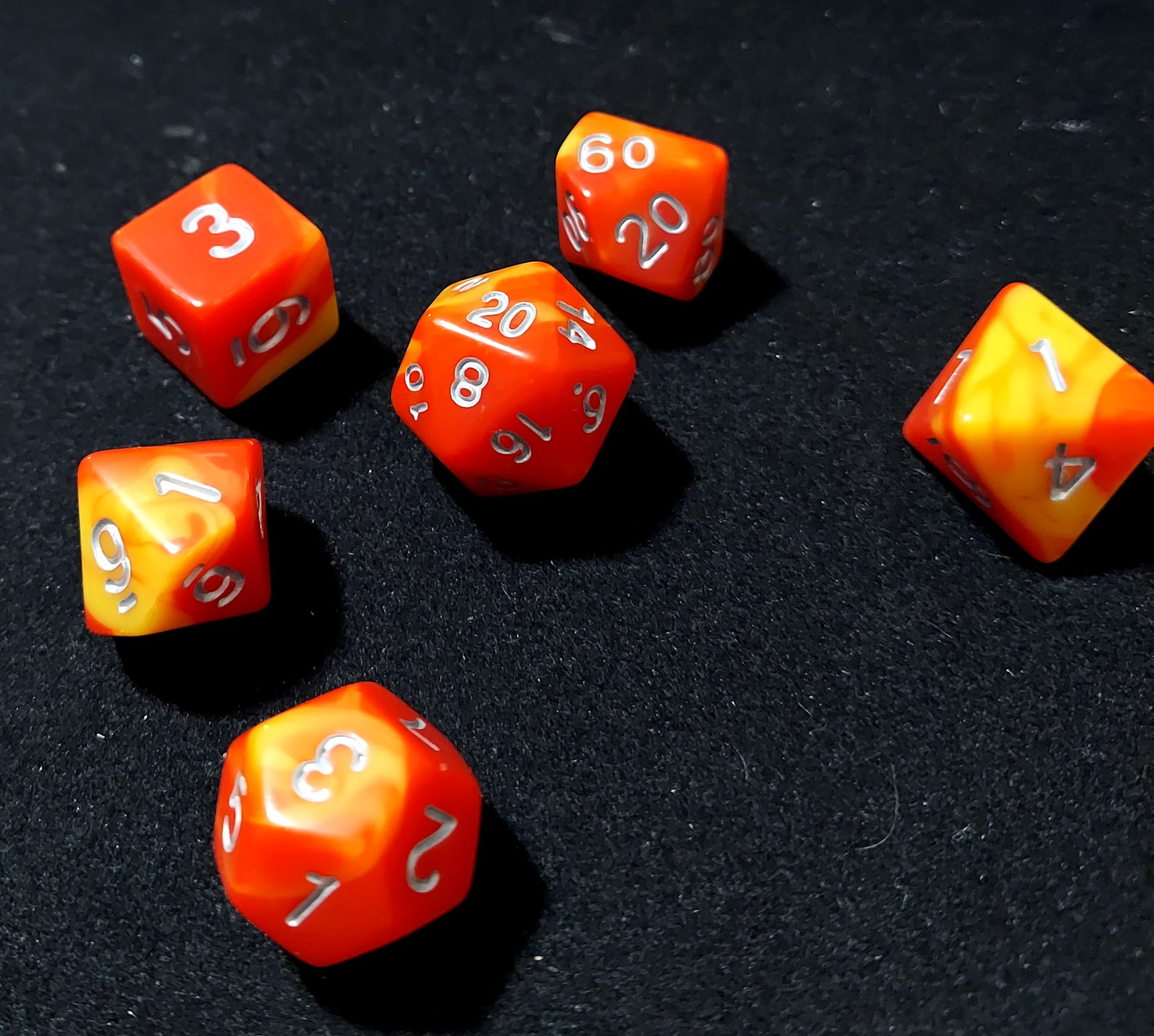 A 7 piece set of red and yellow polyhederal dice that are fire.