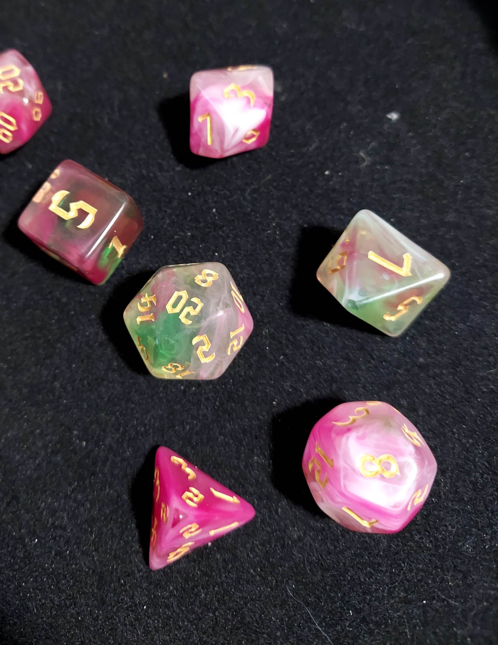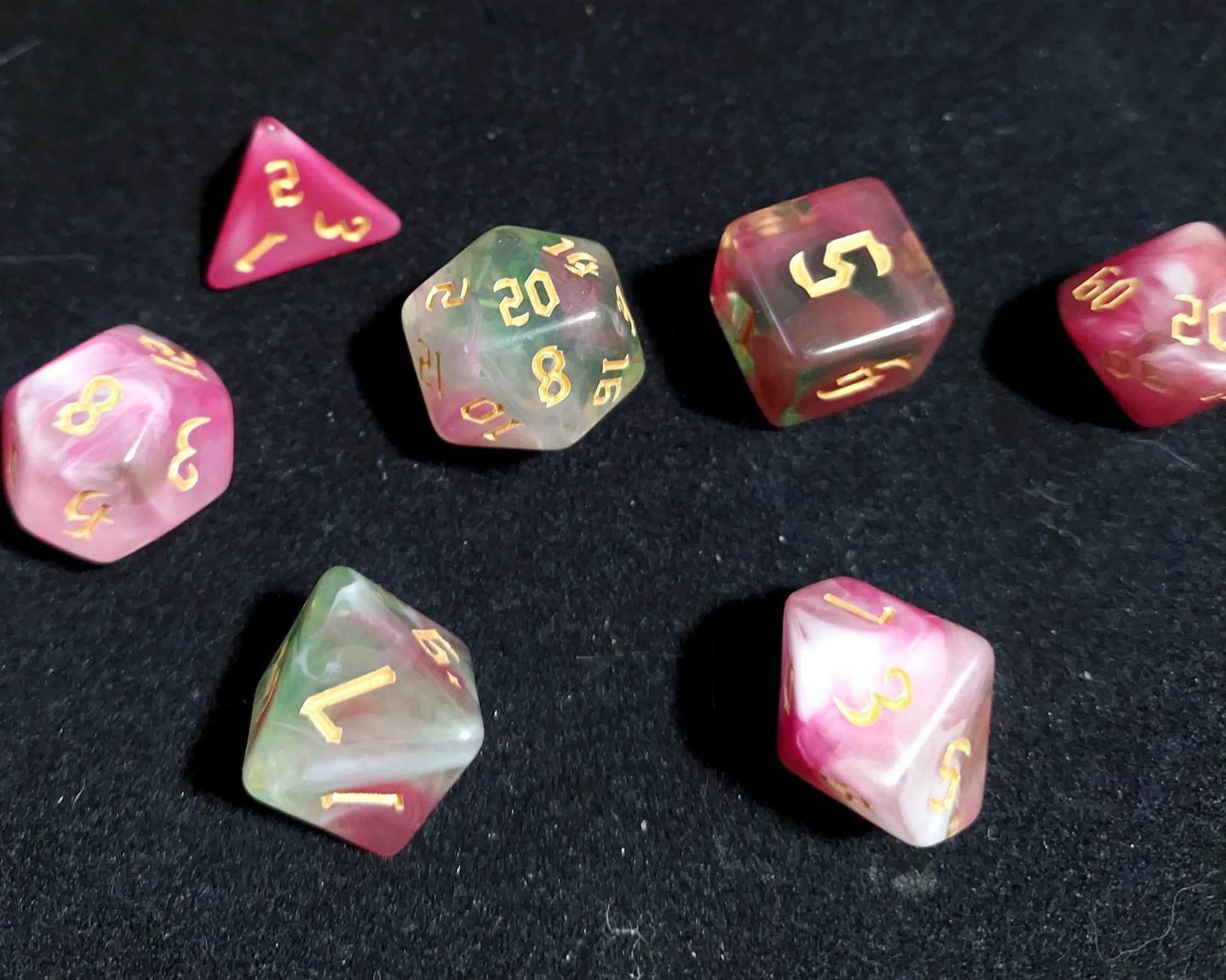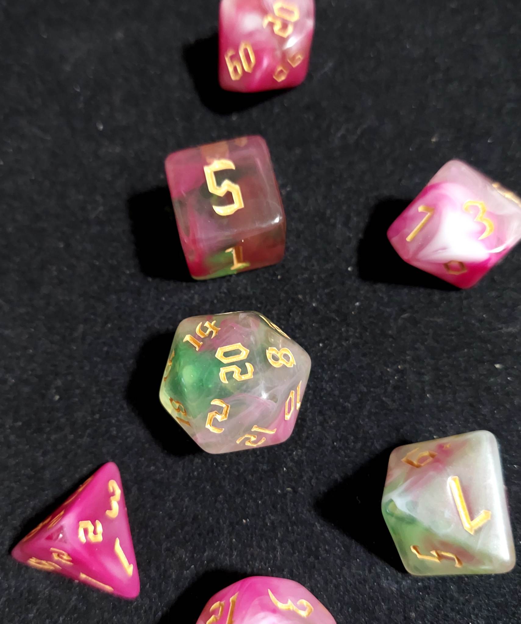A 7 piece set of pink, white and green polyhederal dice that will grow on you.