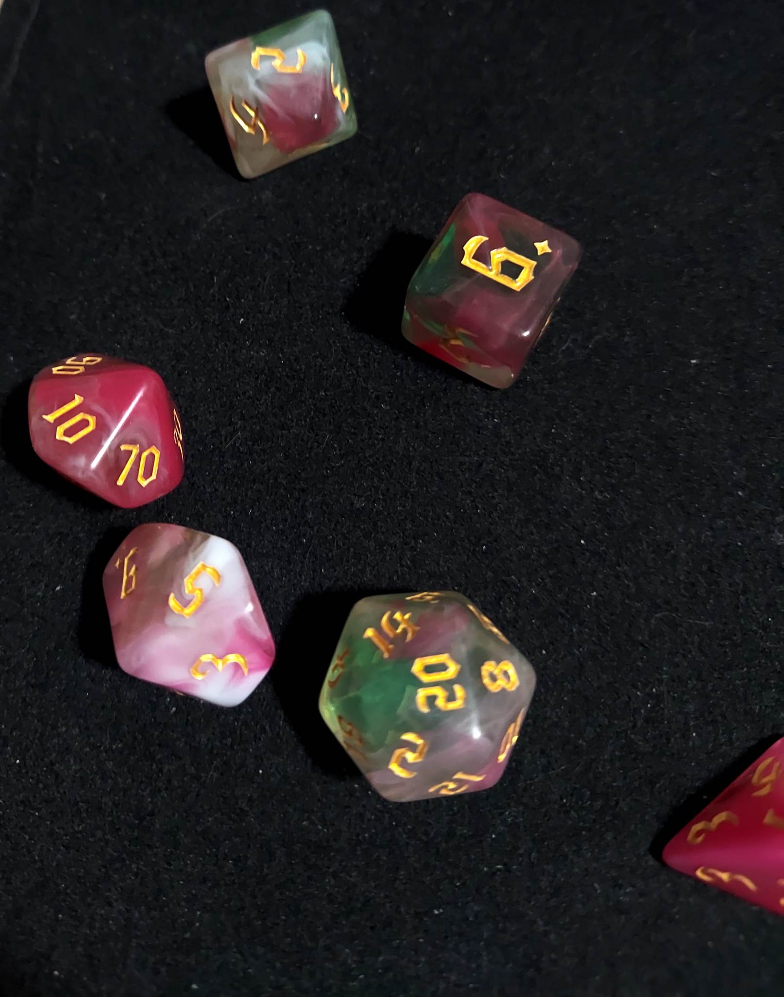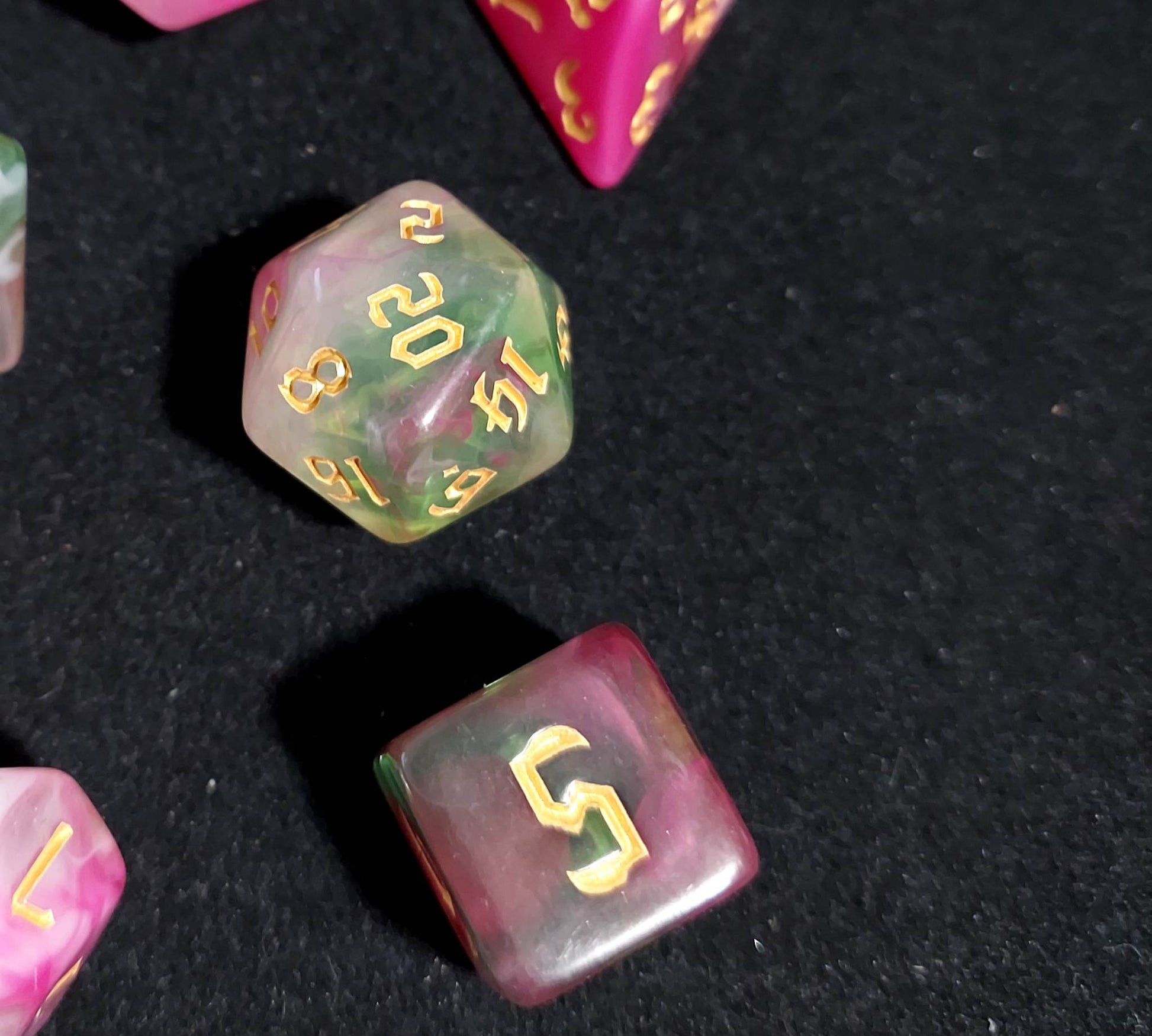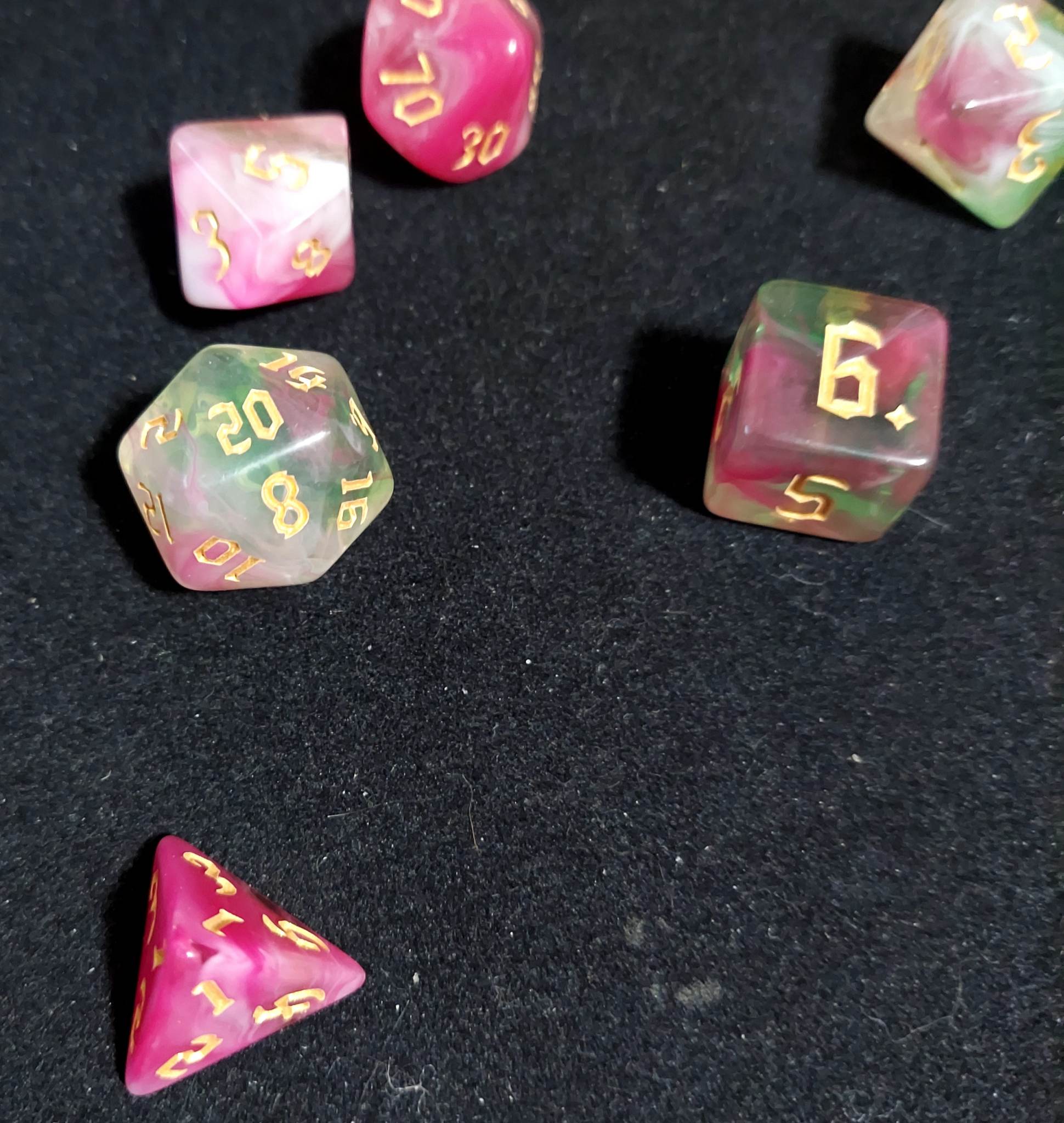 A 7 piece set of pink, white and green polyhederal dice that will grow on you.