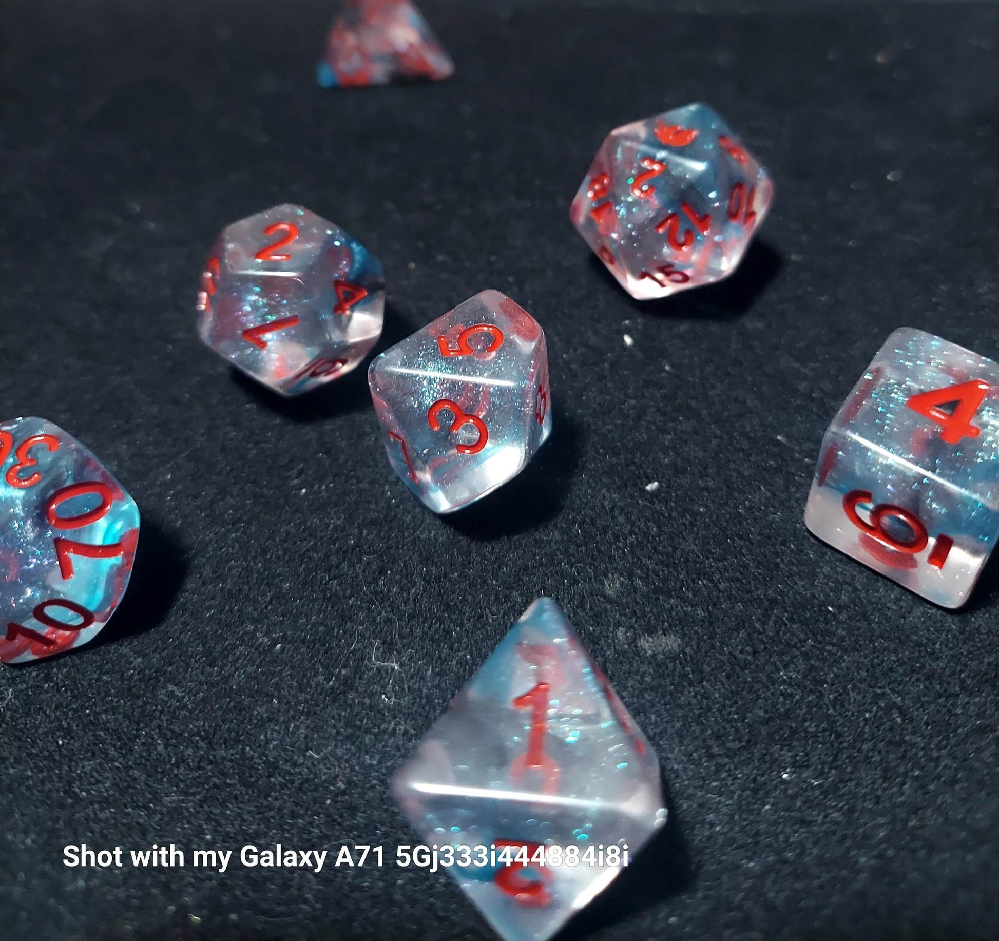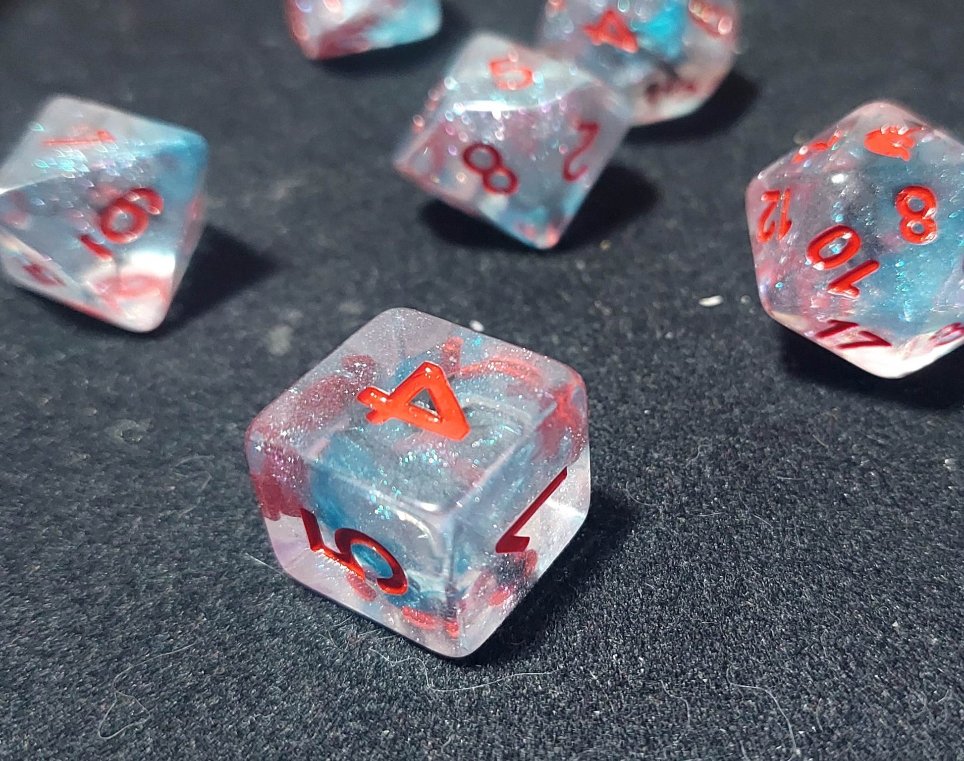 A 7 piece set of frosty blue dice with red numbering polyhederal dice that will make you will freeze the game.