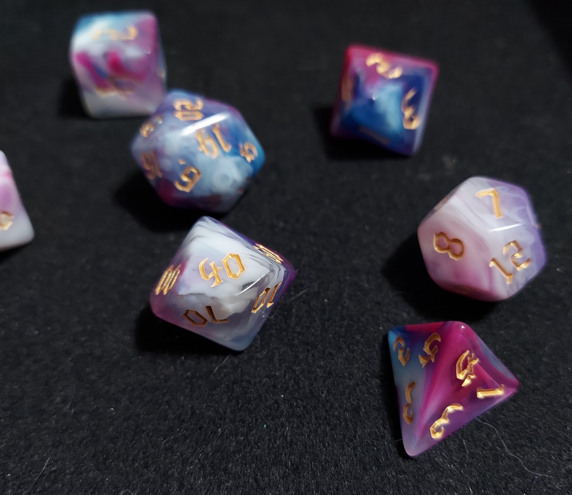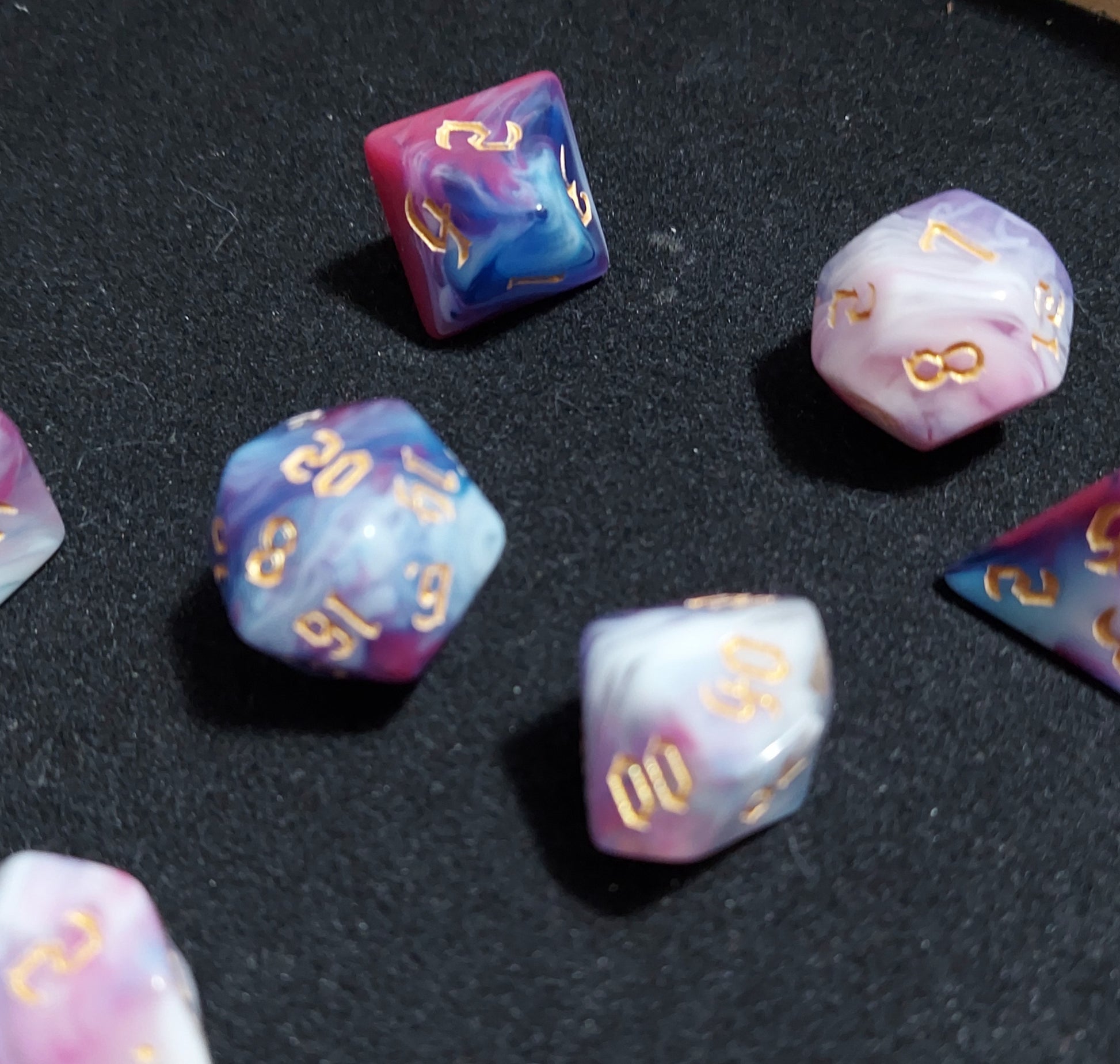A 7 piece set of plum, blue and white polyhederal dice that will make you dance a jig for no reason.