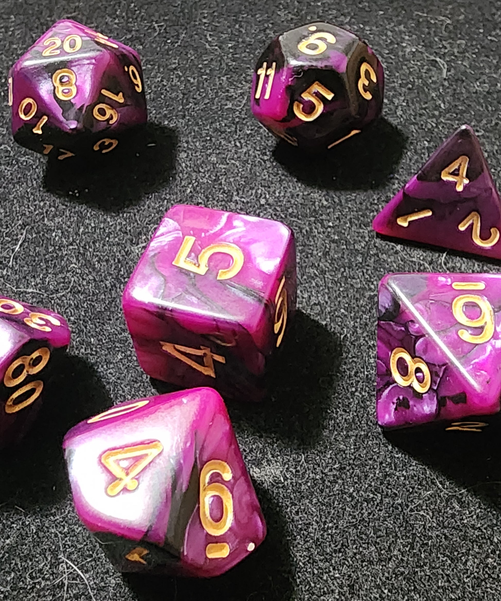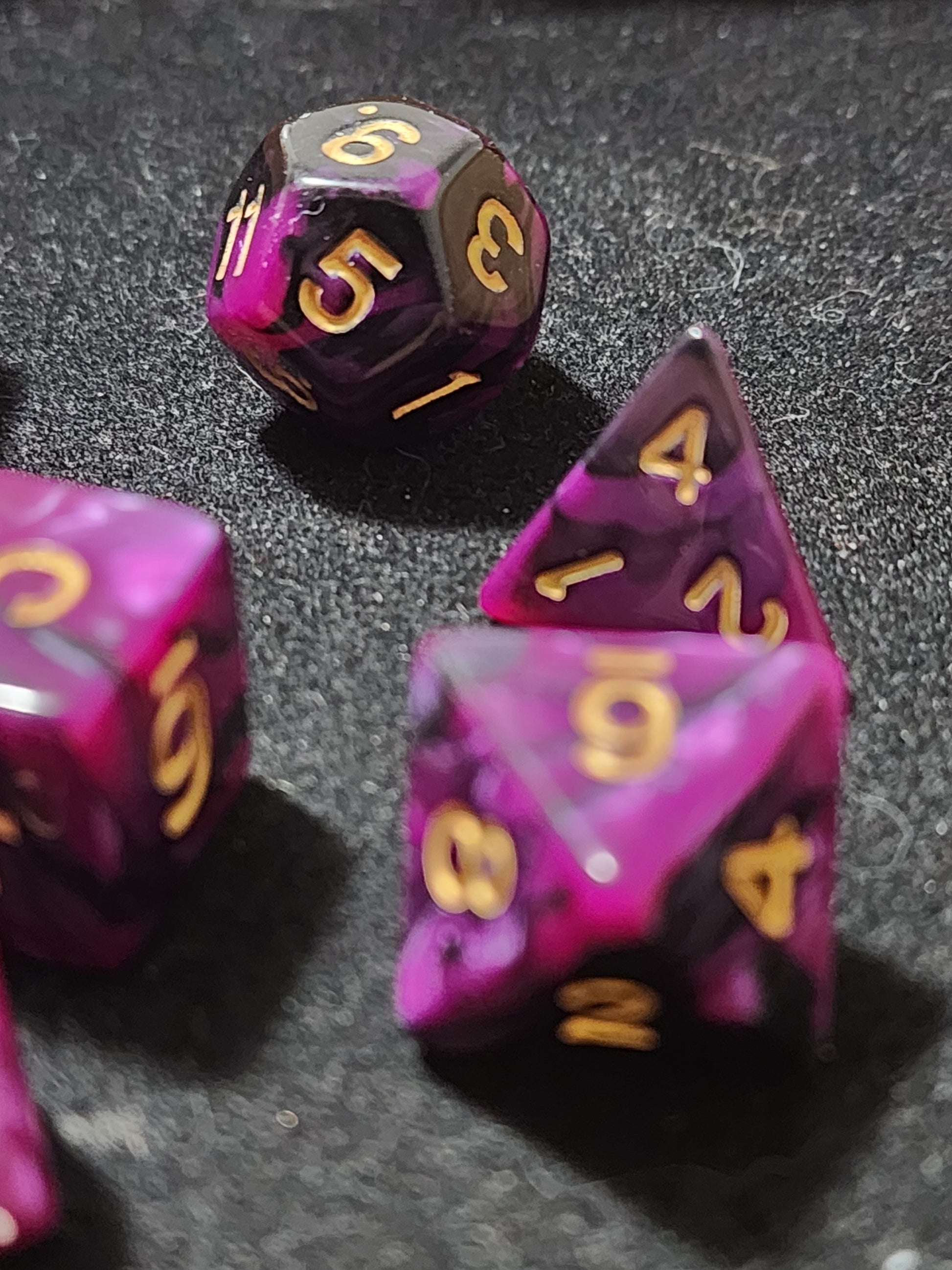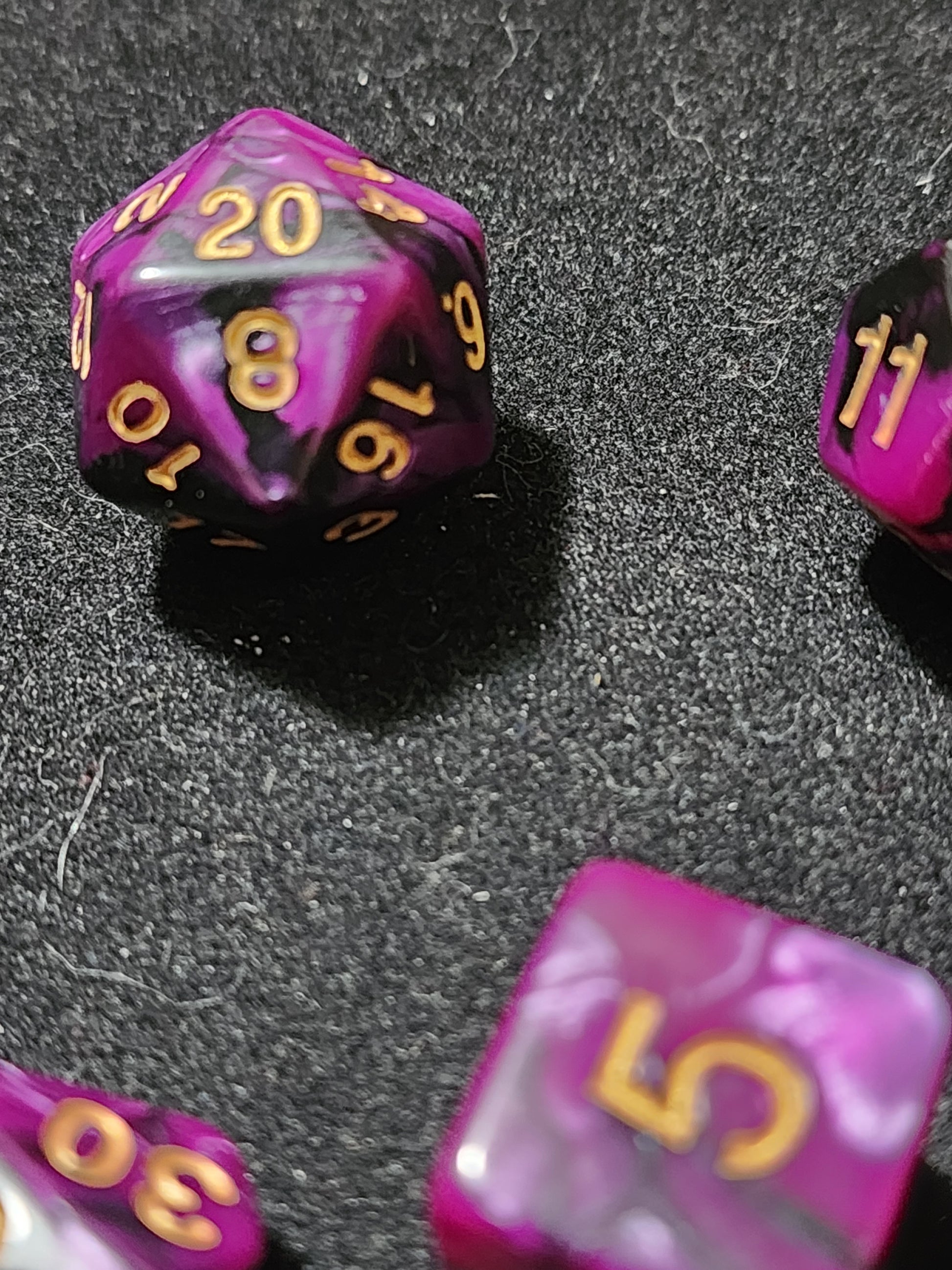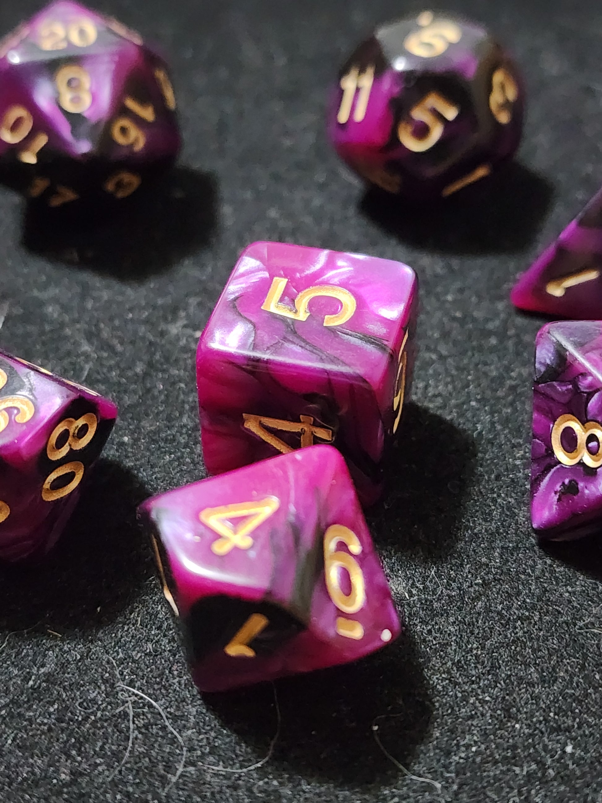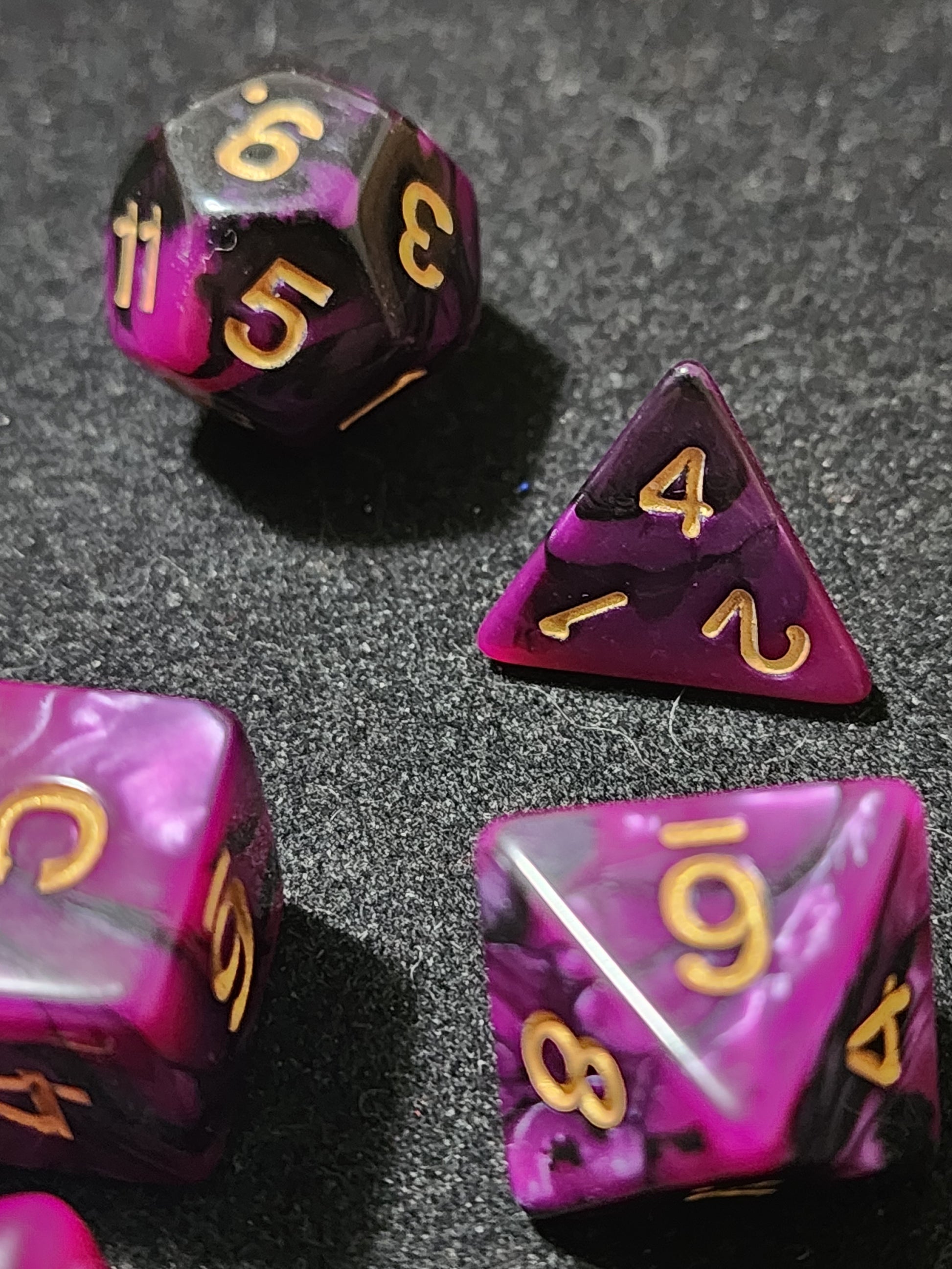 A 7 piece set of purple and black polyhederal dice that will make everyone realize that you are the beast under the bed.