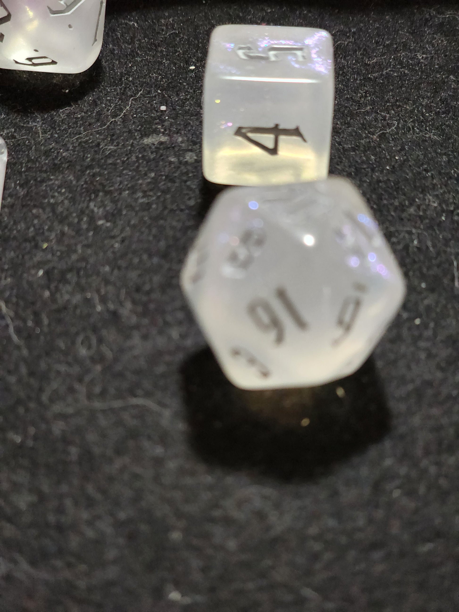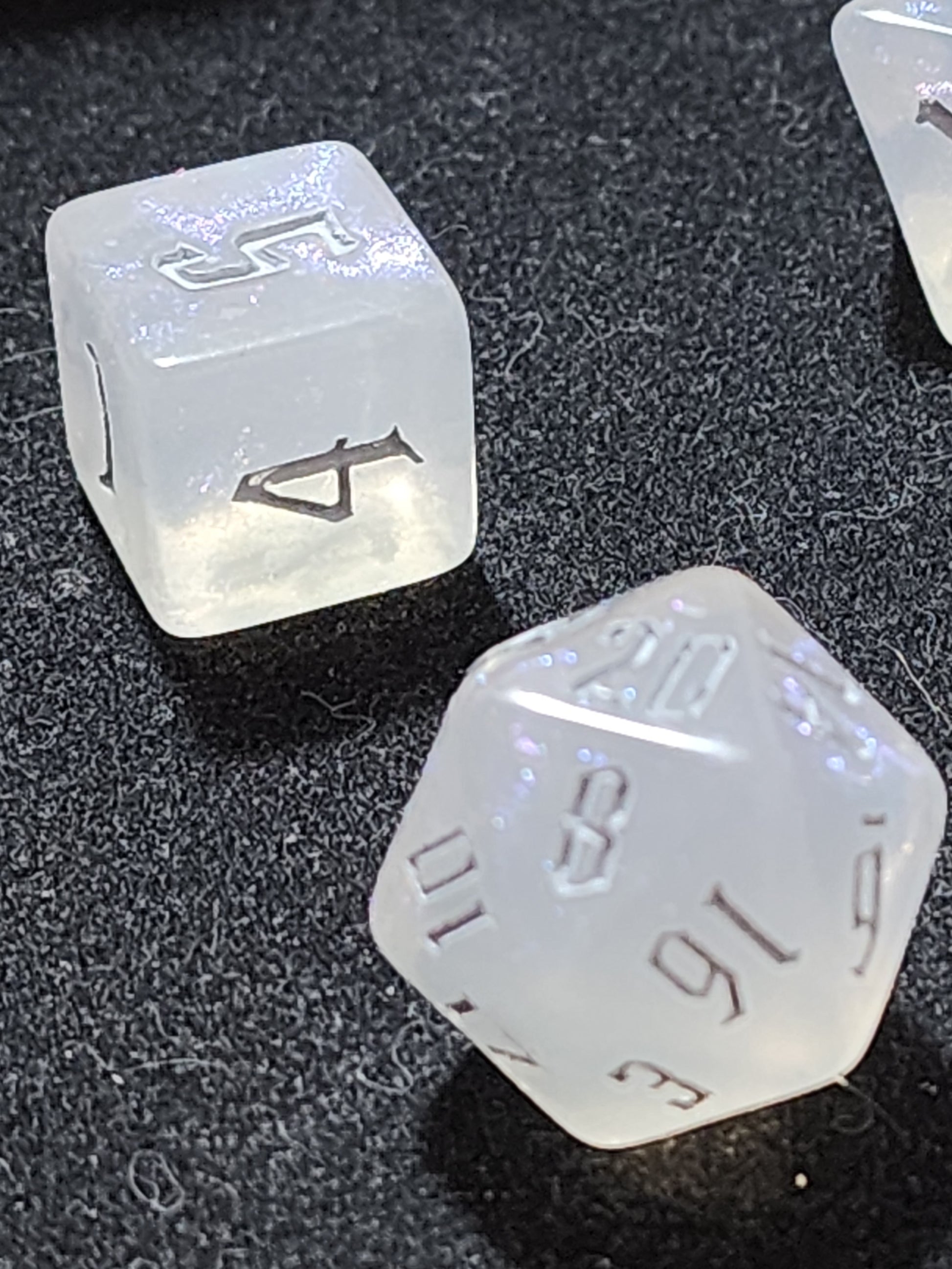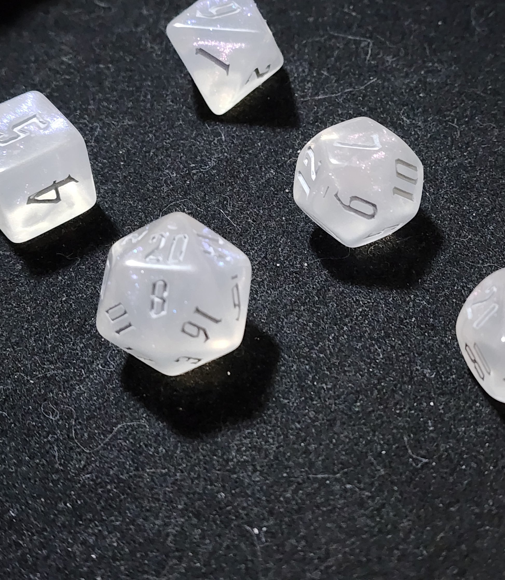 A 7 piece set of shimmering polyhederal dice that will make everyone think they came from the ethereal plane.