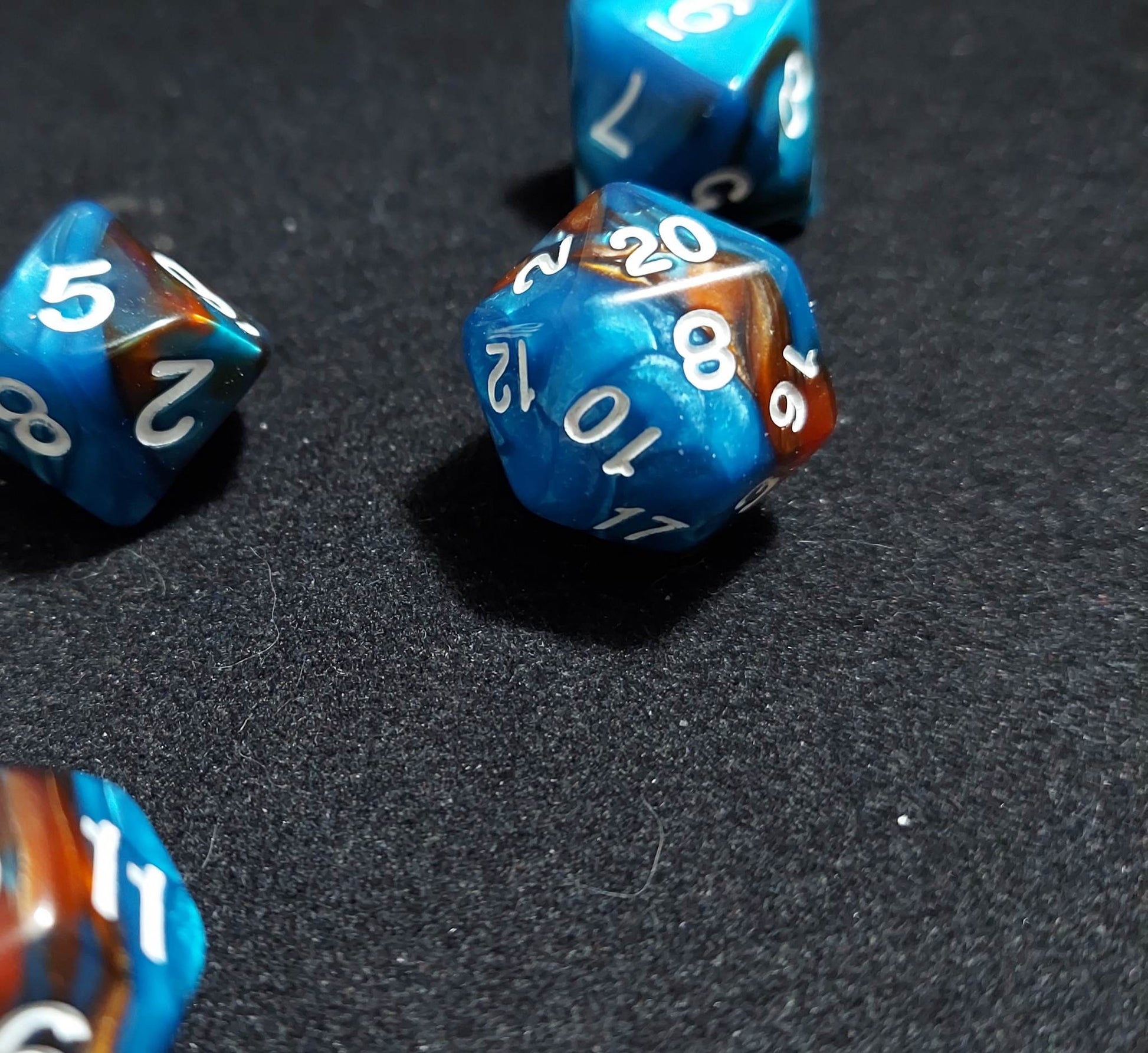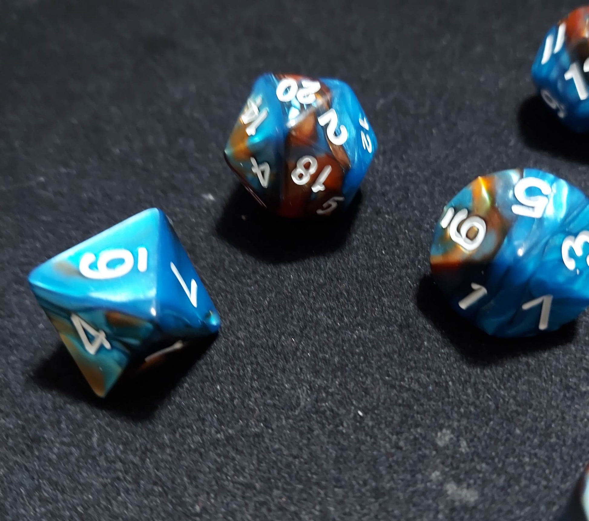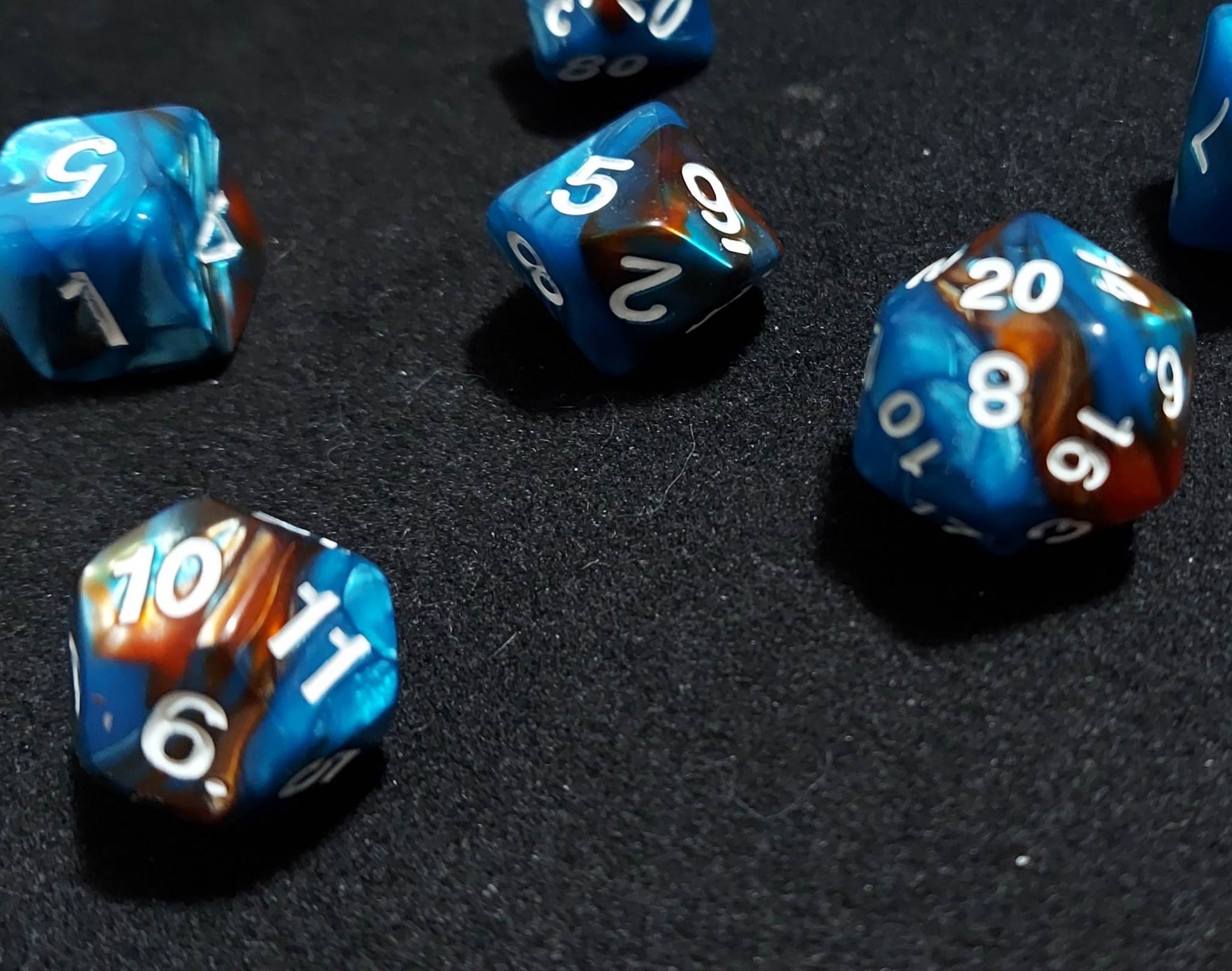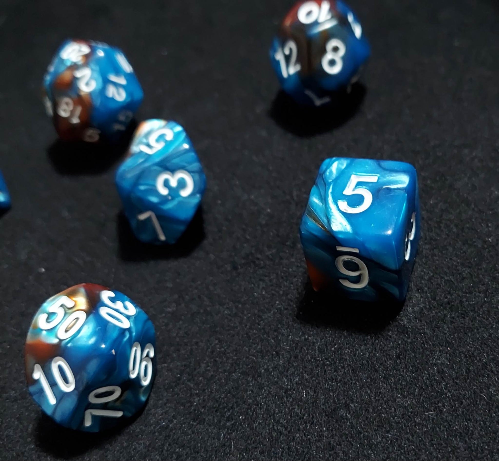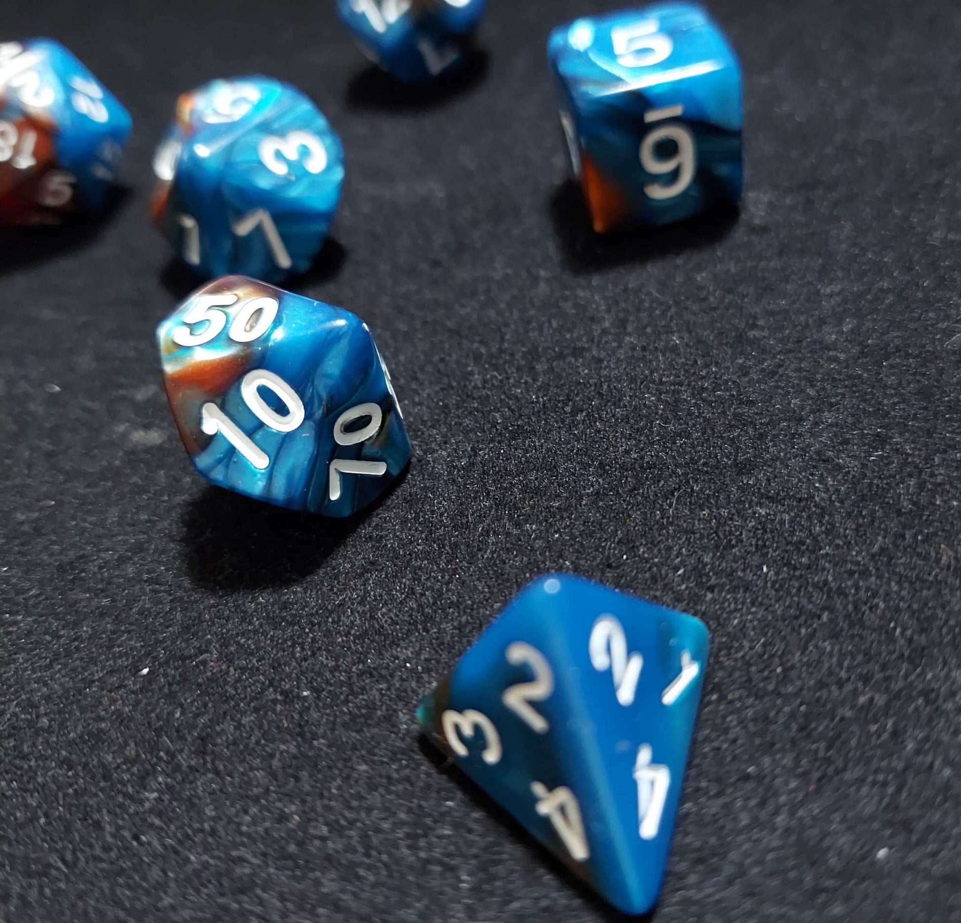 A 7 piece set of blue and brown purple and black polyhederal dice that will make everyone around you jelly.