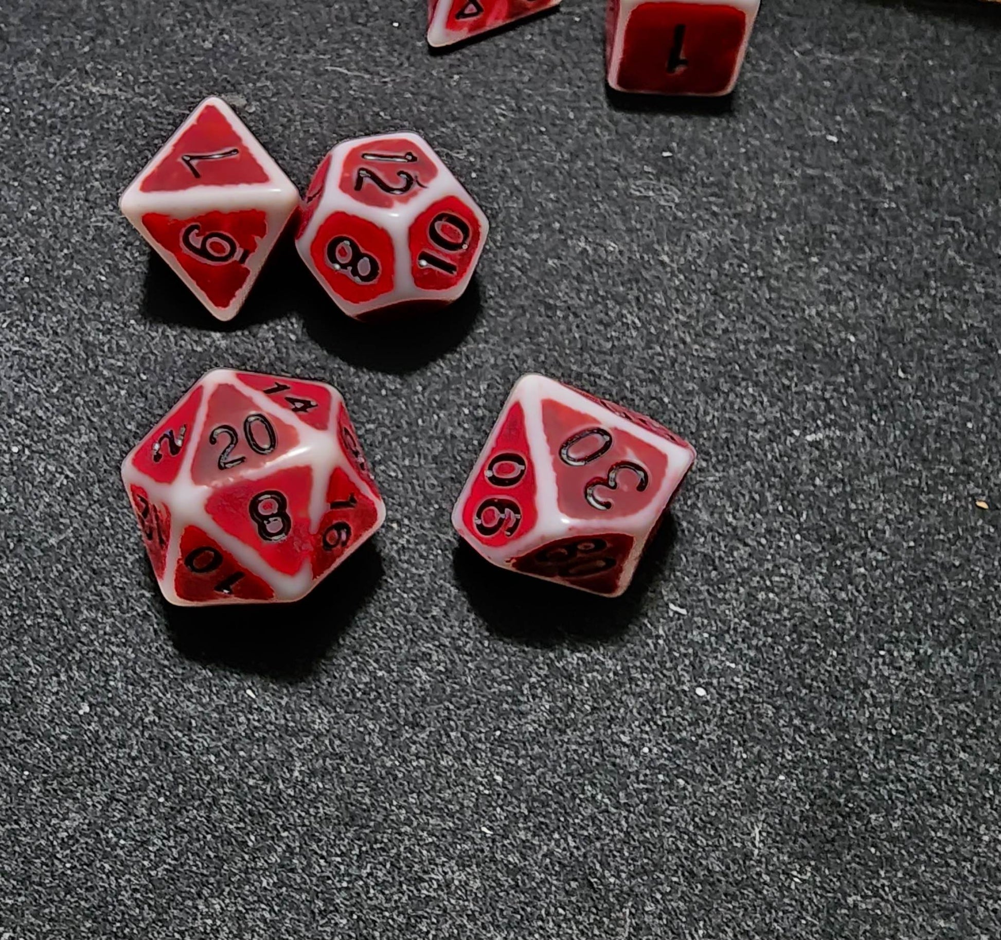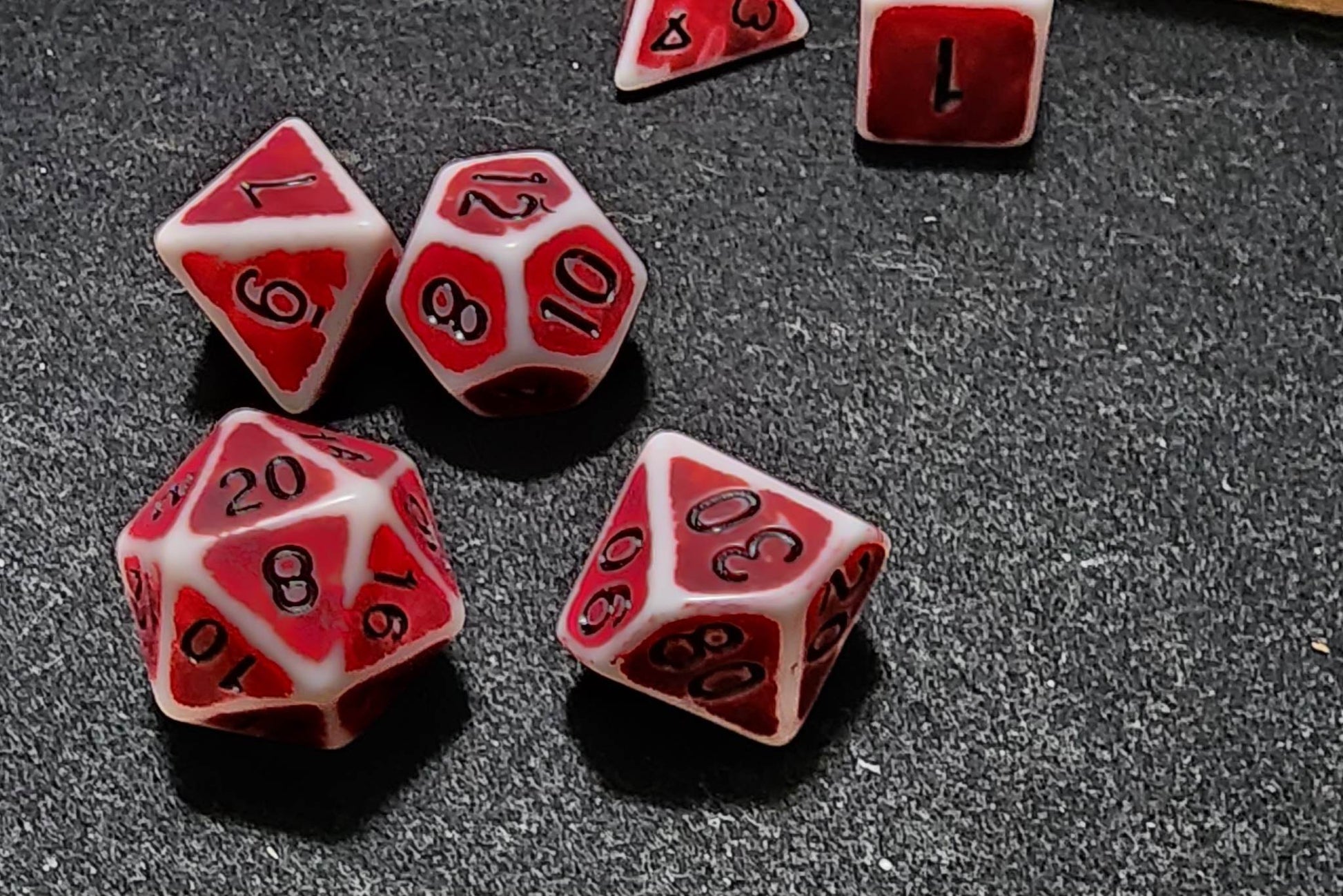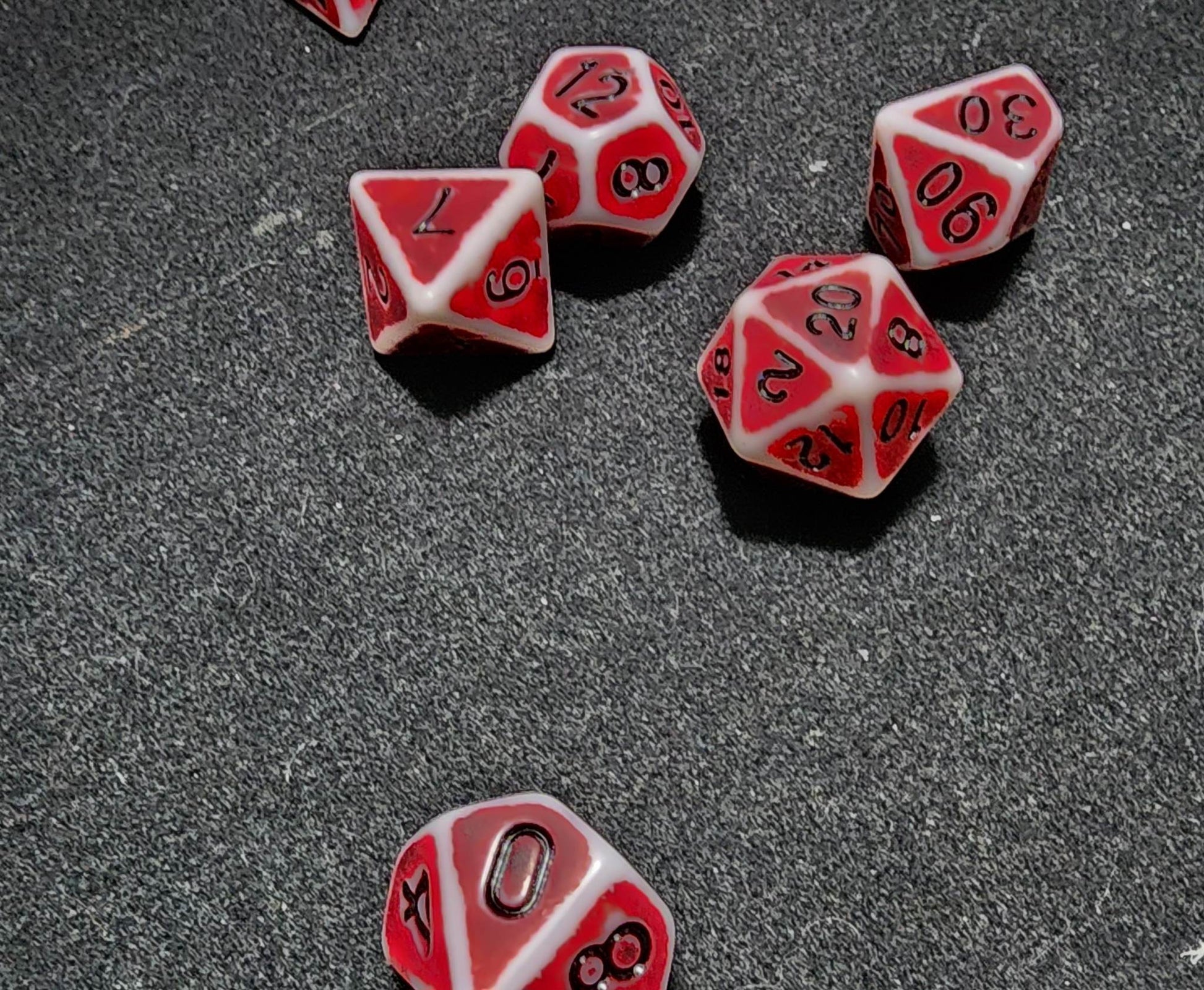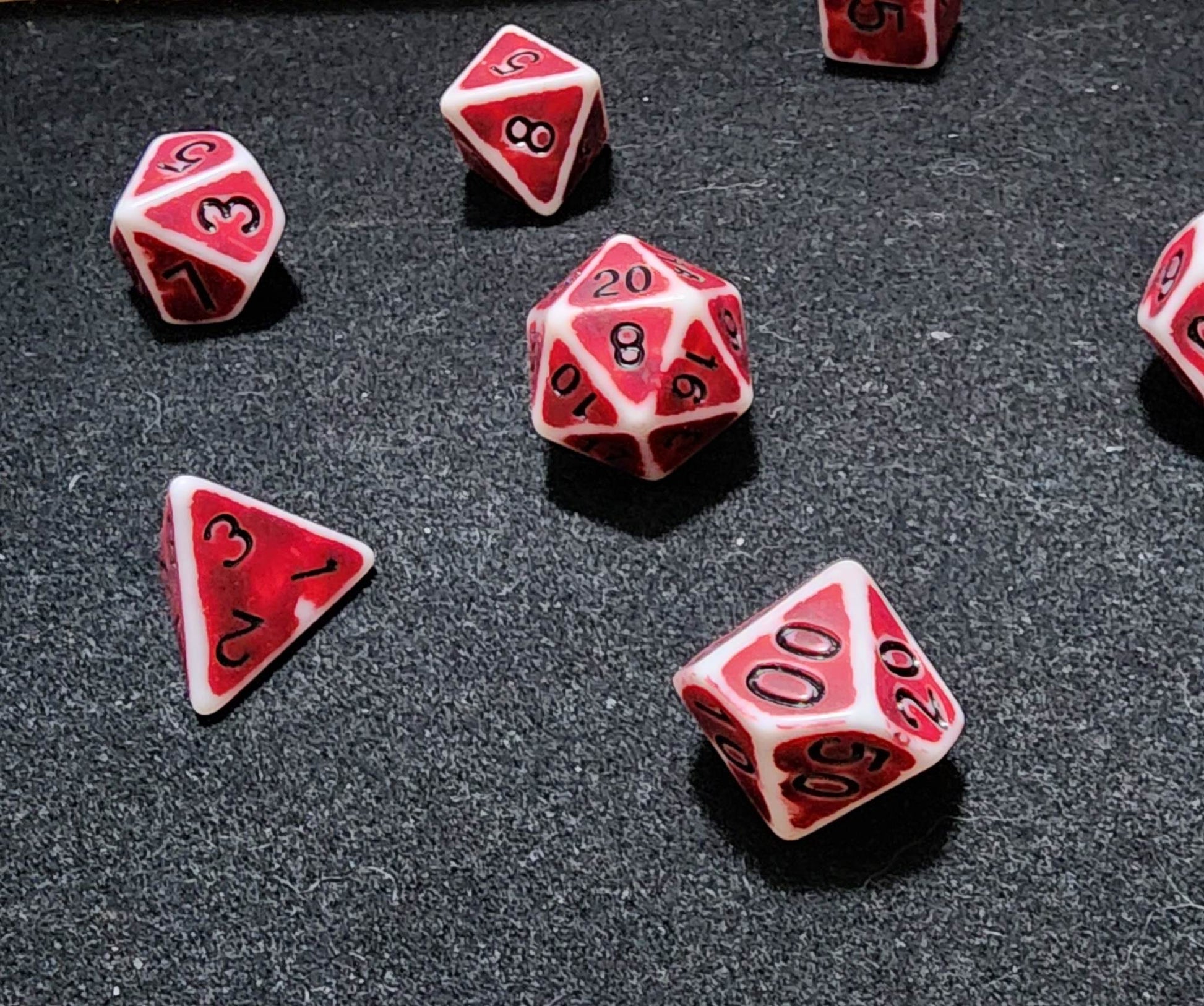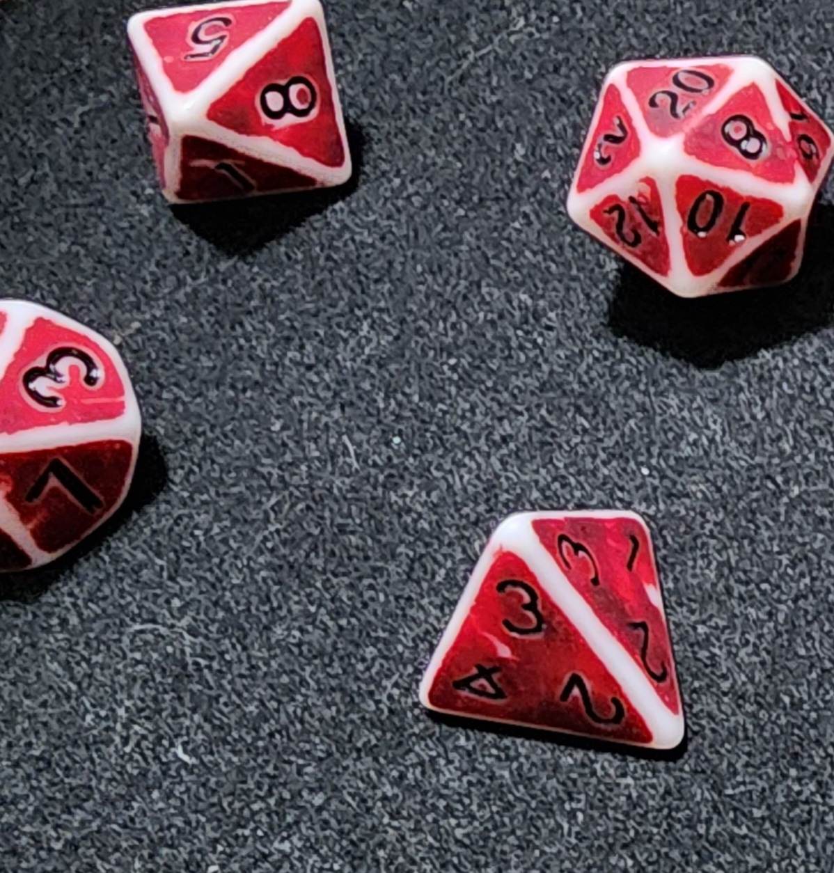 A 7 piece set of retro pink polyhederal dice that will take you down memory lane.
