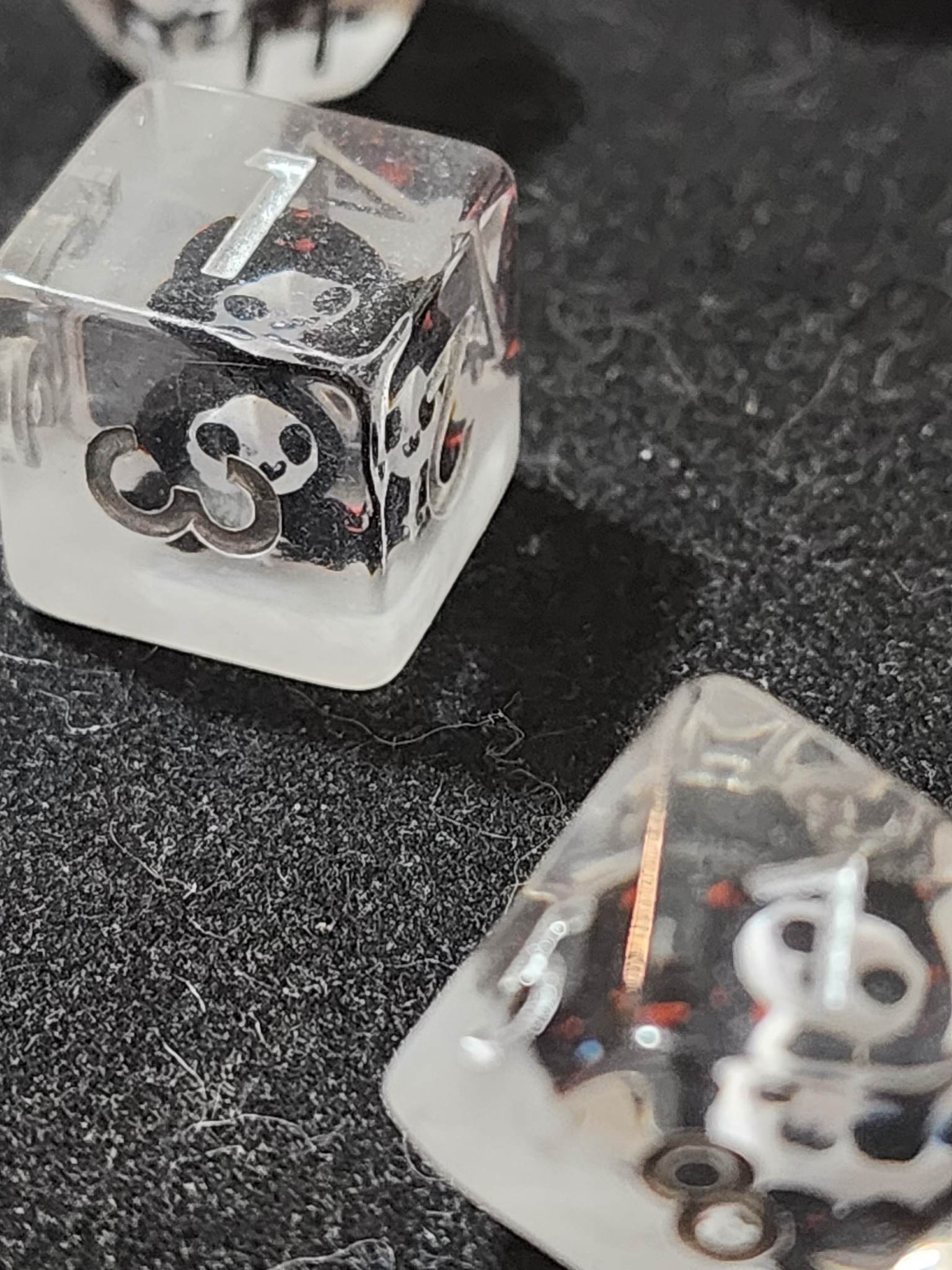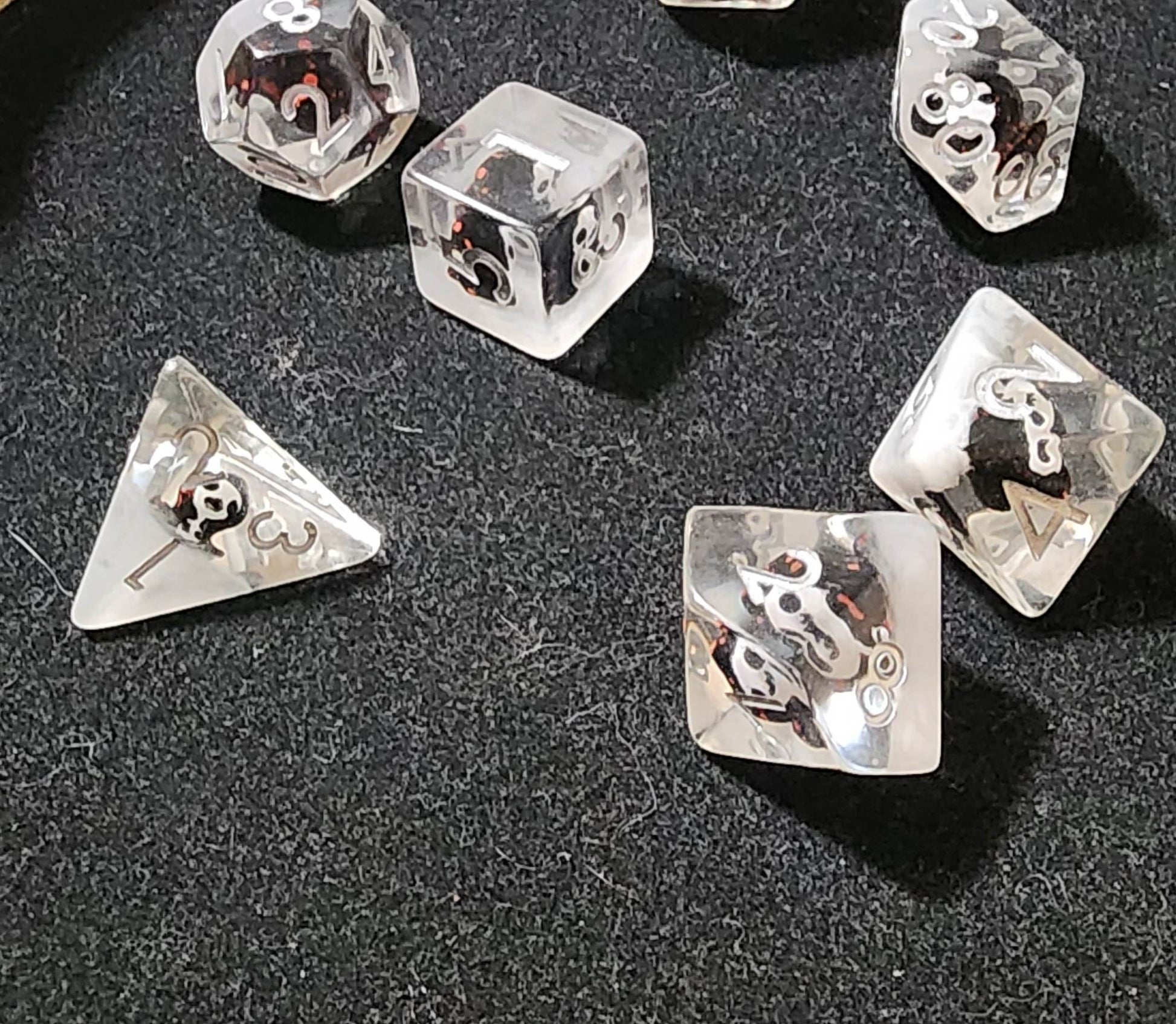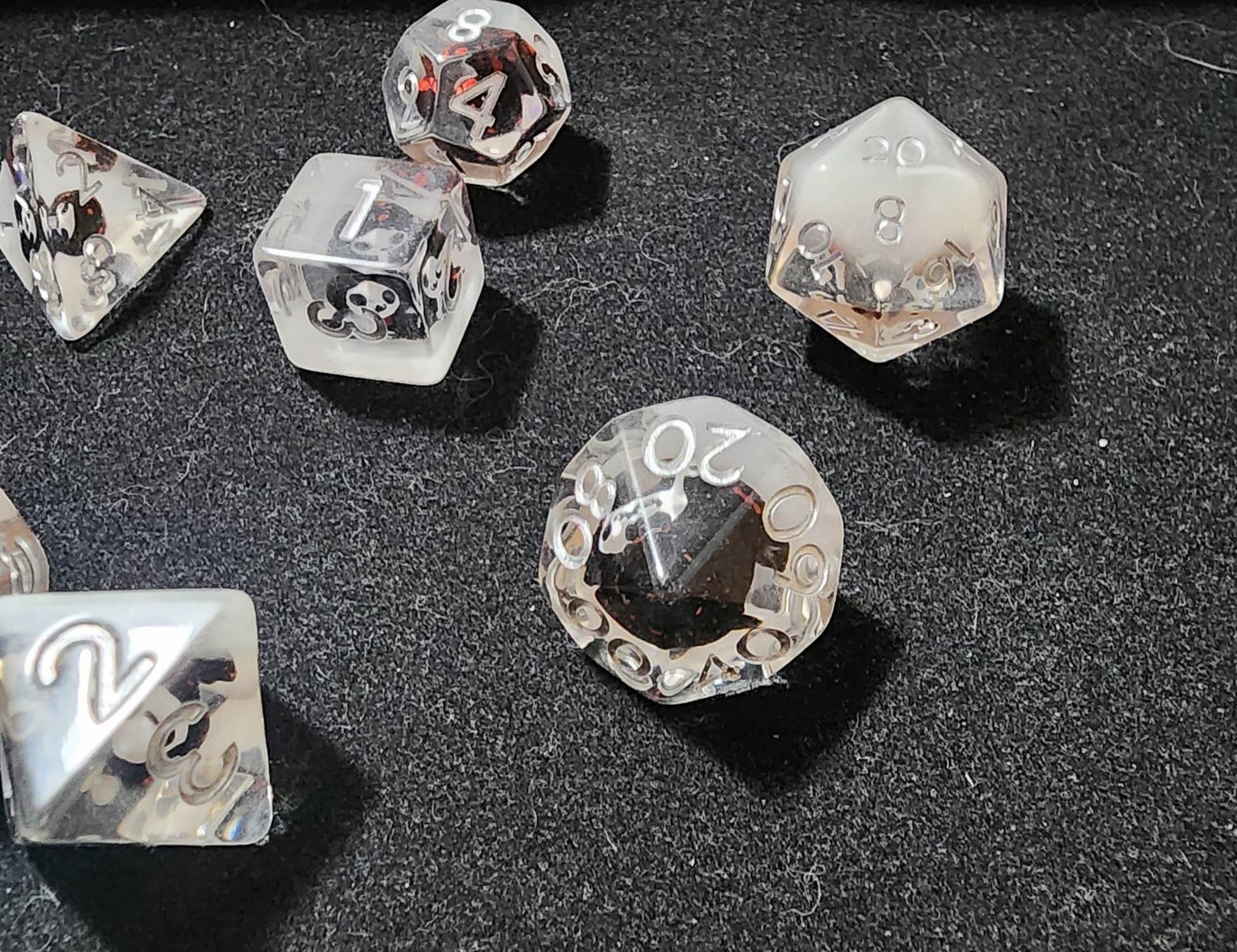 A 7 piece set of grim reaper inclusion polyhederal dice that are to DIE for.