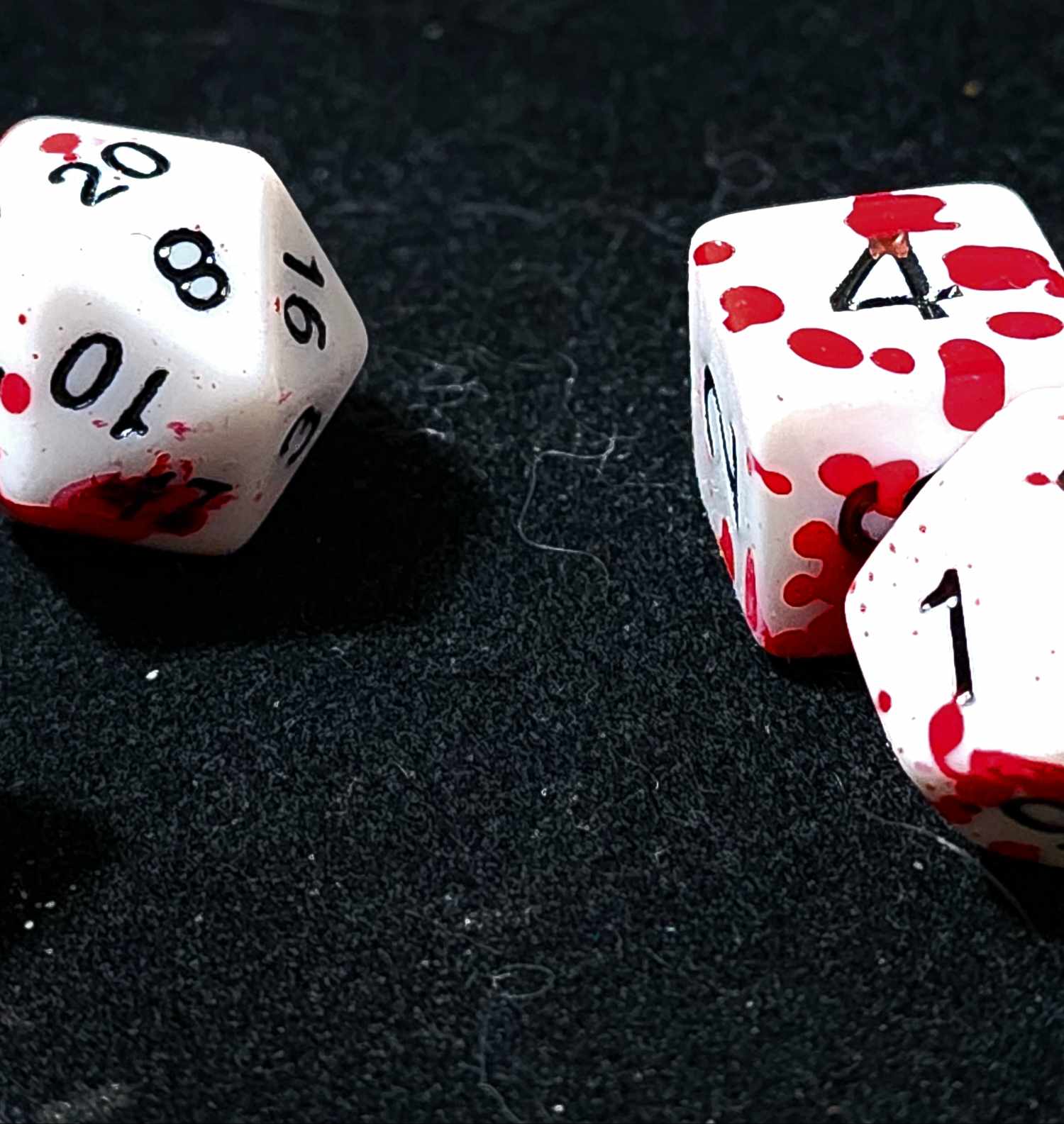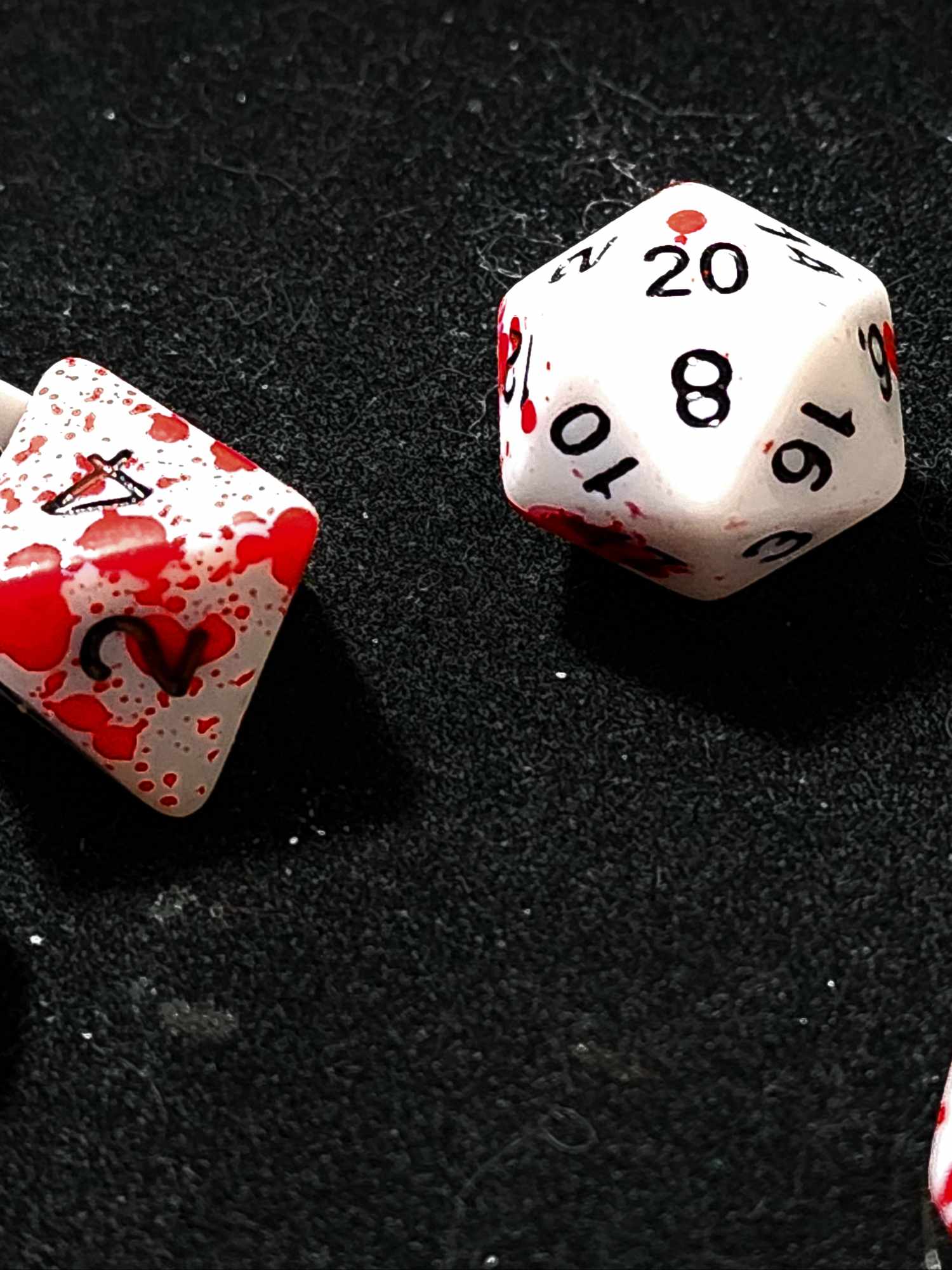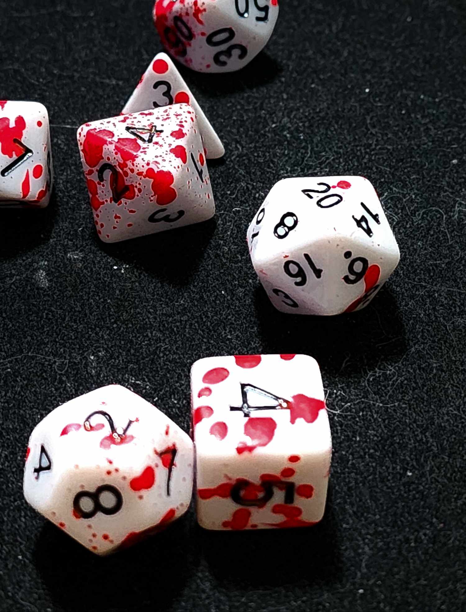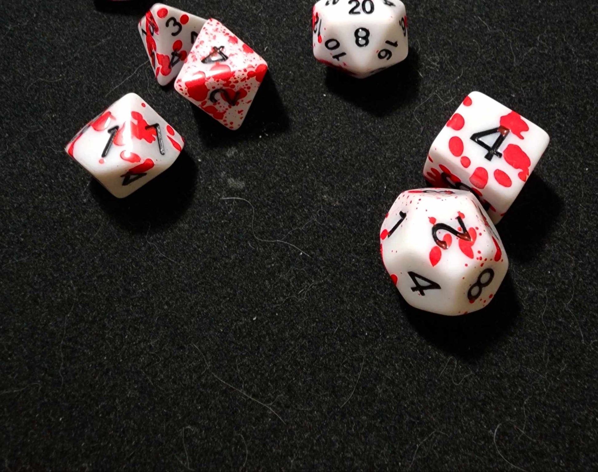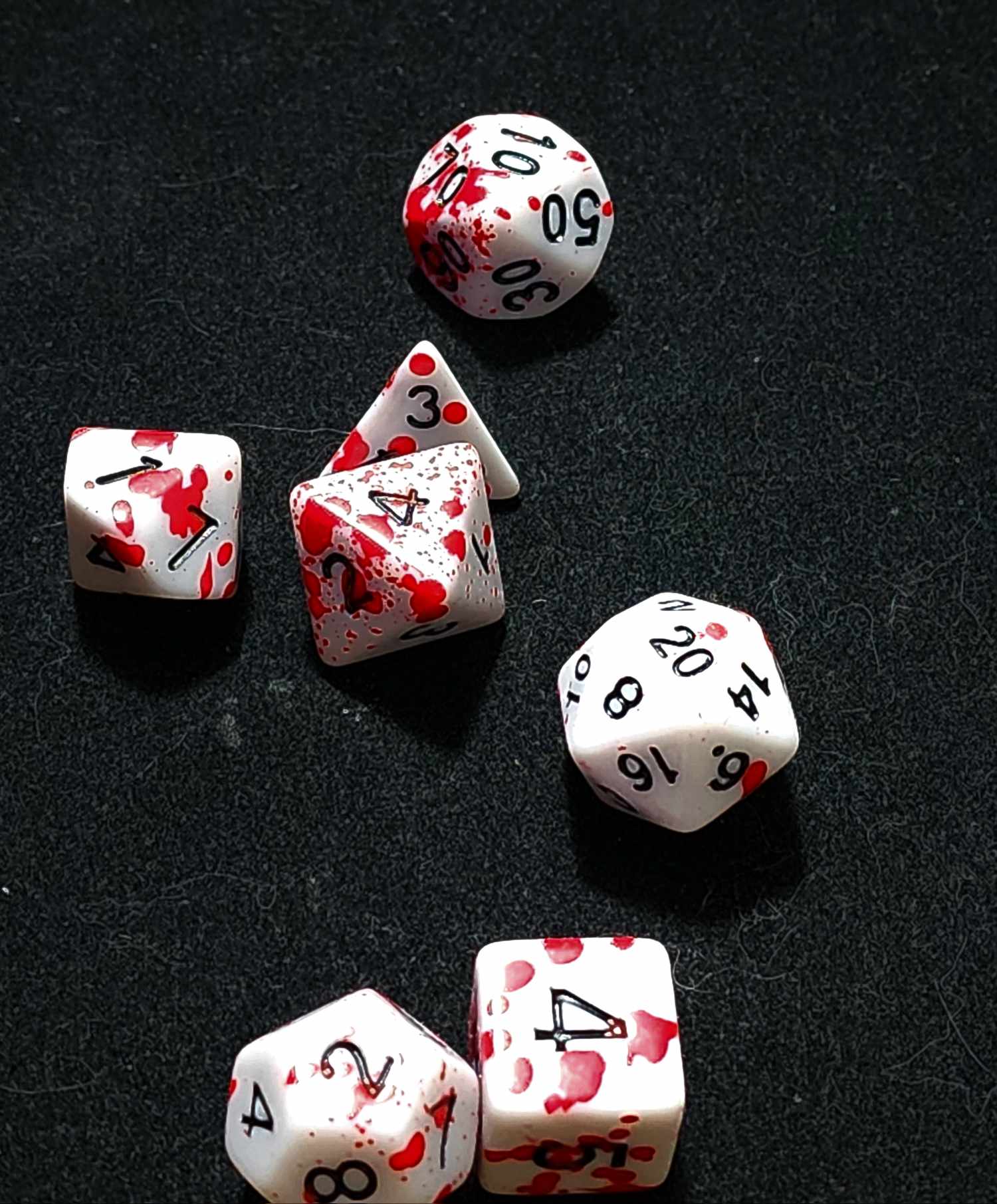 A 7 piece set of white polyhederal dice with red spatter that will