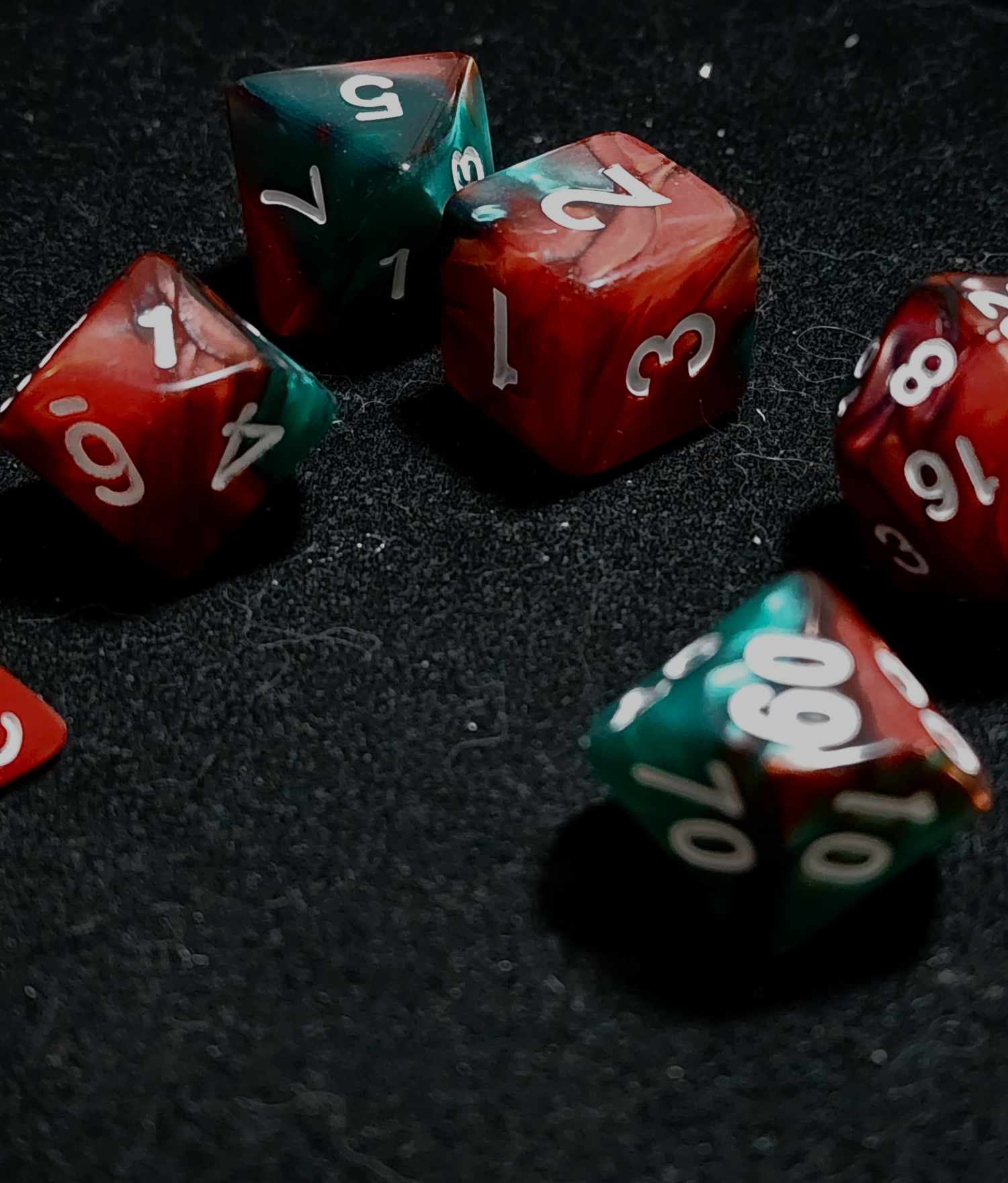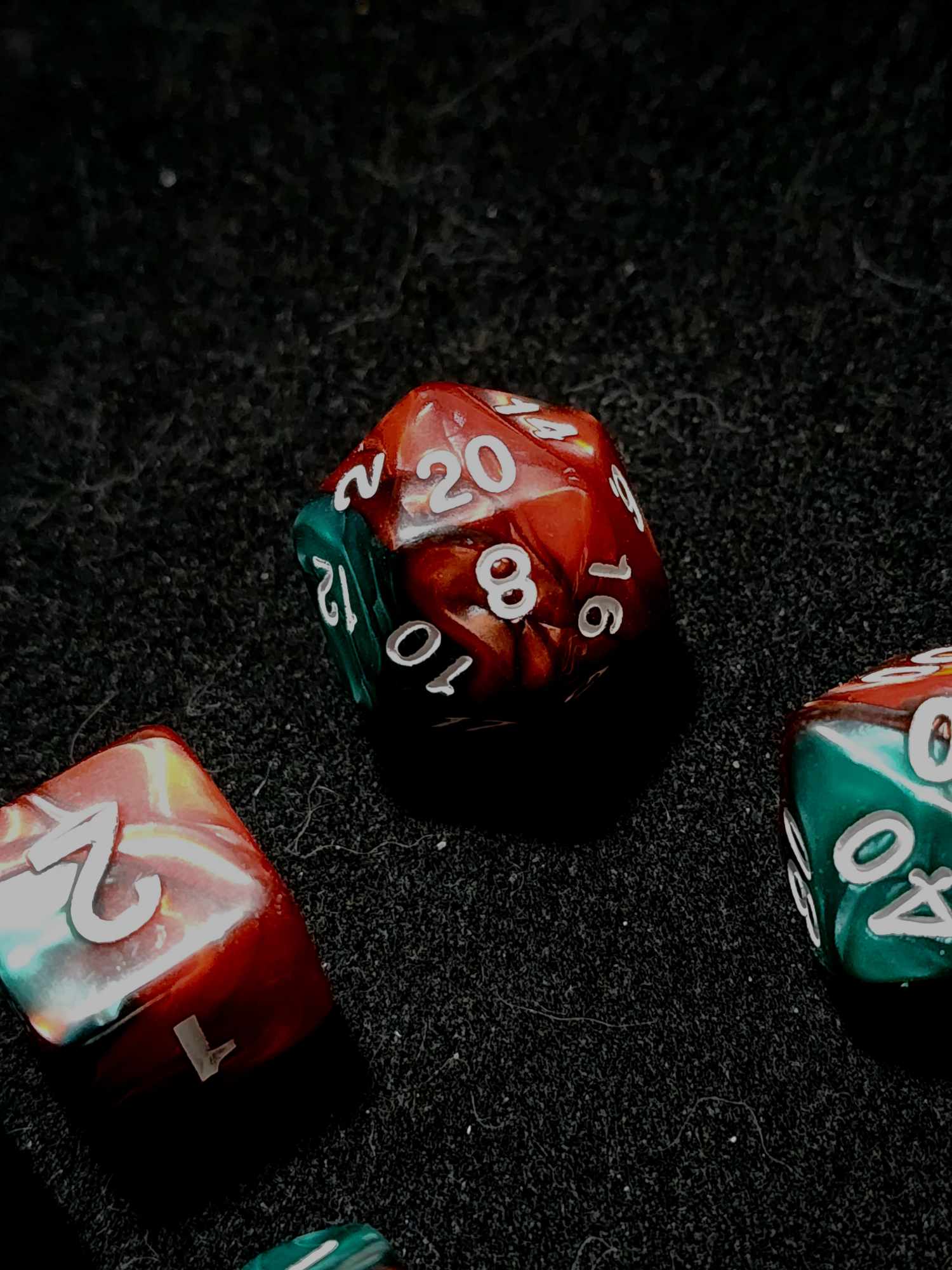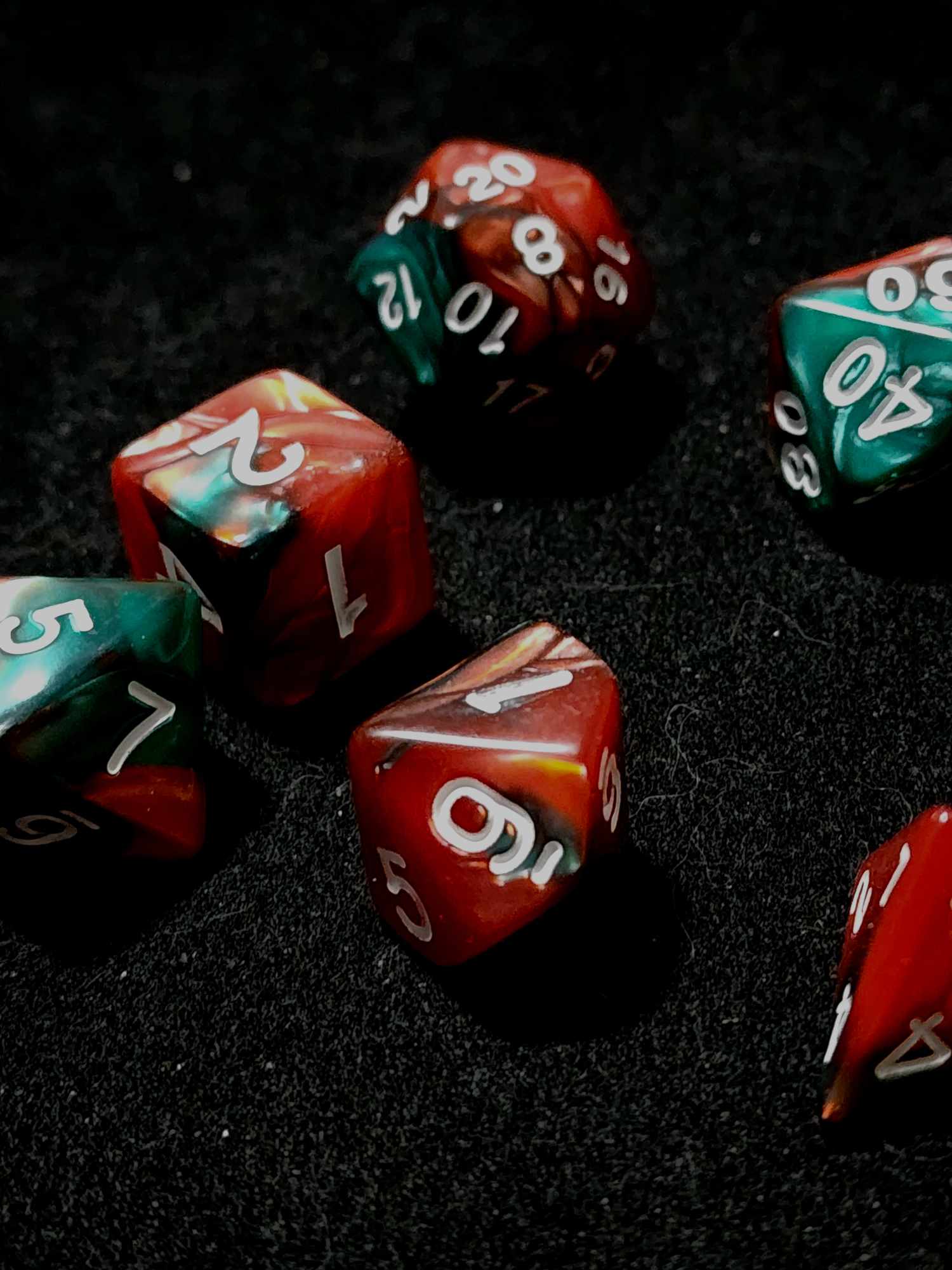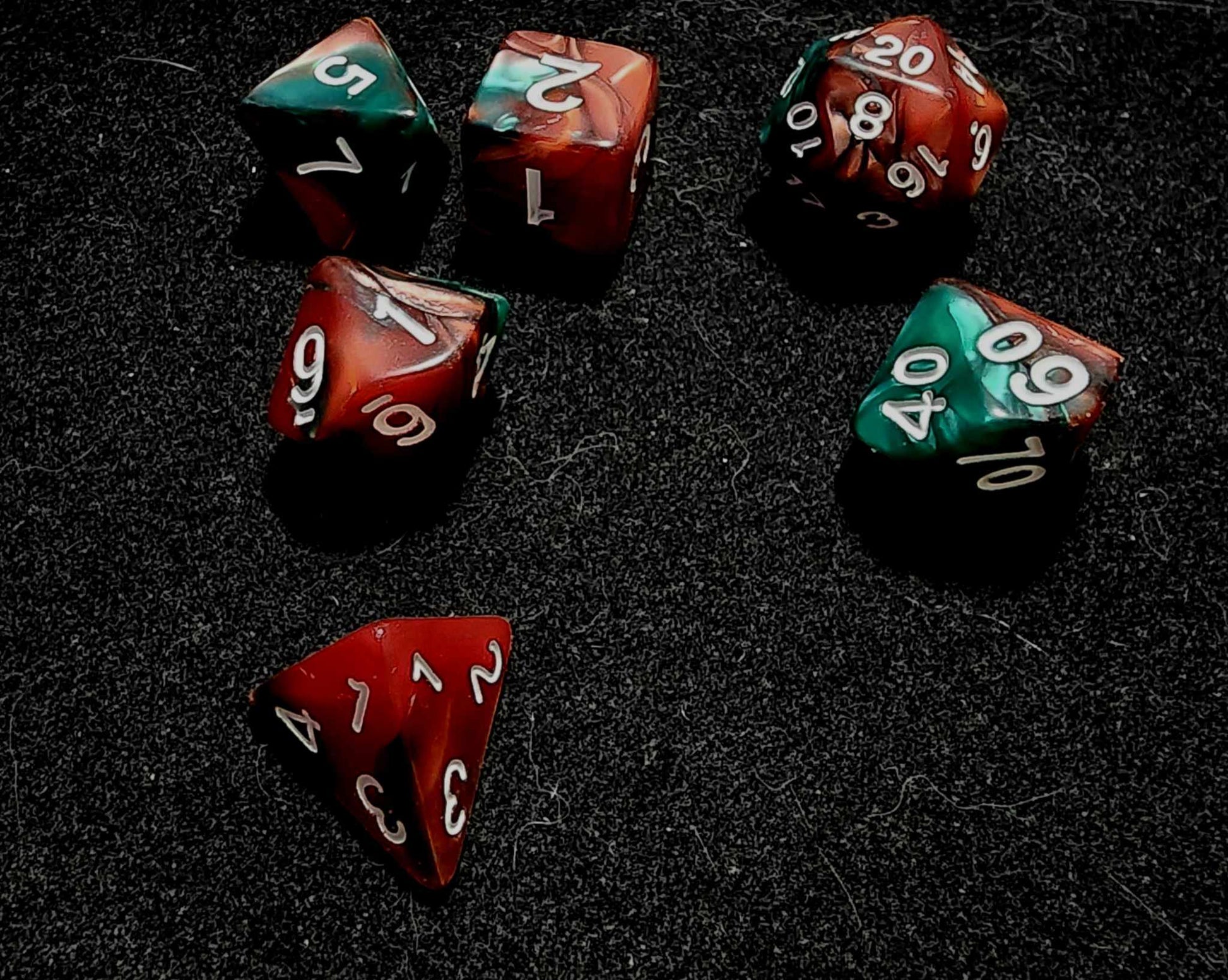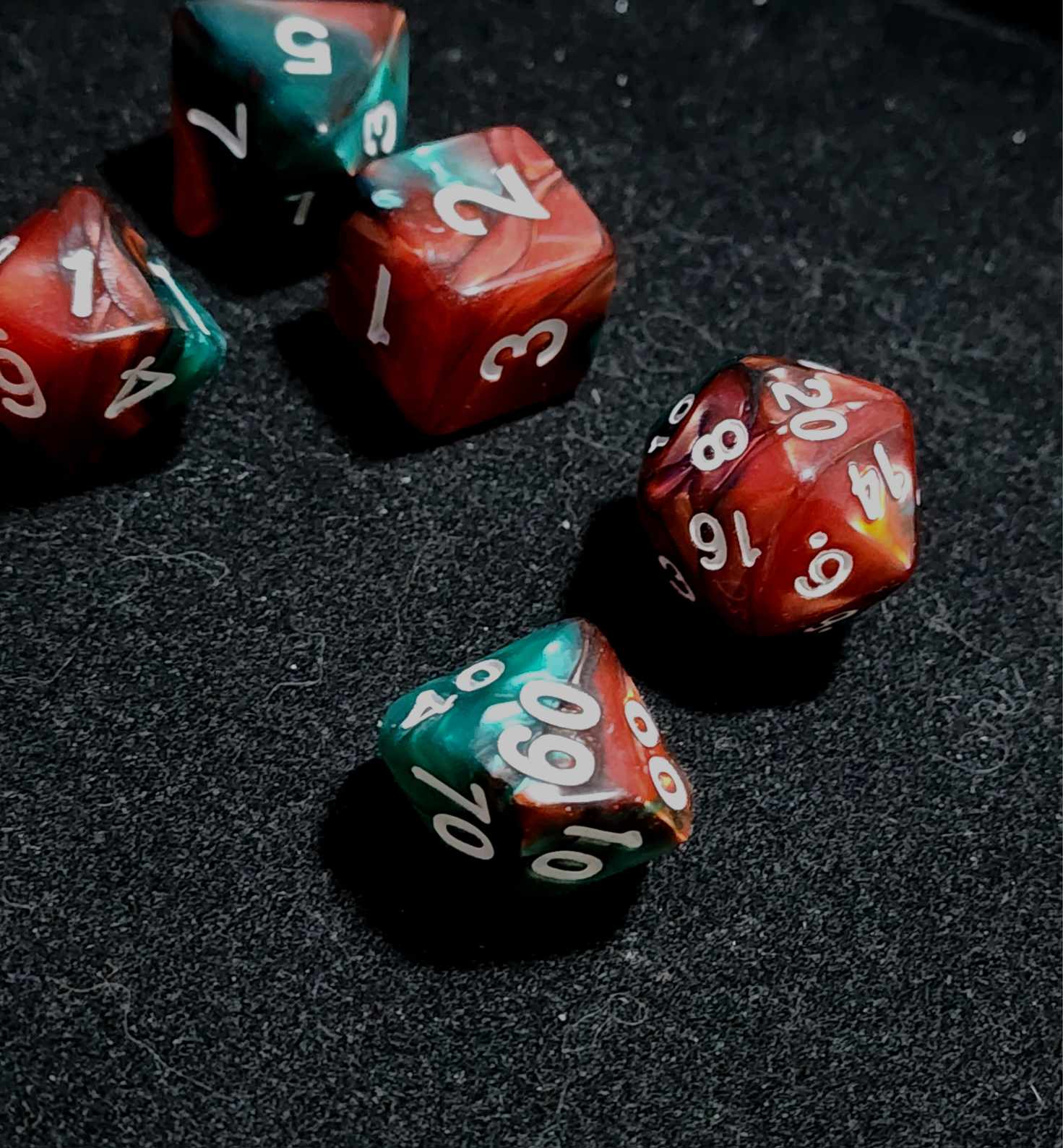 A 7 piece set of orange and green polyhederal dice that will provide lots of unforseen twists and turns.