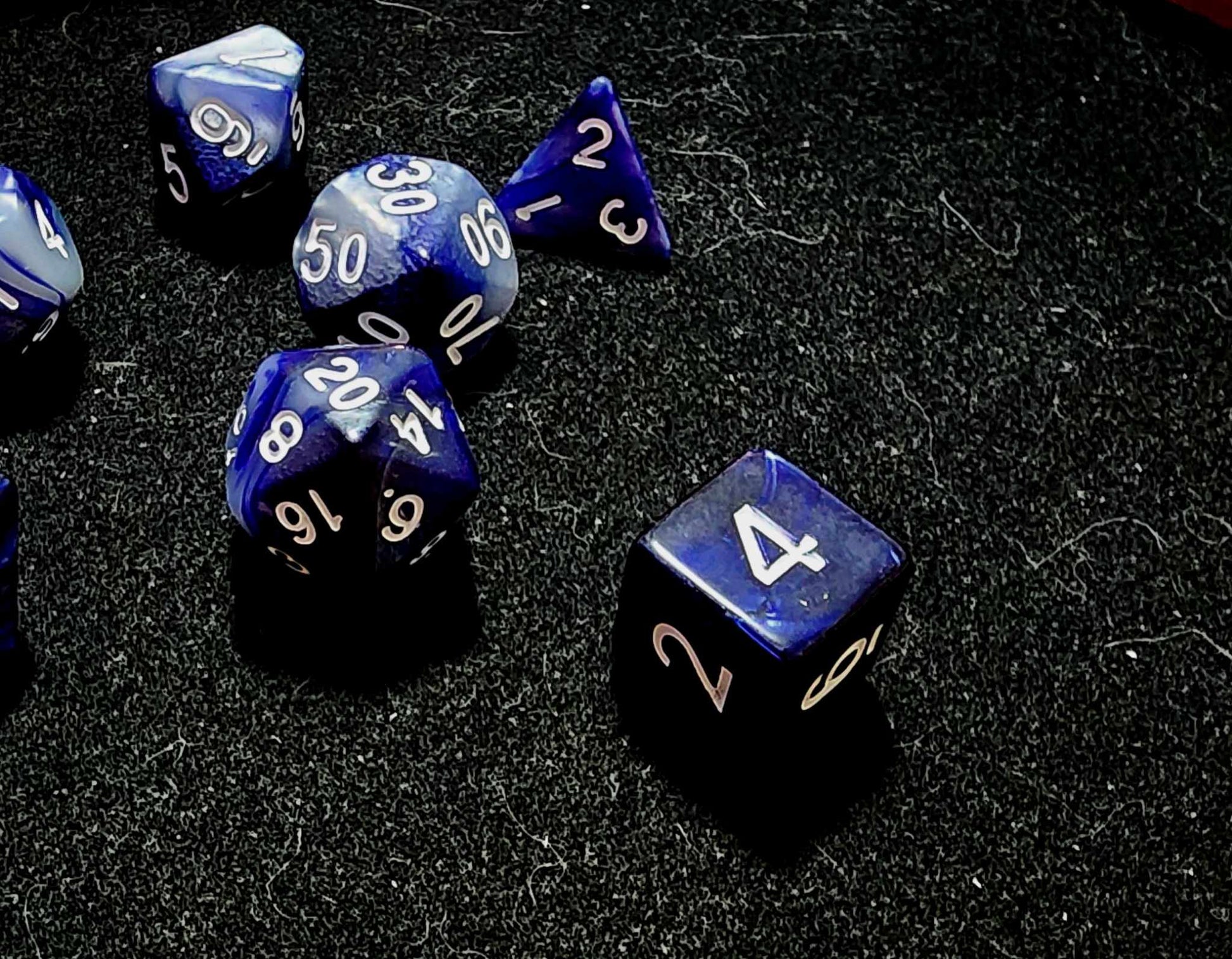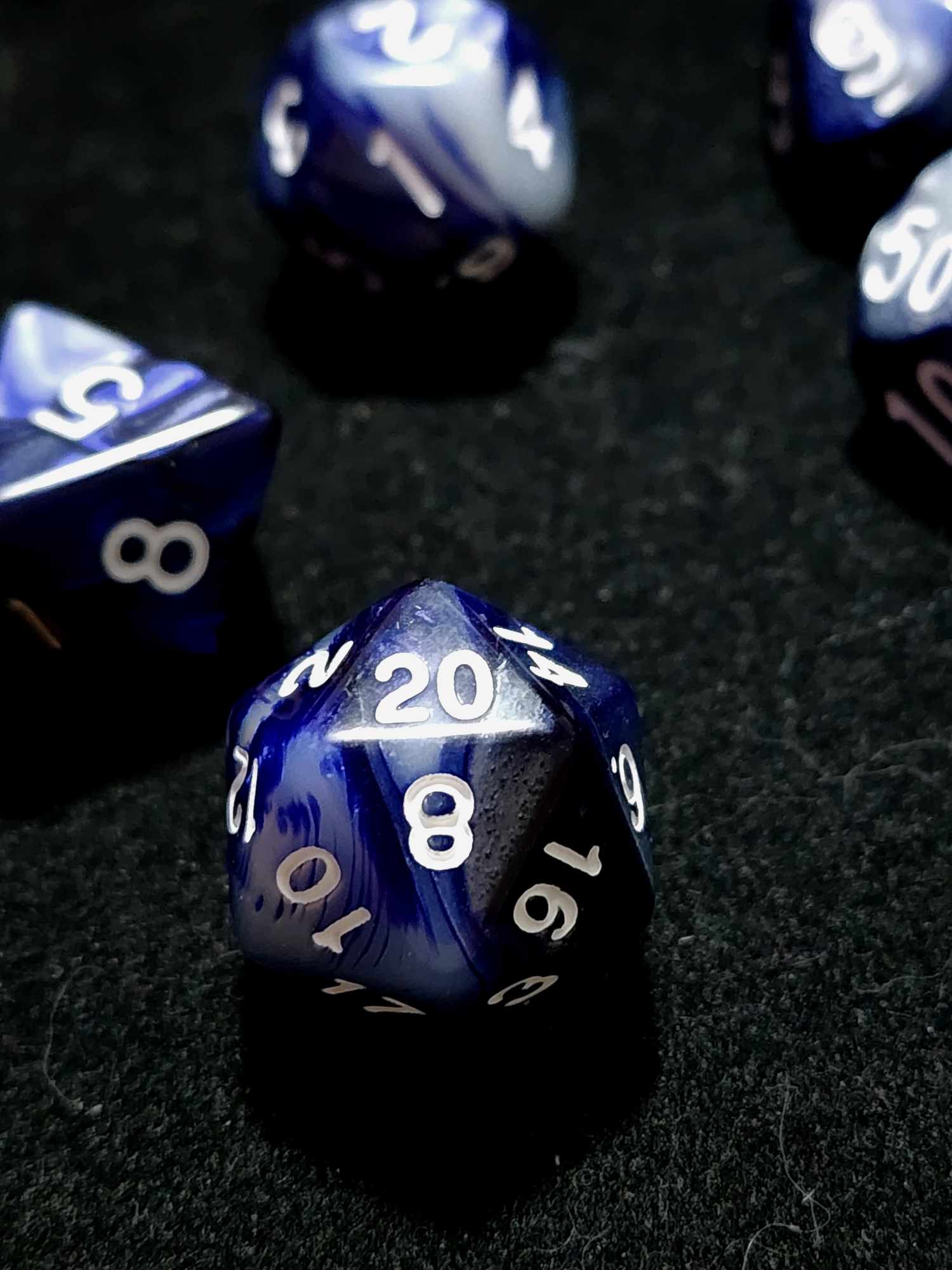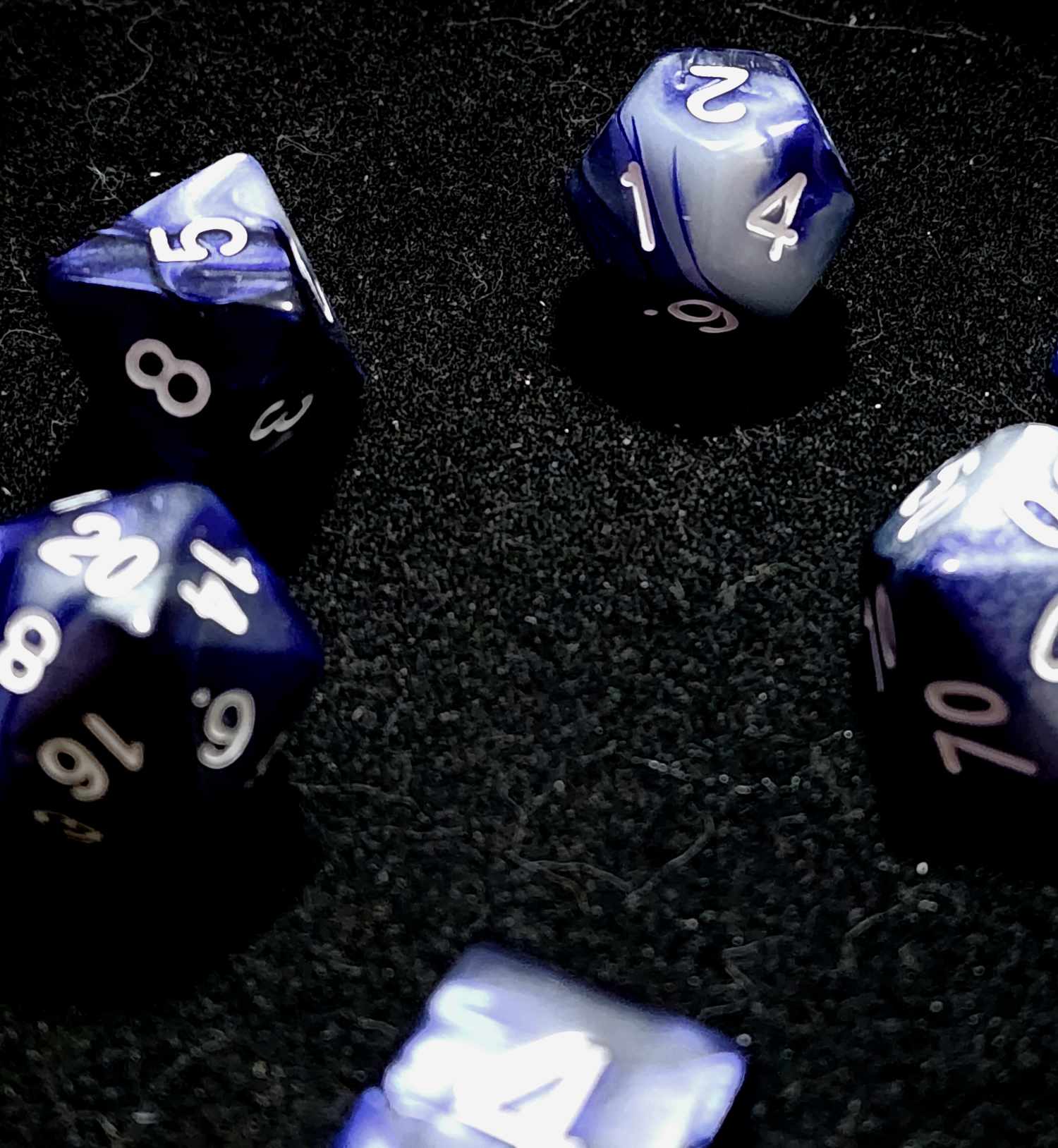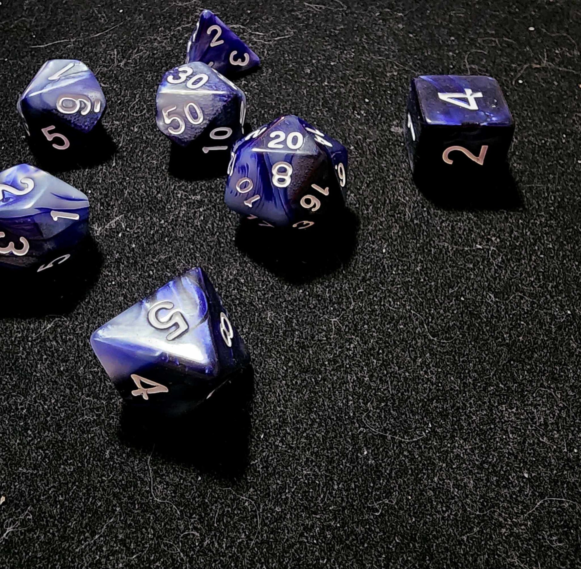 A 7 piece set of purple and silver polyhederal dice set that will definitely go rogue,