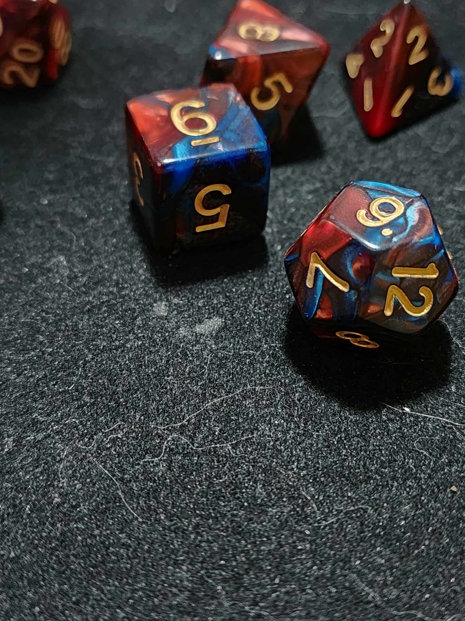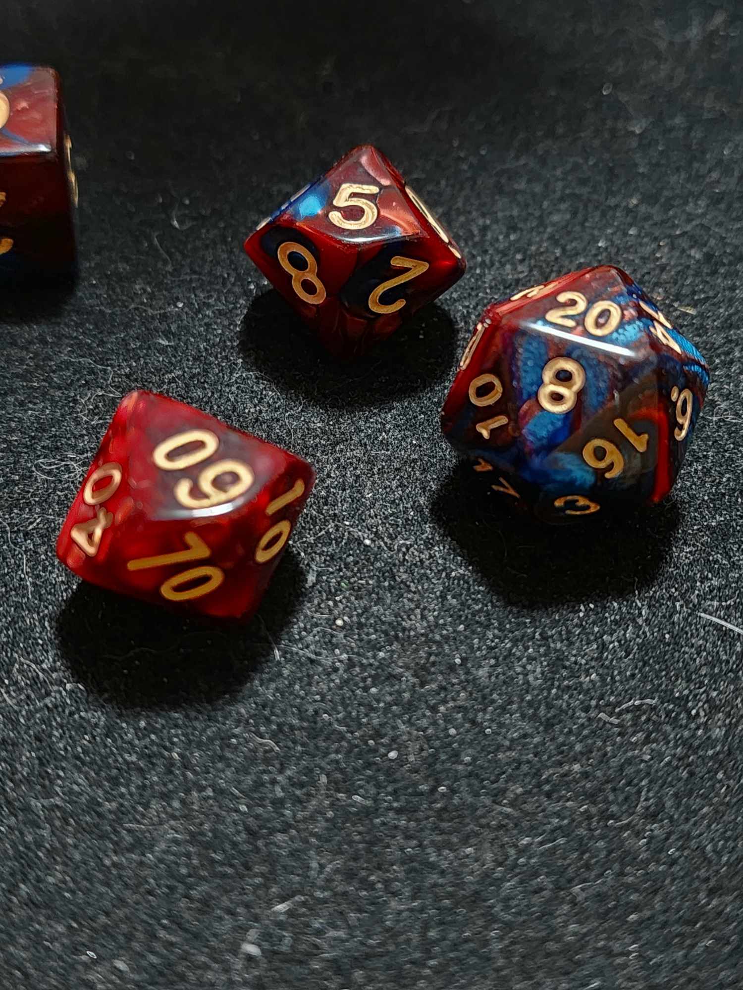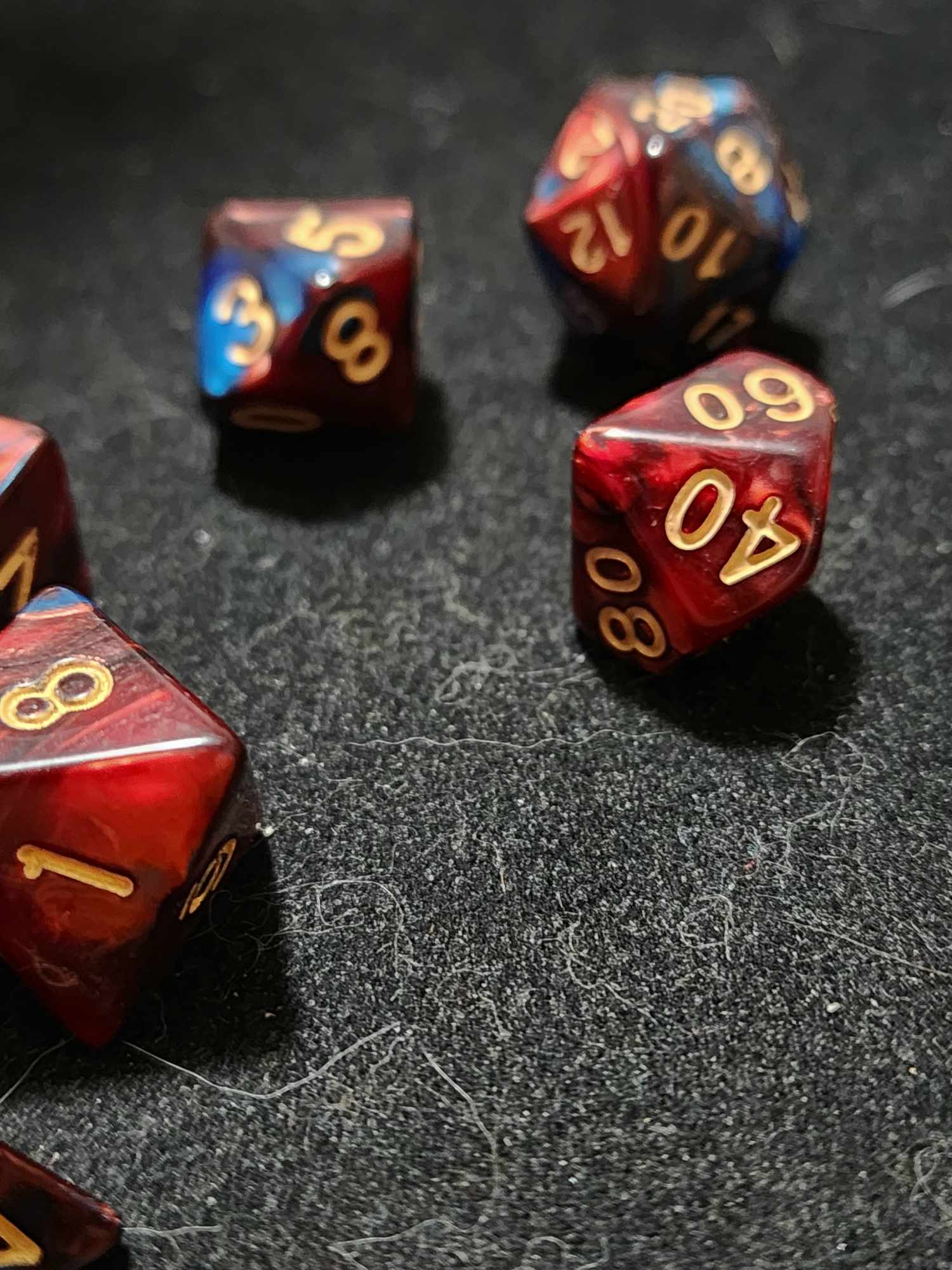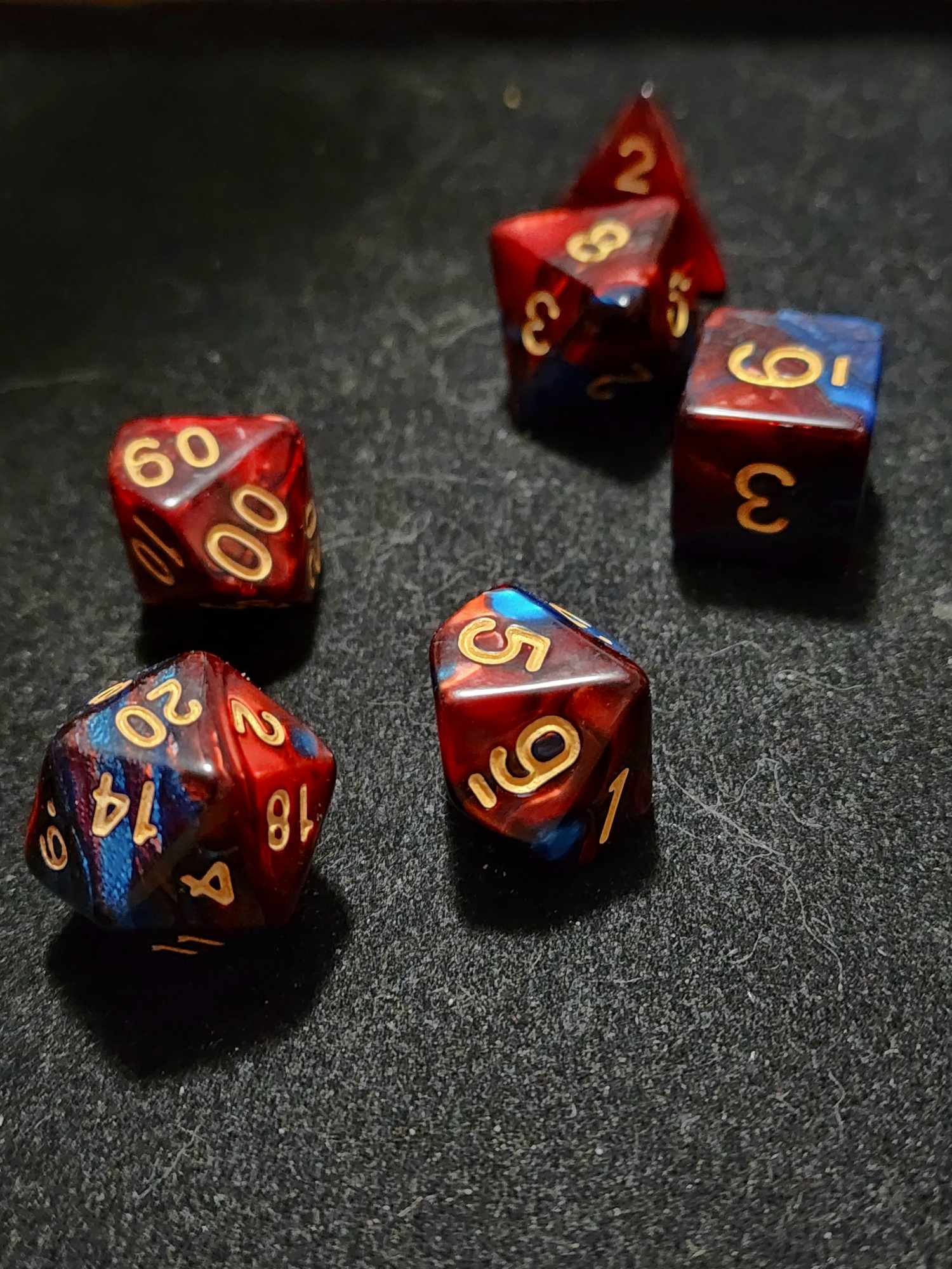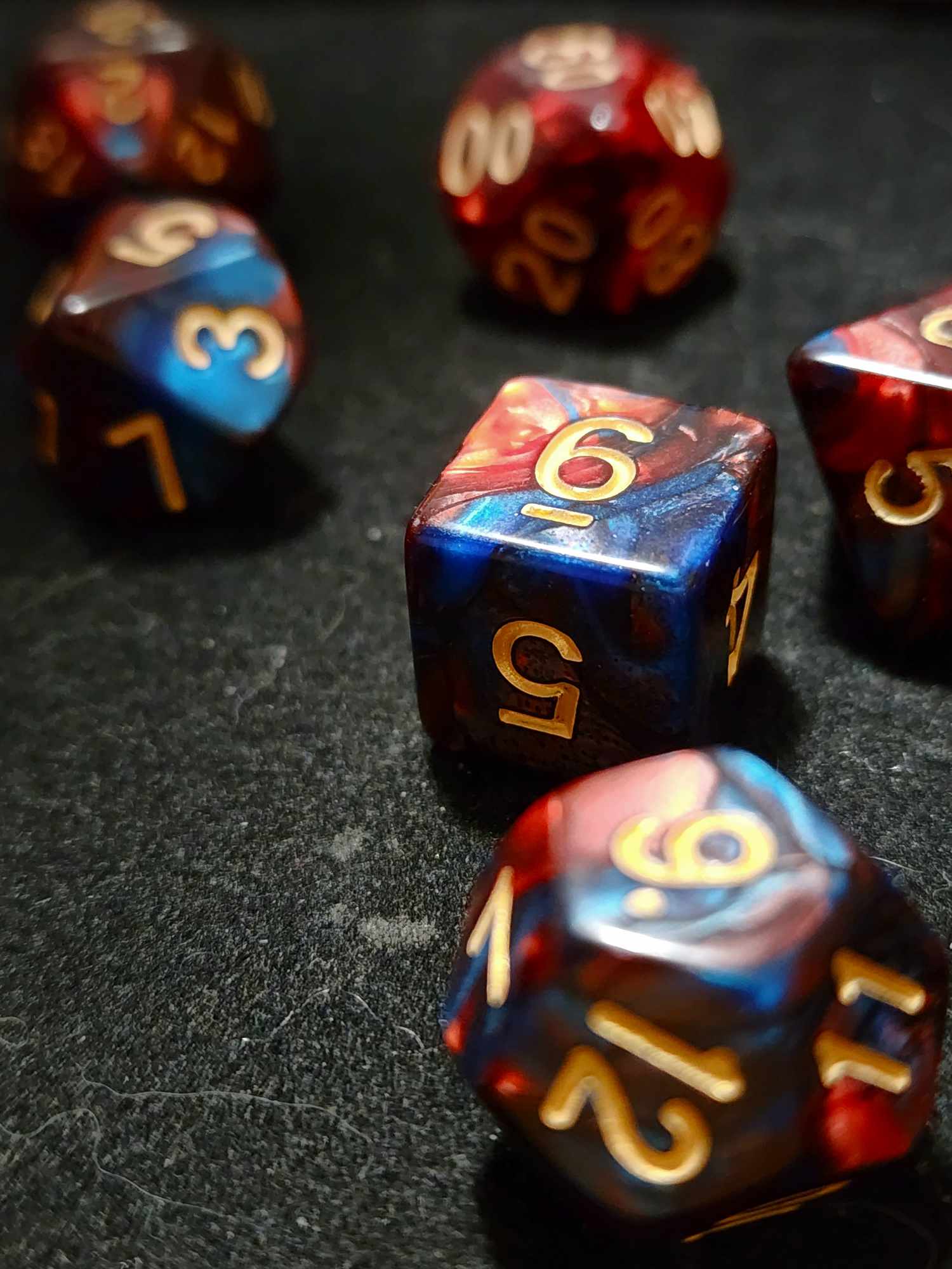 A 7 piece set of red and blue polyhederal dice that will have you playing into the wee hours of the morning.
