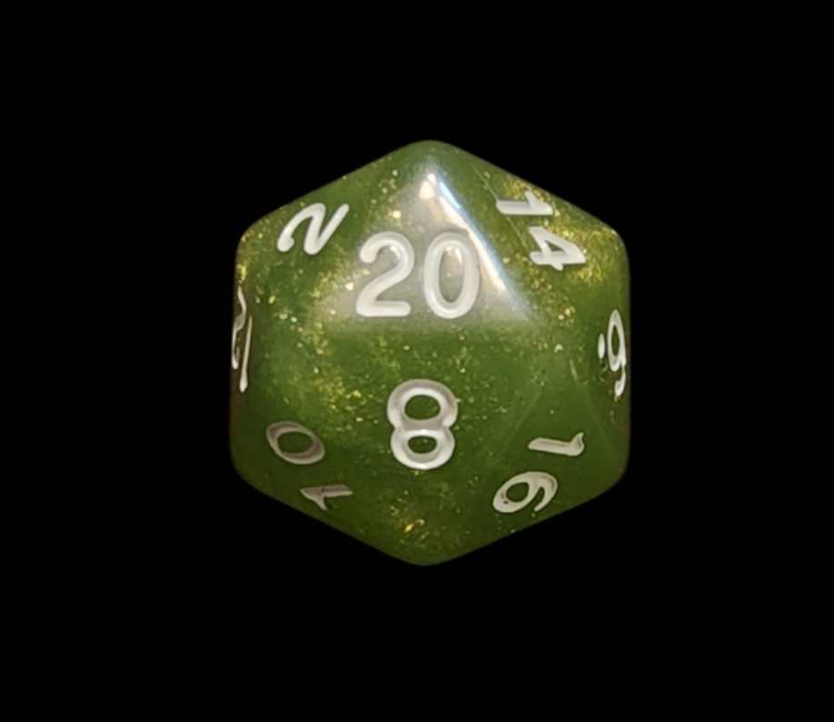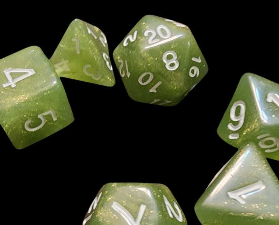 A 7 piece set of green polyhederal dice with yellow glitter that will leave you ready for war.