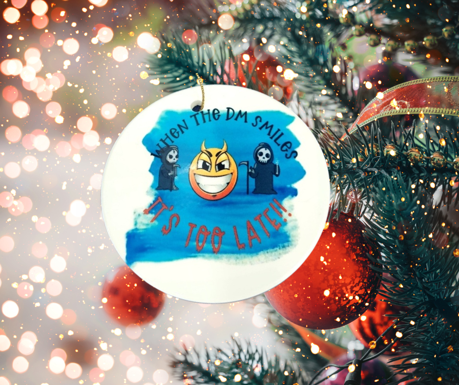 Make your DM's smile even bigger this holiday season with the When the DM Smiles ceramic Christmas ornament. This ceramic ornament is sure to bring some fun and humor to their tabletop adventures. Give the gift of laughter to your favorite DM (or keep it for yourself!).